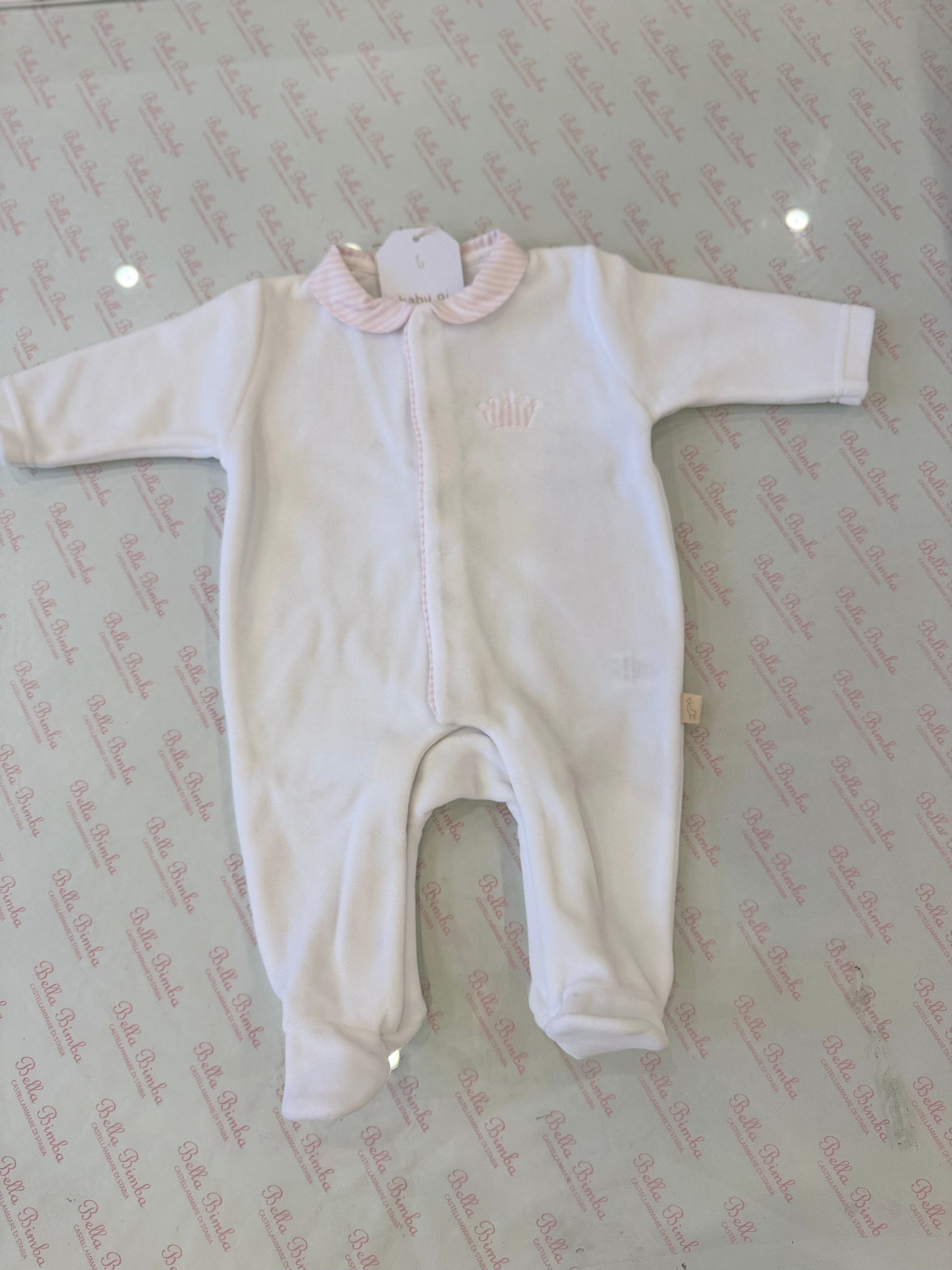 Questa tutina in ciniglia bianca, con collo rosa a righe e coroncina sul corpetto, è perfetta per proteggere la pelle delicata della tua piccola . Realizzata con materiali morbidi e confortevoli, è ideale per coccolare la tua principessa e mantenerla alla moda. Con un design carino e ricco di dettagli, questa tutina non solo è pratica ma anche adorabile.