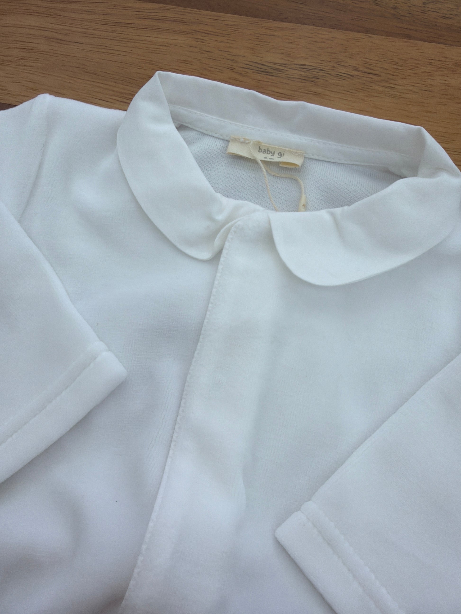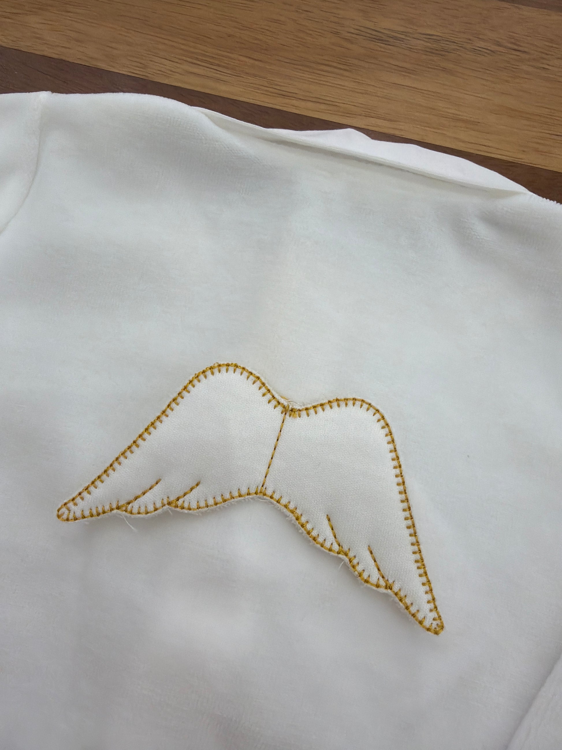 Tutina in ciniglia color panna, dotata di piedini e chiusura frontale. Presenta un colletto e ali decorative bianche sul retro, impreziosite da un ricamo dorato.