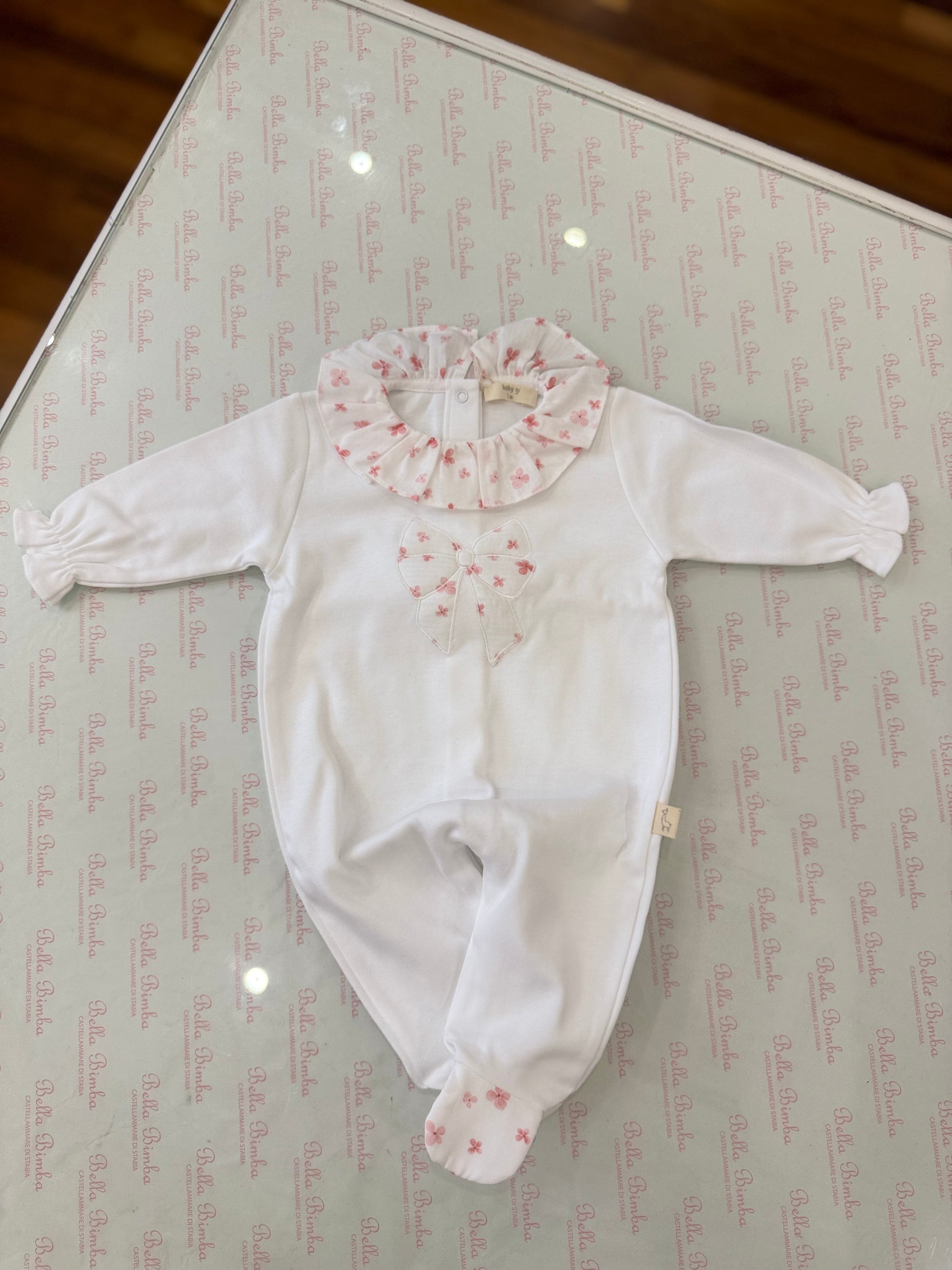 Porta il comfort e lo stile alla tua piccola principessa con questa deliziosa tutina baby gi. Realizzata in morbido cotone con piedini e un grazioso collo rouche e fiocco centrale stampa floreale. Ideale per le giornate divertenti e i sonnellini serali.