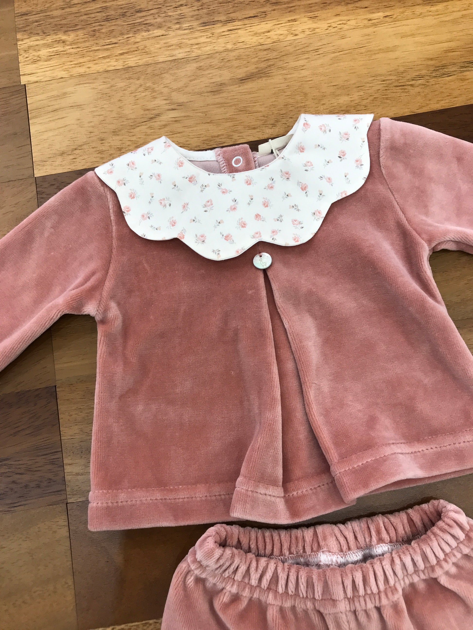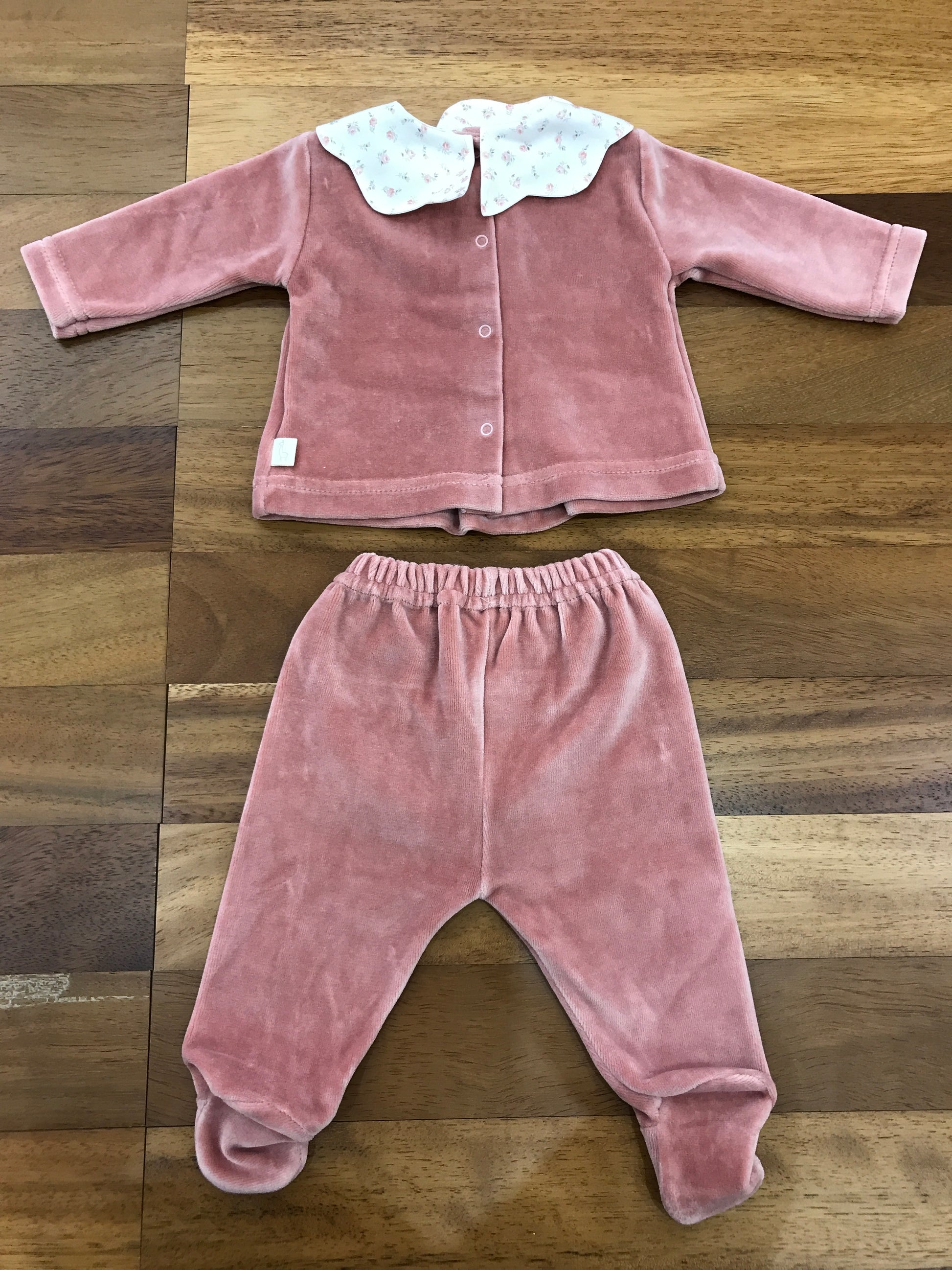 Questo completo due pezzi in ciniglia per neonati è dotato di piedini integrati e presenta un collo decorato con delicati fiorellini, unendo comfort e stile raffinato per i più piccoli.