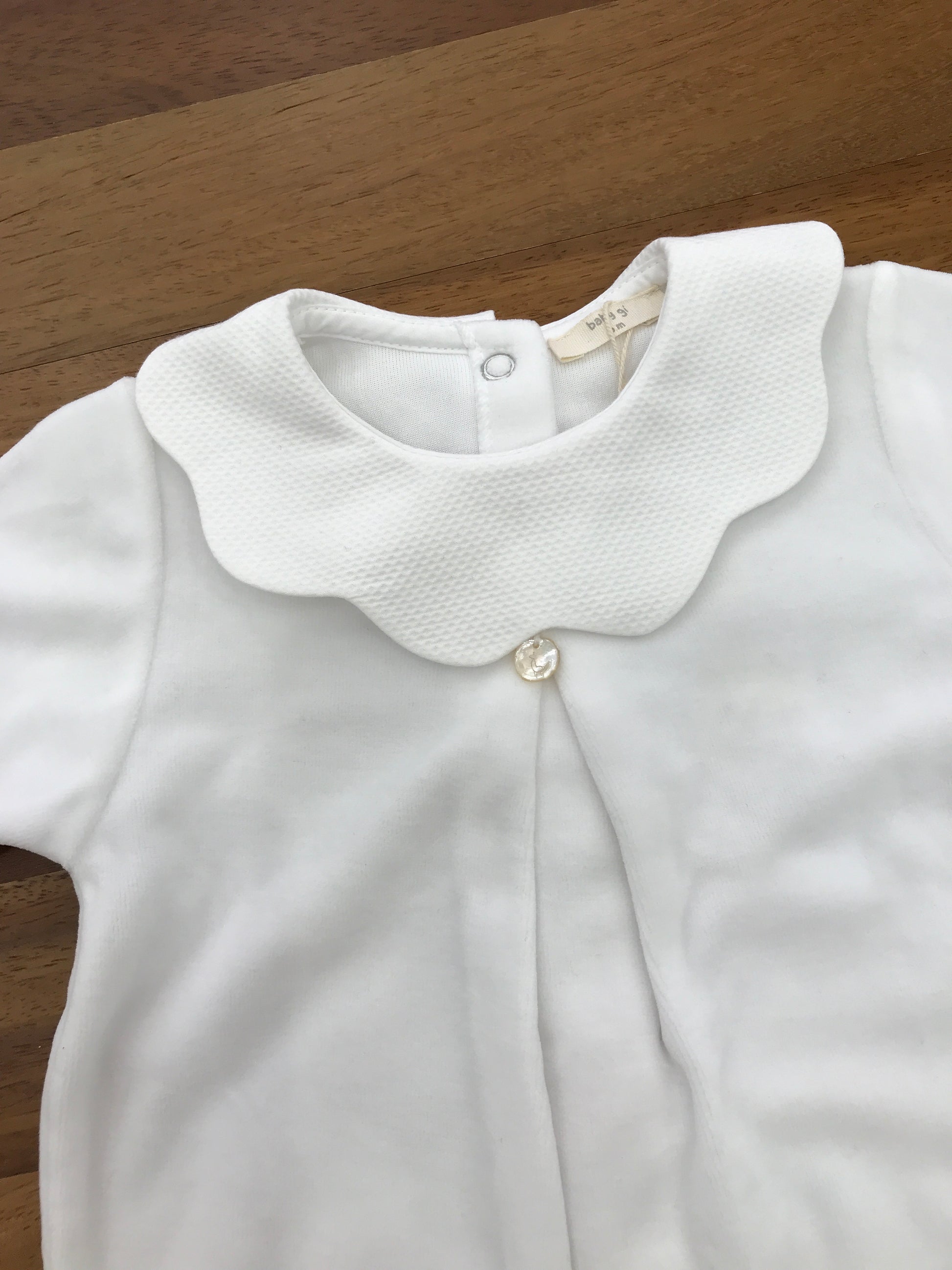 Intera tutina in ciniglia, completa di piedini e caratterizzata da un elegante colletto bianco.