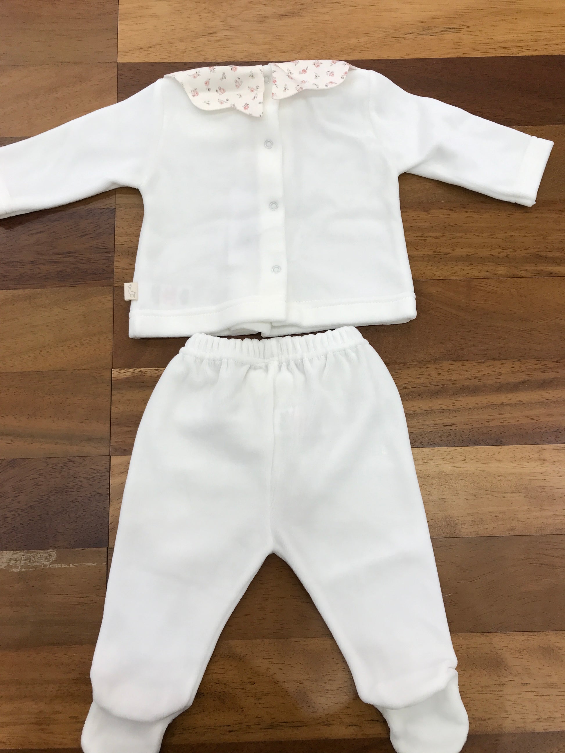 Completo due pezzi in ciniglia, con piedini coperti nella parte inferiore e una parte superiore decorata da un colletto rosa chiaro impreziosito da delicati fiorellini.
