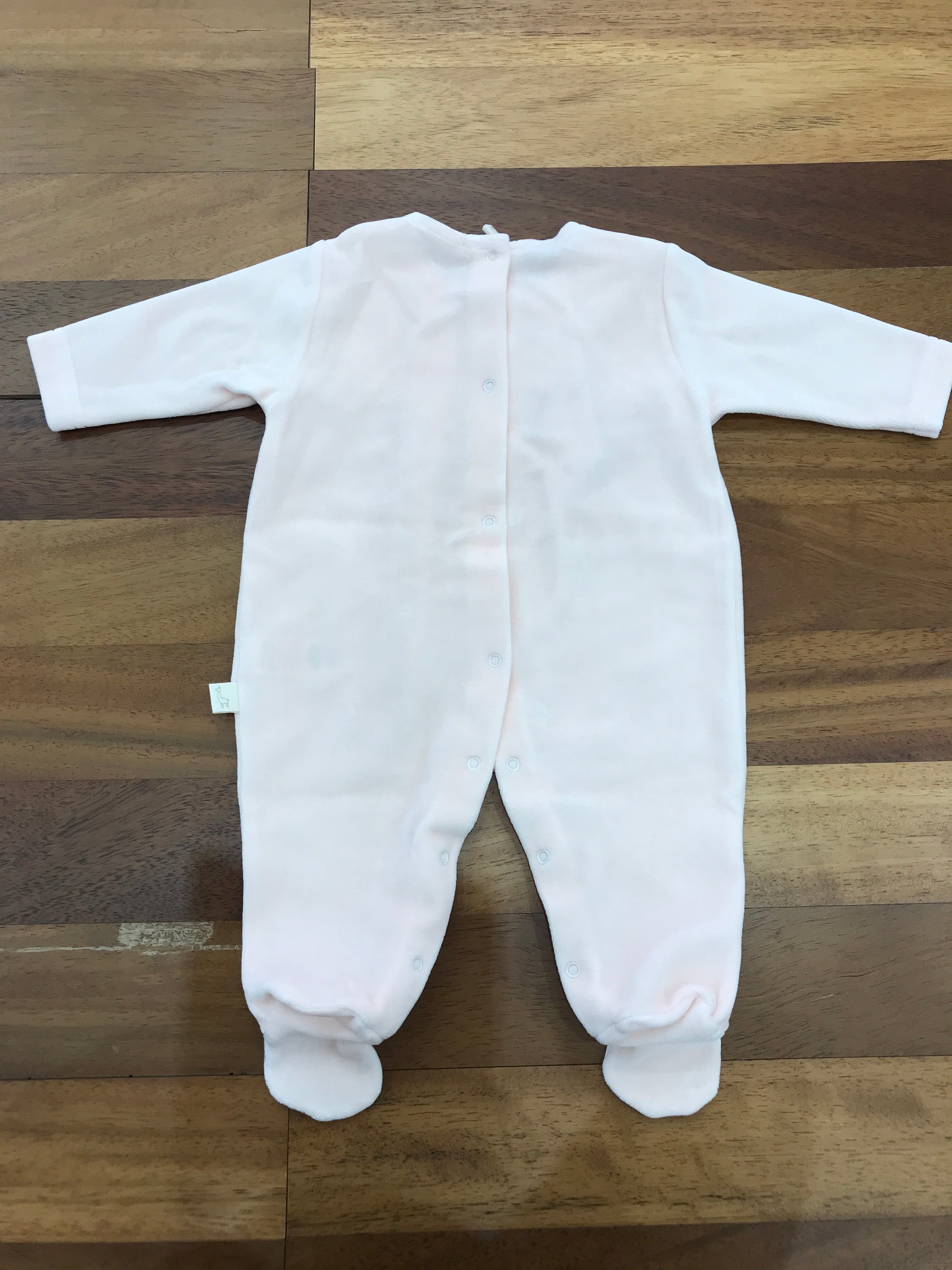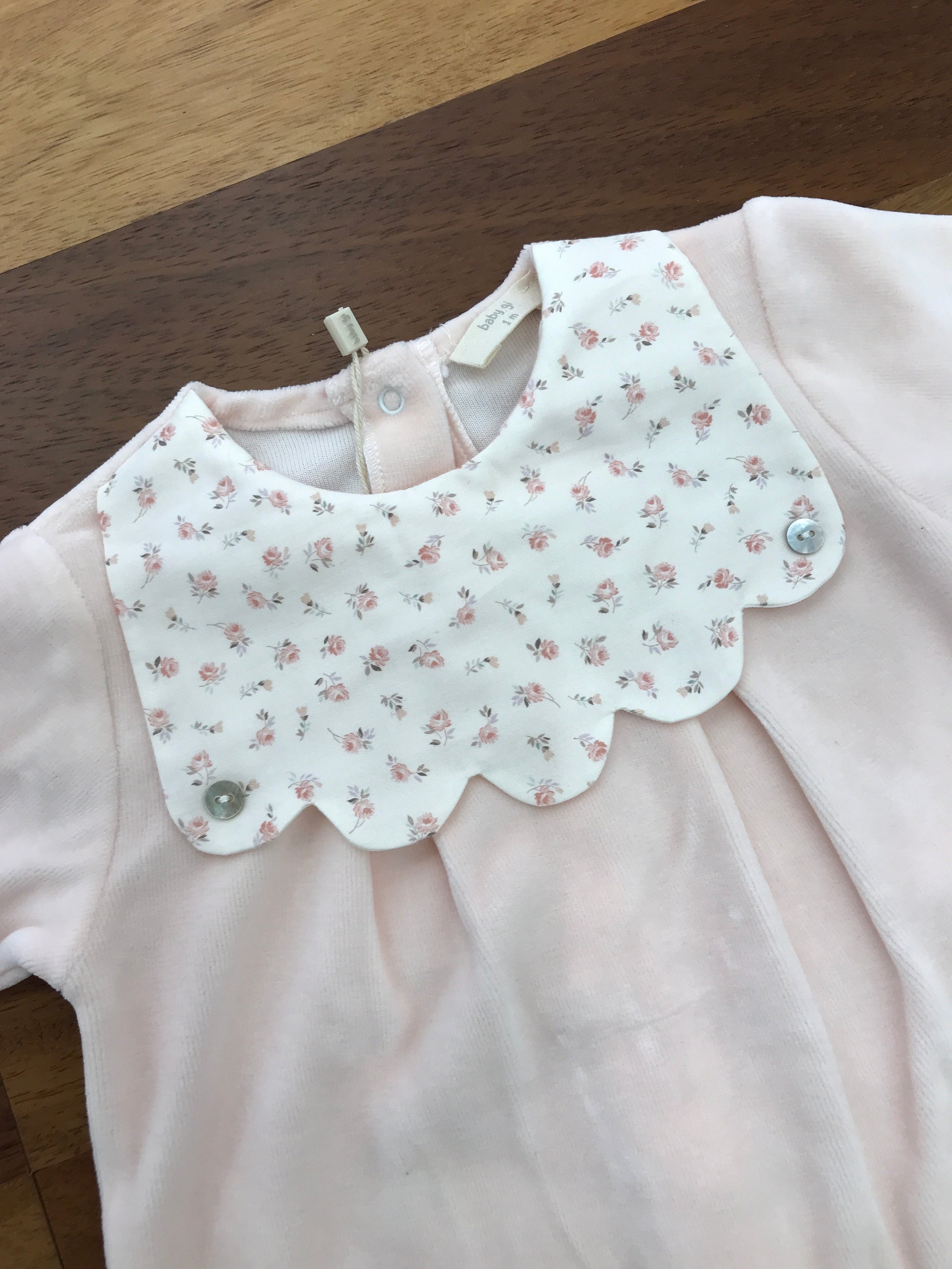 Questa tutina intera in ciniglia rosa è progettata per garantire comfort e calore al neonato. Presenta un bavettone integrato, completamente decorato con un delicato motivo di fiorellini, che aggiunge un tocco di eleganza e protezione. Dotata di piedini incorporati, assicura una copertura completa e una vestibilità perfetta per i più piccoli.