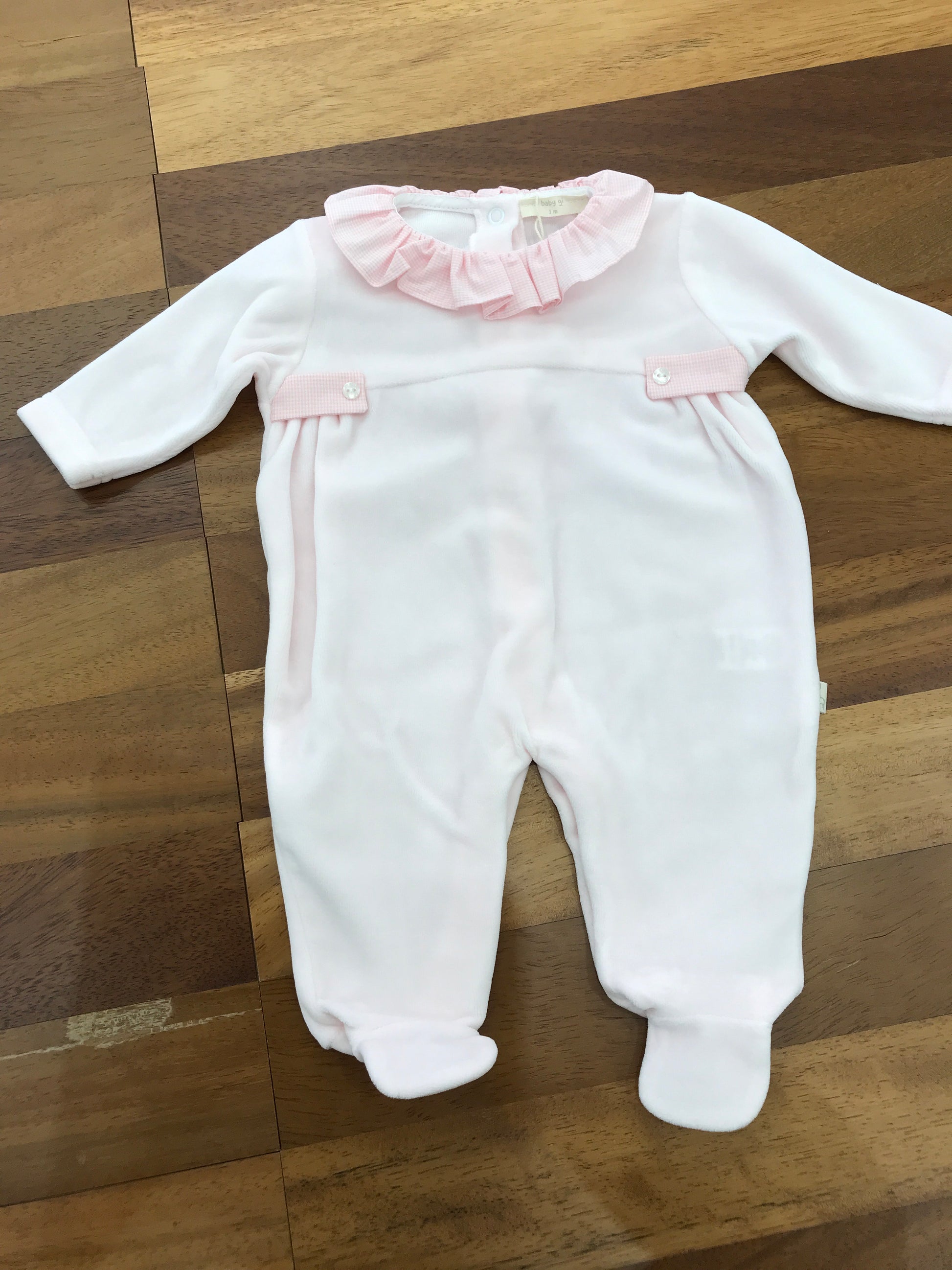 Questa tutina per neonati è realizzata in morbida ciniglia, garantendo comfort e calore. Presenta piedini integrati per mantenere i piedini del bambino sempre protetti e un elegante colletto arricciato che aggiunge un tocco raffinato. Sul lato, sono applicati due piccoli decori a forma di quadratini rosa, che donano un dettaglio delicato e distintivo al capo. Ideale per chi cerca un capo pratico ma curato nei particolari.
