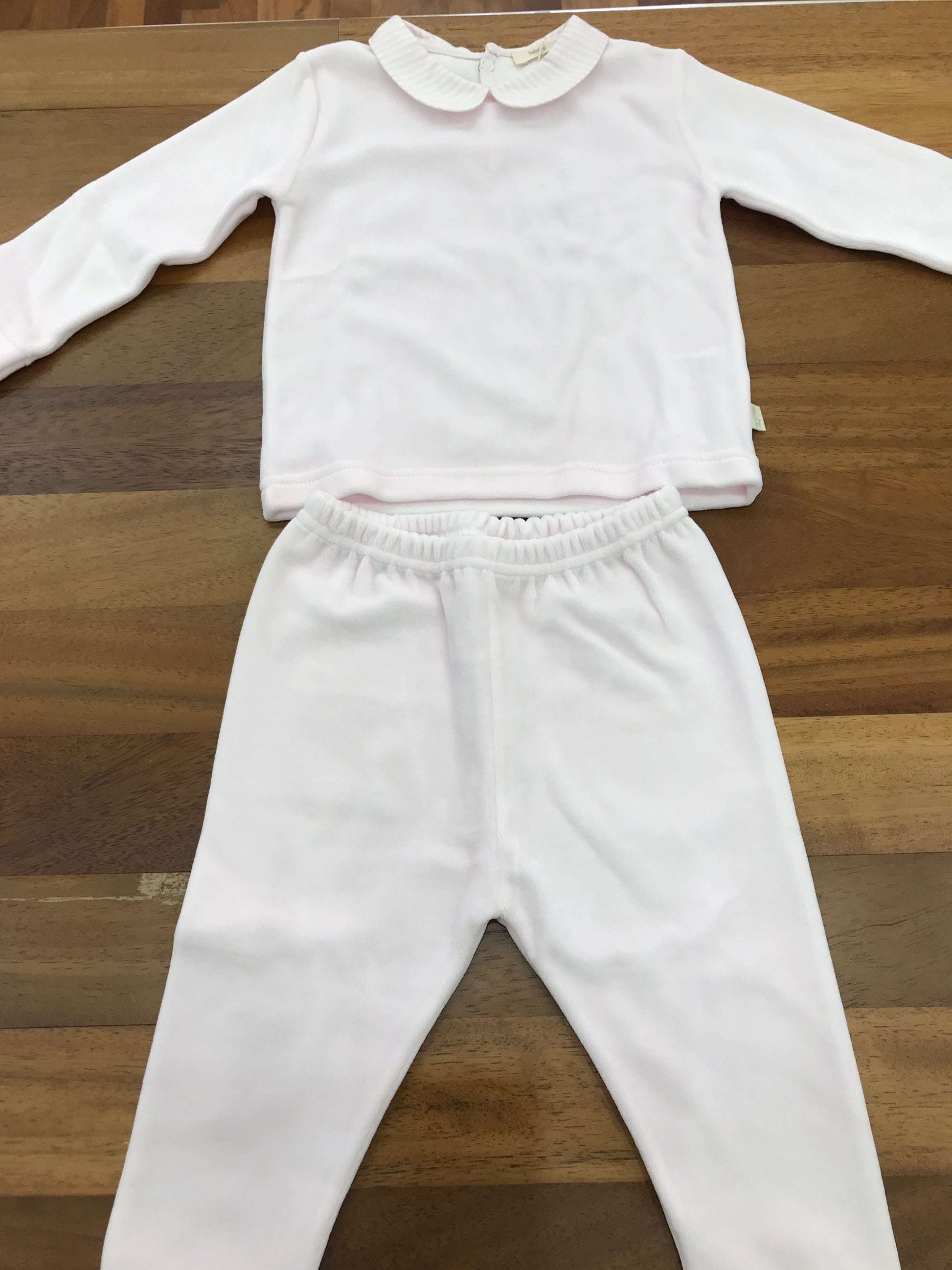 Completo in ciniglia essenziale per neonati, con colletto a righe bianche e rosa.