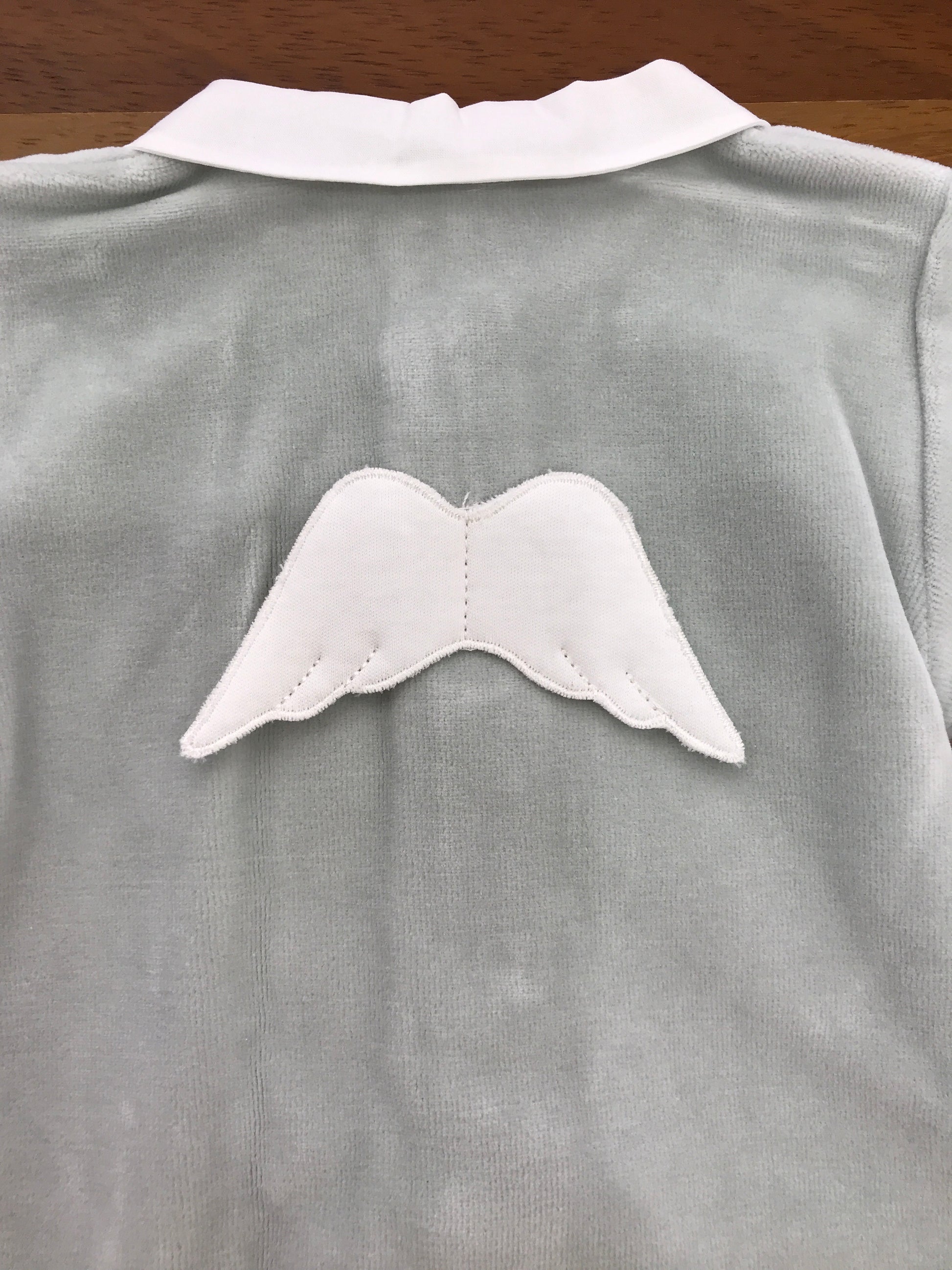 La tutina intera baby gj in ciniglia presenta piedini e collo, arricchita da un raffinato dettaglio a forma di ali sul retro.