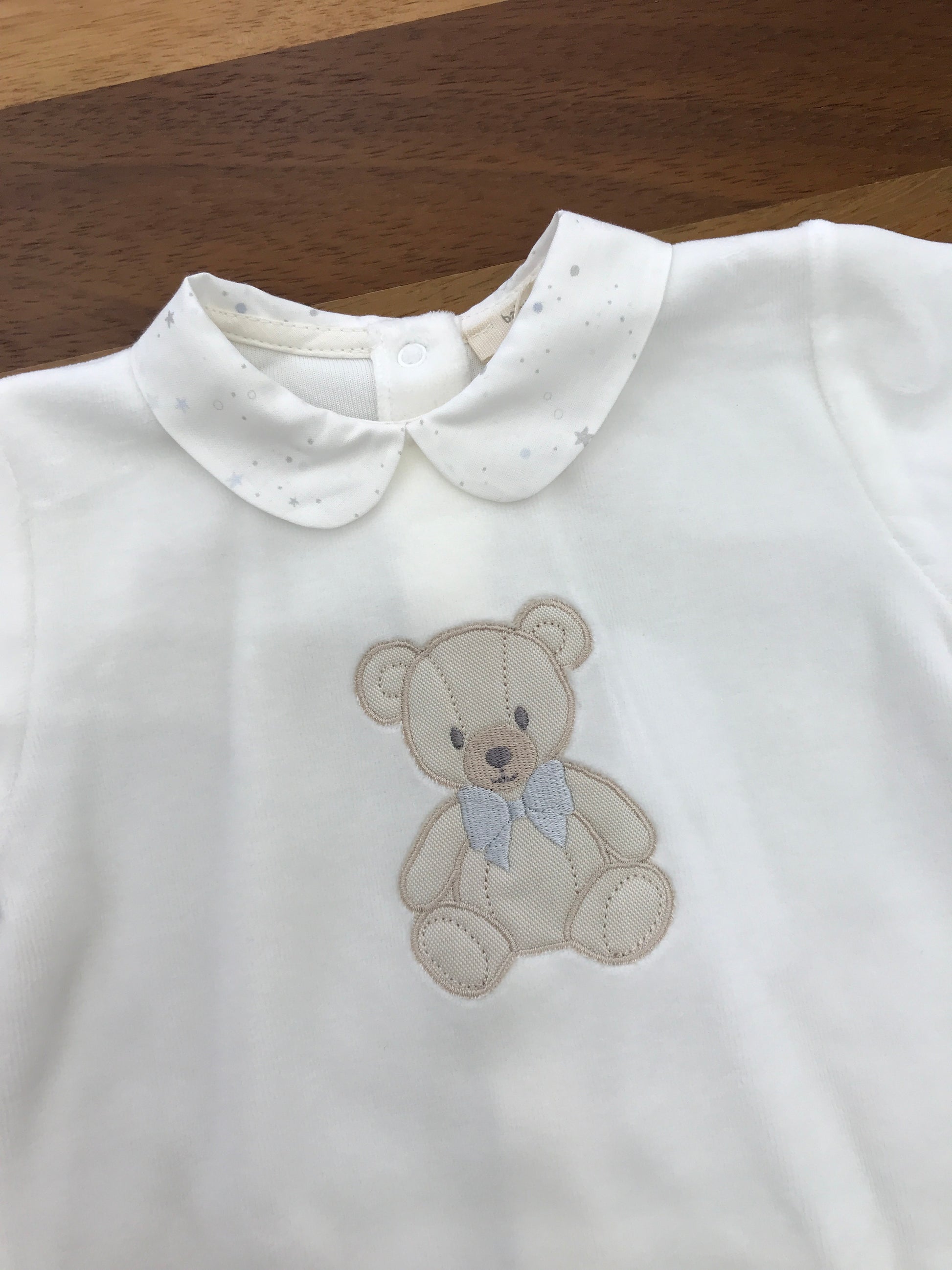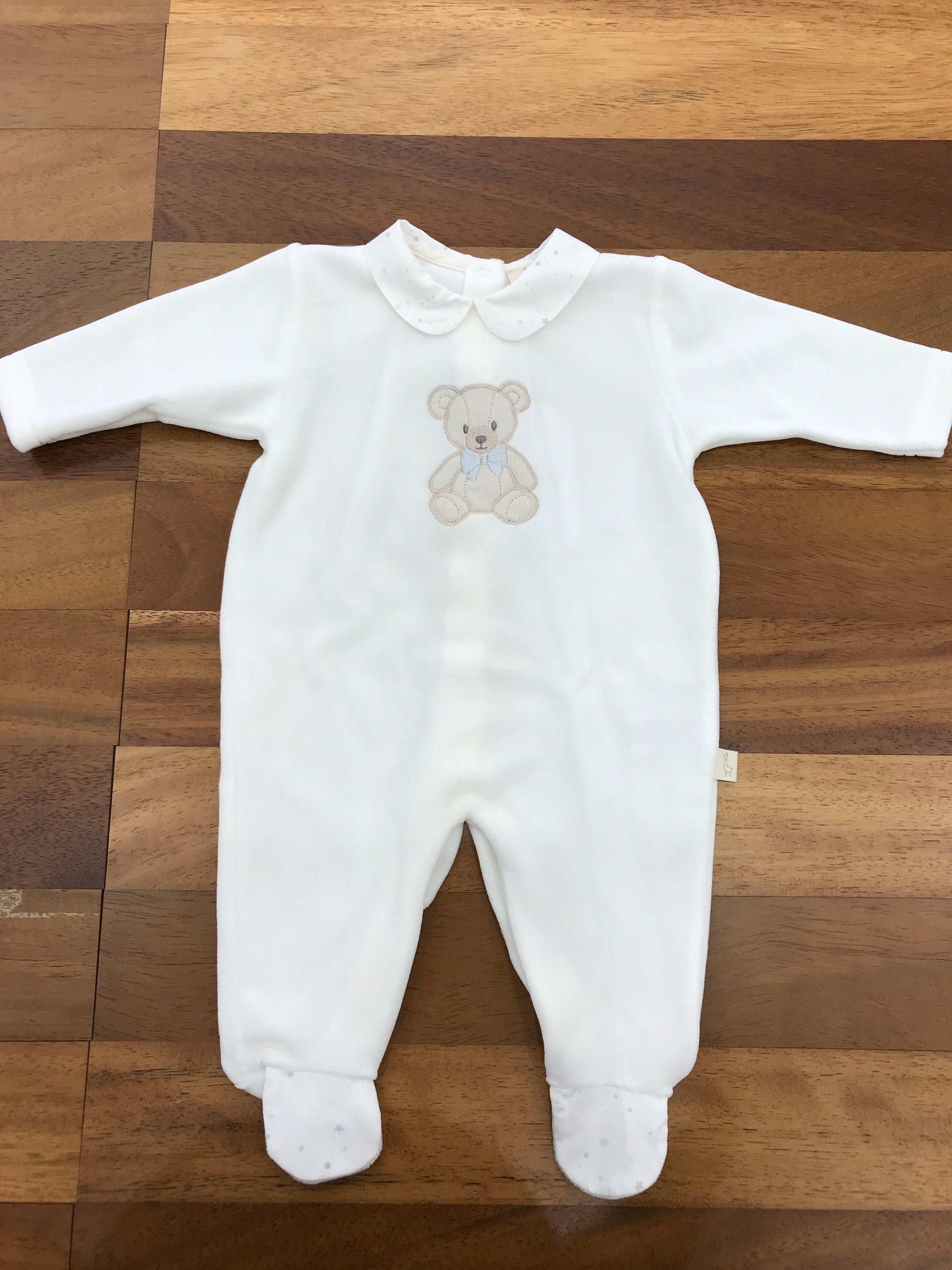 Questa tutina intera in ciniglia è dotata di un colletto decorativo e piedini integrati, arricchita da un orsetto applicato sul davanti come elemento decorativo.