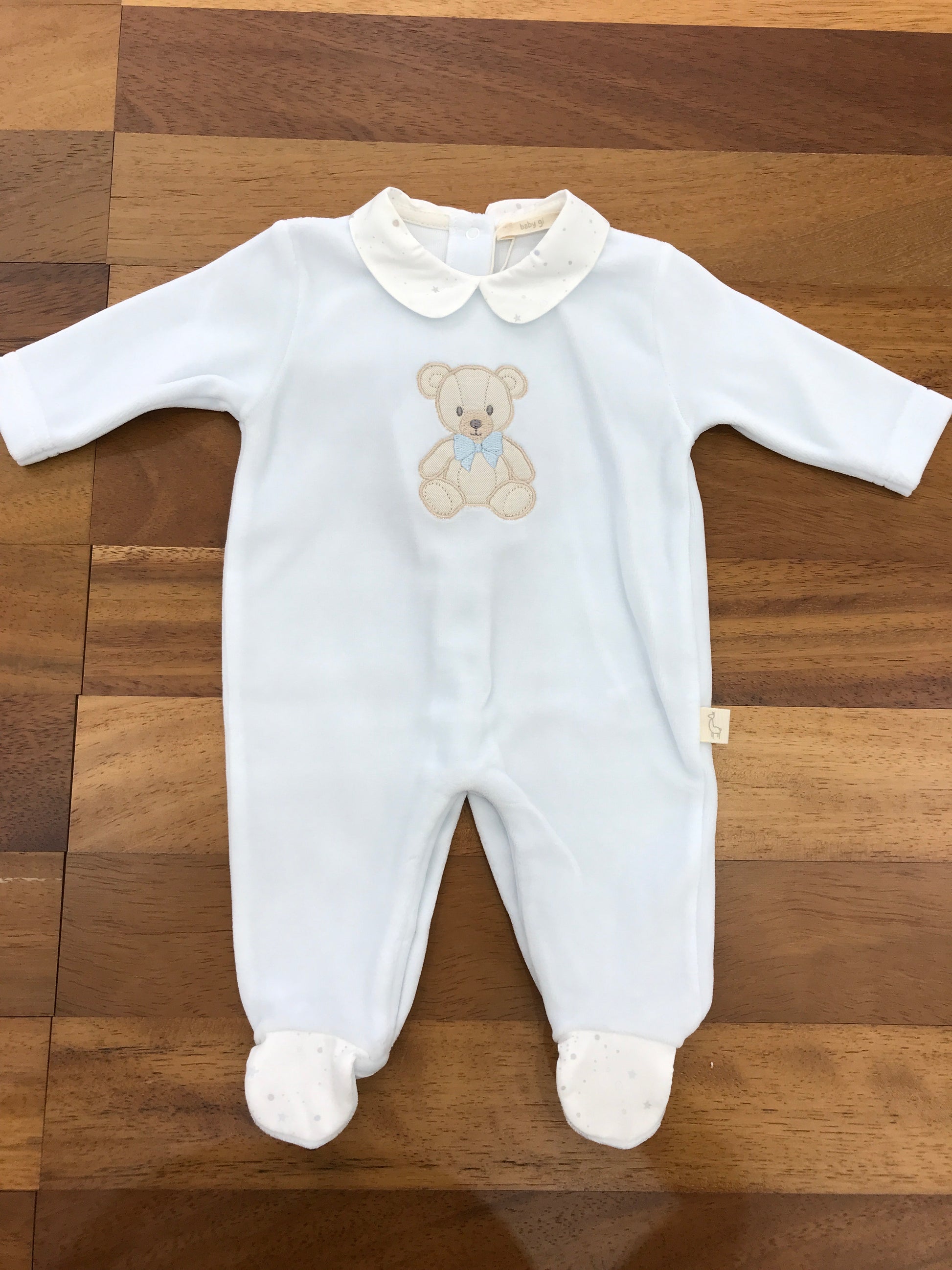 Questa tutina in ciniglia, completa di piedini e collo, è arricchita da una decorazione a forma di orsacchiotto sul davanti, garantendo comfort e stile per il neonato.