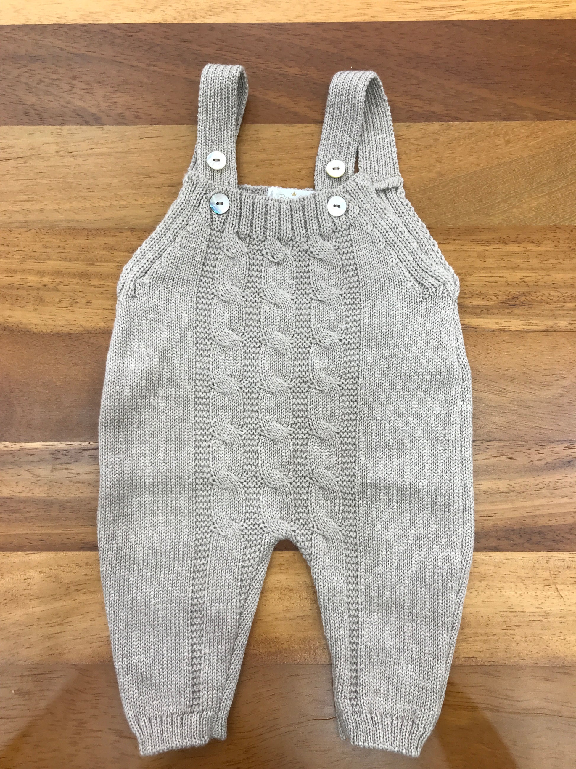 Salopette in lana caratterizzata da un motivo a trecce sul davanti e chiusura con bottoni sulle spalle.