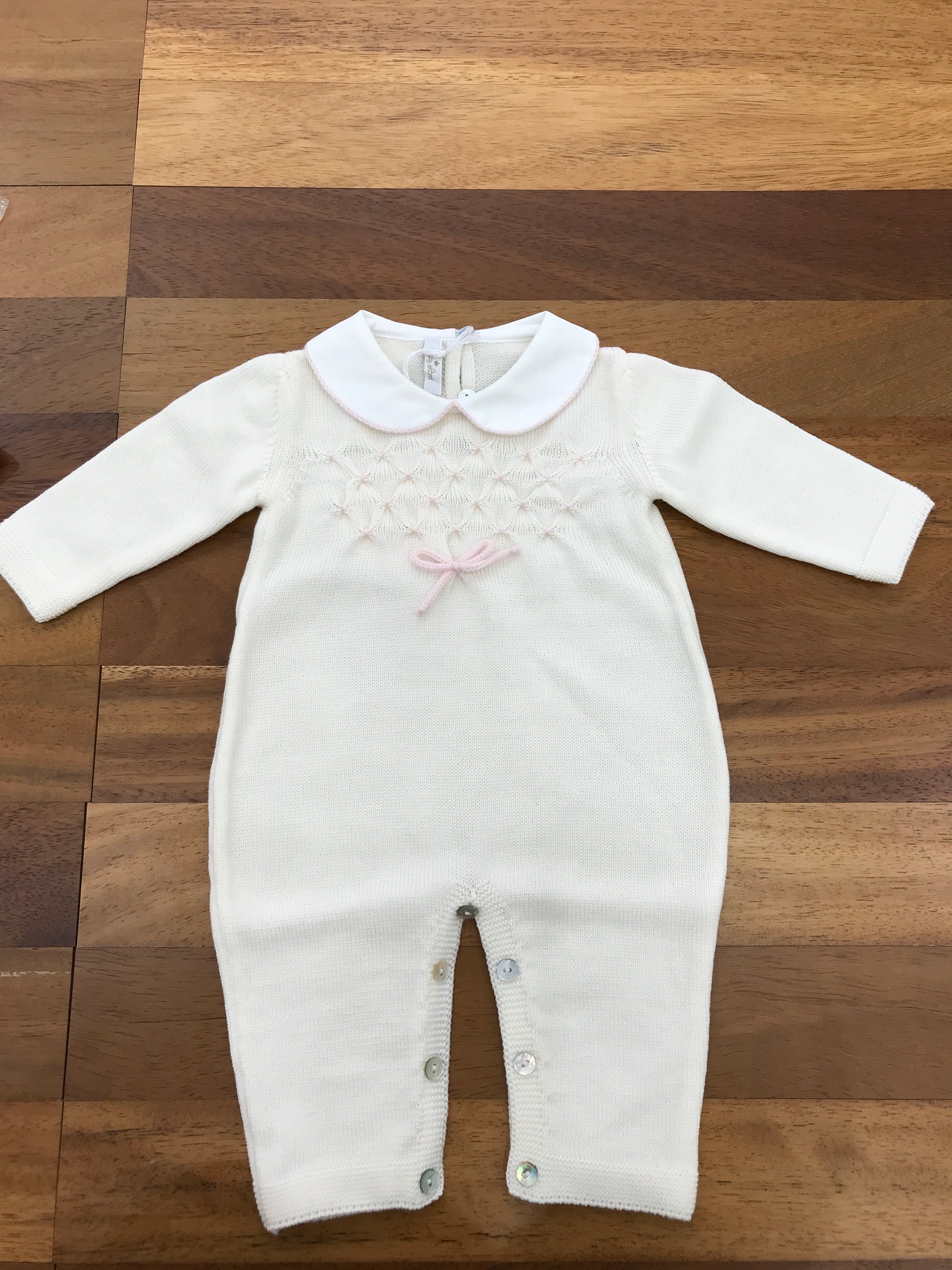 Tutina completa con collo rotondo e senza piedini, caratterizzata da un raffinato motivo a punto smok sul davanti.