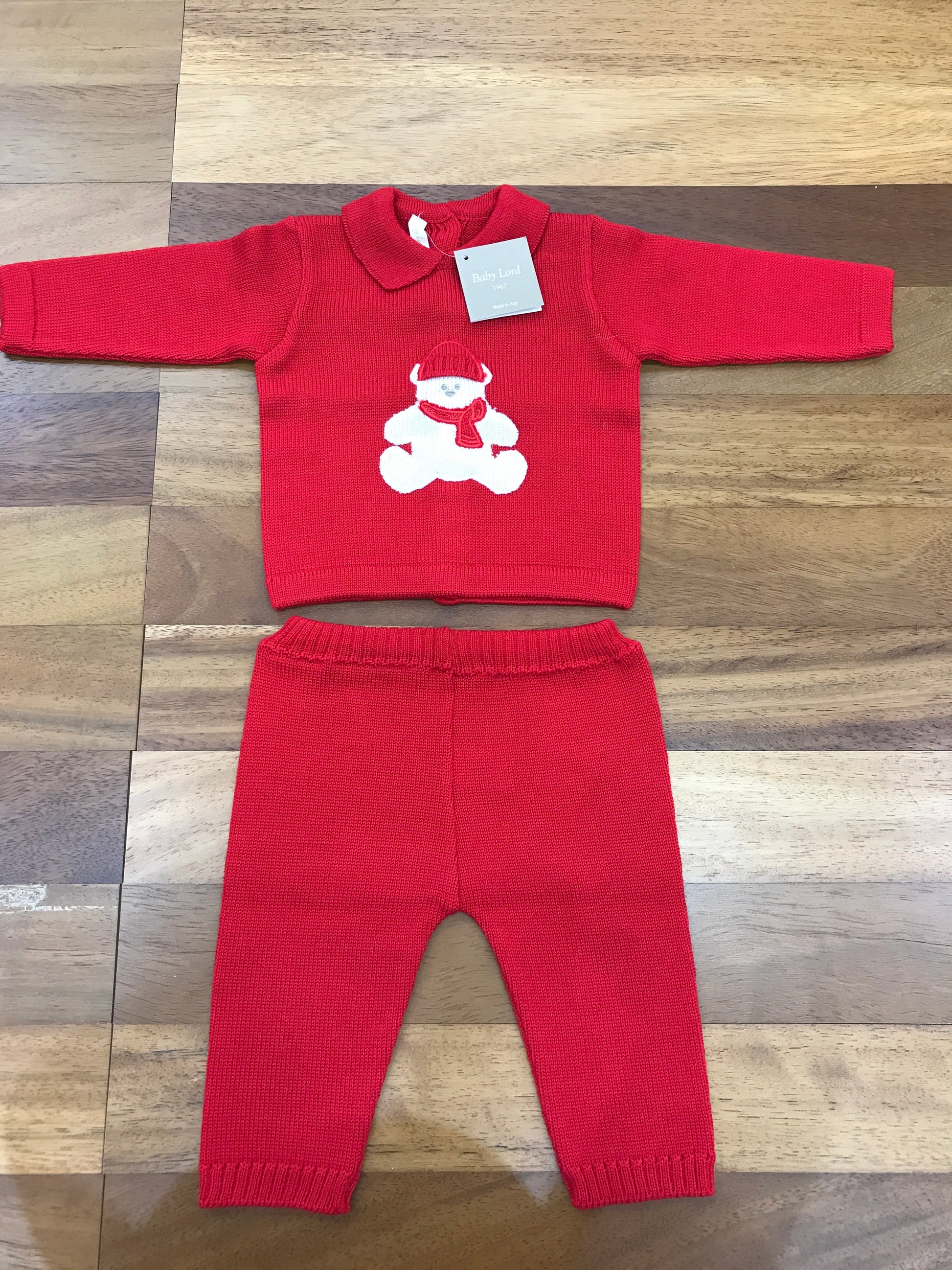 Completo due pezzi senza piedini, dotato di collo e decorato con un ricamo a forma di orsetto sul davanti.