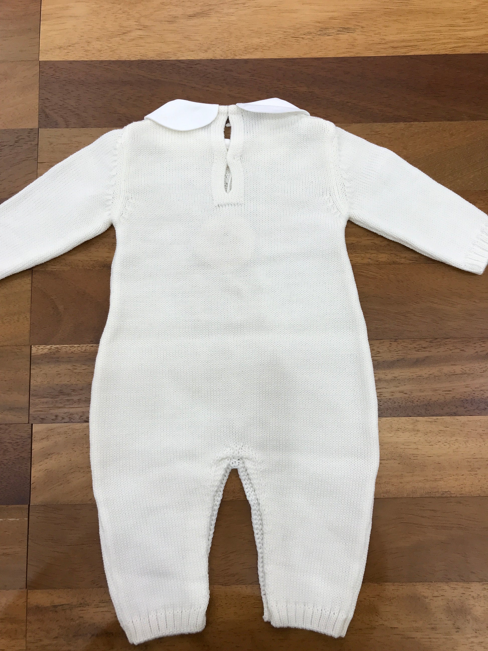 Questa tutina in lana, priva di piedini ma dotata di collo, presenta una raffinata lavorazione a trecce sulla parte frontale.
