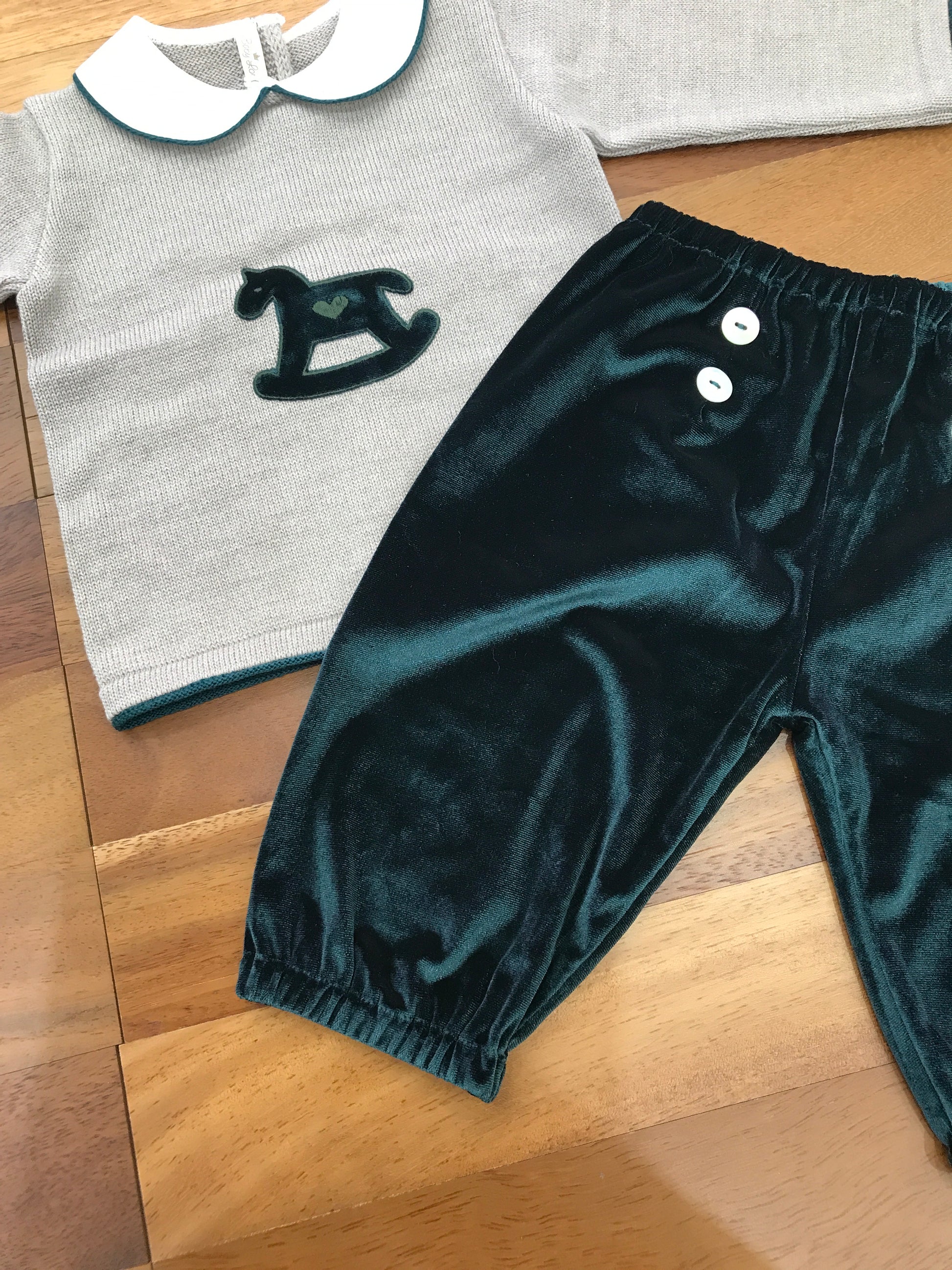 Completo in lana composto da pantaloni in velluto verde con bottoni e parte superiore tortora dotata di cavallo a dondolo.