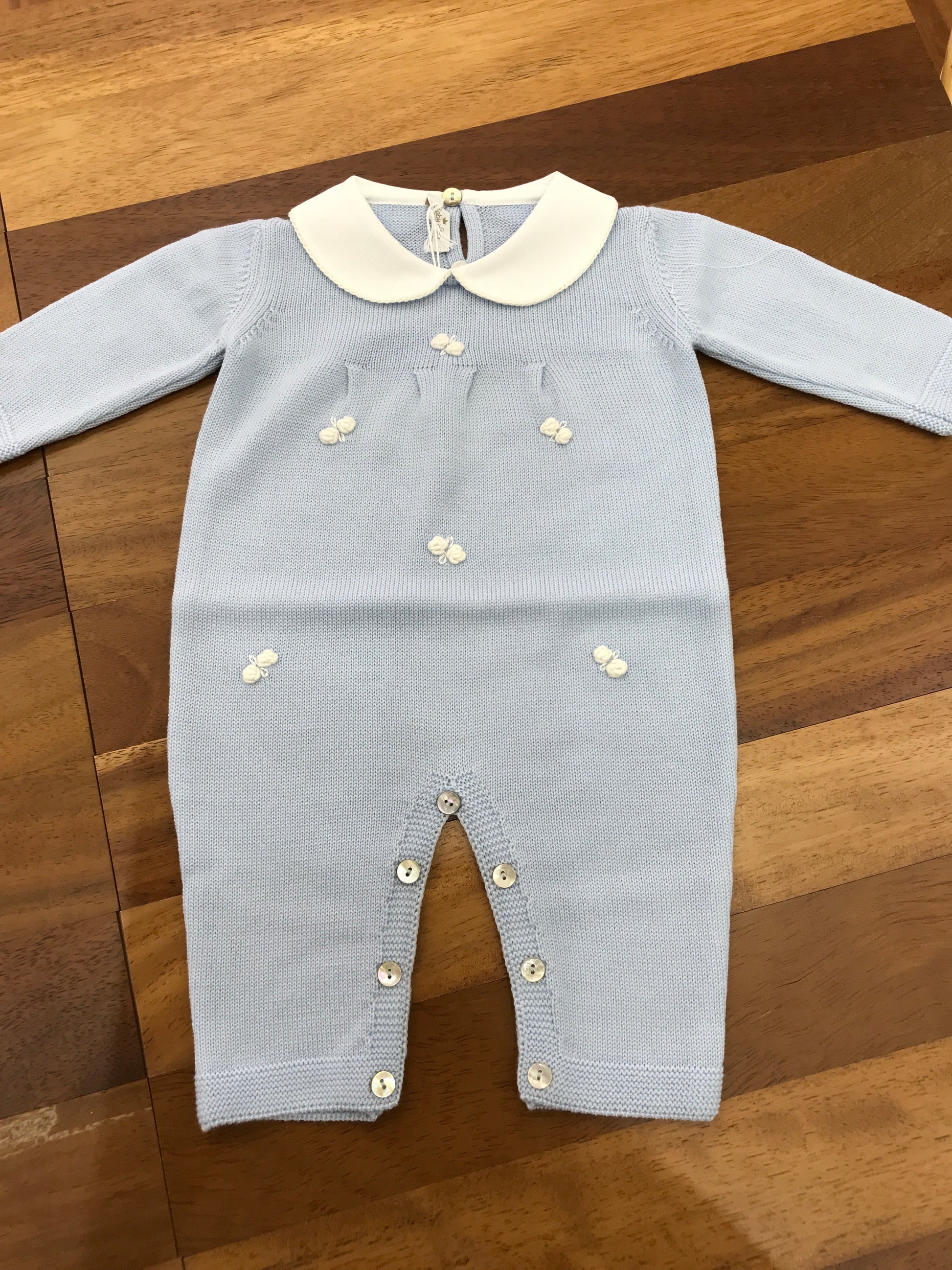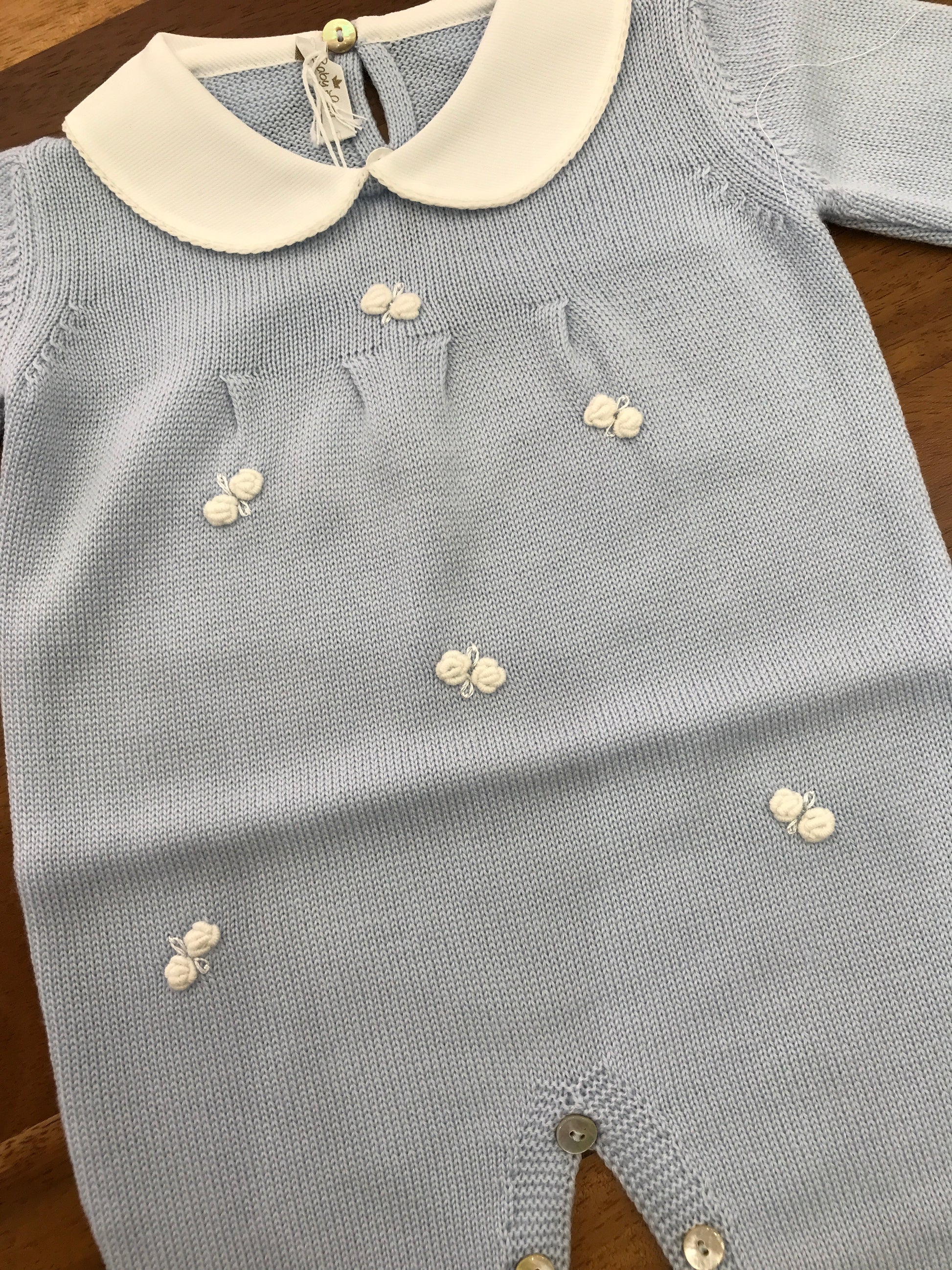 Questa tutina intera realizzata in lana di alta qualità presenta un colletto semplice di colore bianco che aggiunge un tocco di eleganza sobria. Il modello è privo di piedini, garantendo maggiore libertà di movimento per il bambino. La superficie è impreziosita da delicati ricami di fiorellini bianchi, che conferiscono un dettaglio raffinato e distintivo al capo. Ideale per mantenere il piccolo caldo e confortevole con uno stile classico e curato.