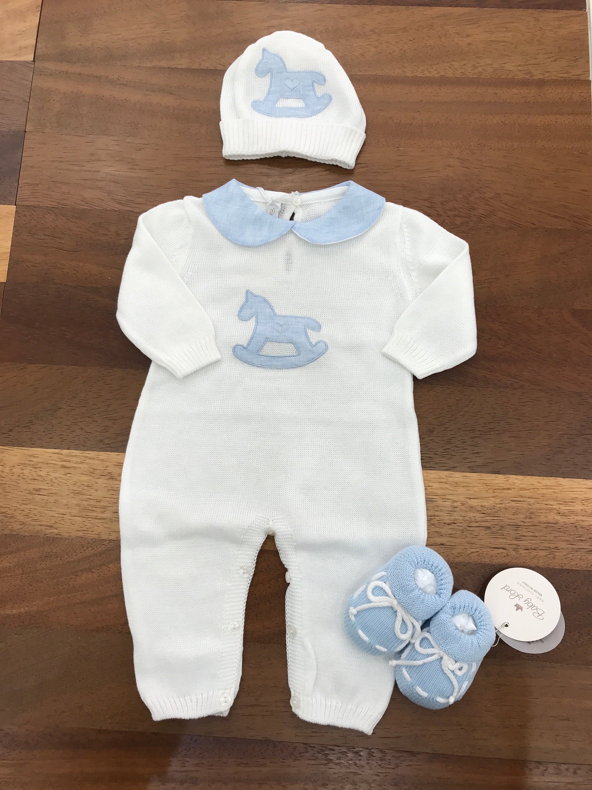 Elegante tutina neonato realizzata in pregiato filo bianco, impreziosita da un raffinato colletto celeste. Il dettaglio distintivo è il ricamo centrale in cleetse che raffigura un cavallo a dondolo, elemento che conferisce carattere e fascino al capo. Una scelta sofisticata per i piccoli, perfetta per occasioni speciali.