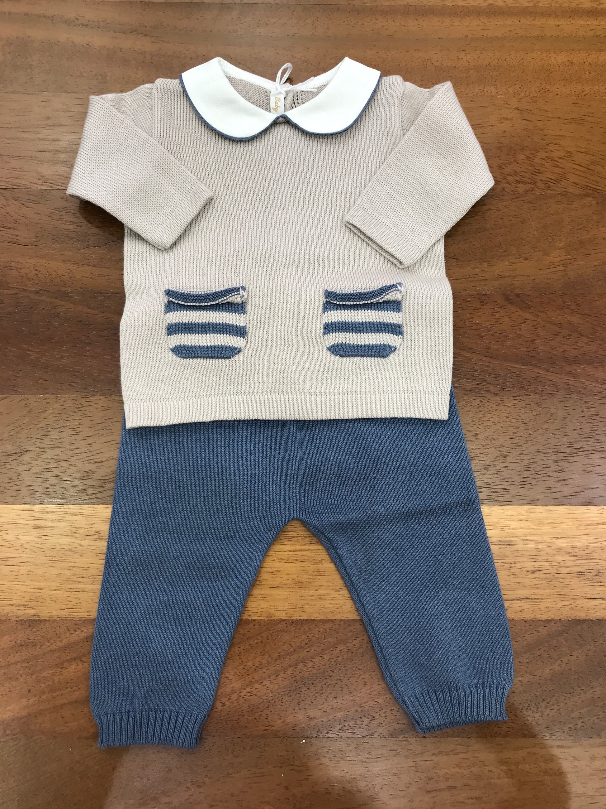 Elegante completo bipartito caratterizzato da un raffinato collo rotondo e impreziosito da un pratico taschino a righe sul petto. Un capo versatile che unisce funzionalità e stile classico, perfetto per occasioni speciali e momenti quotidiani del vostro bambino.
