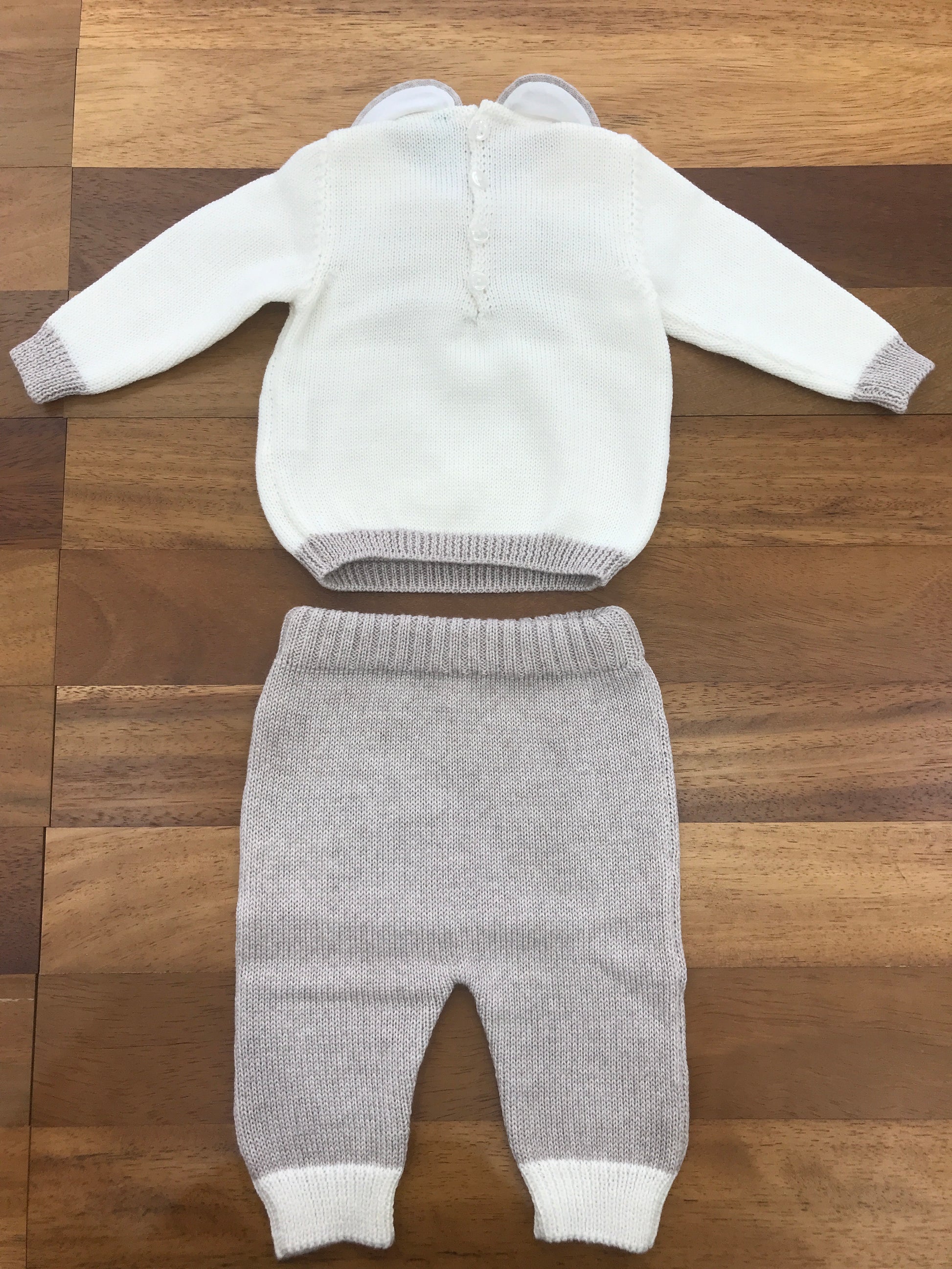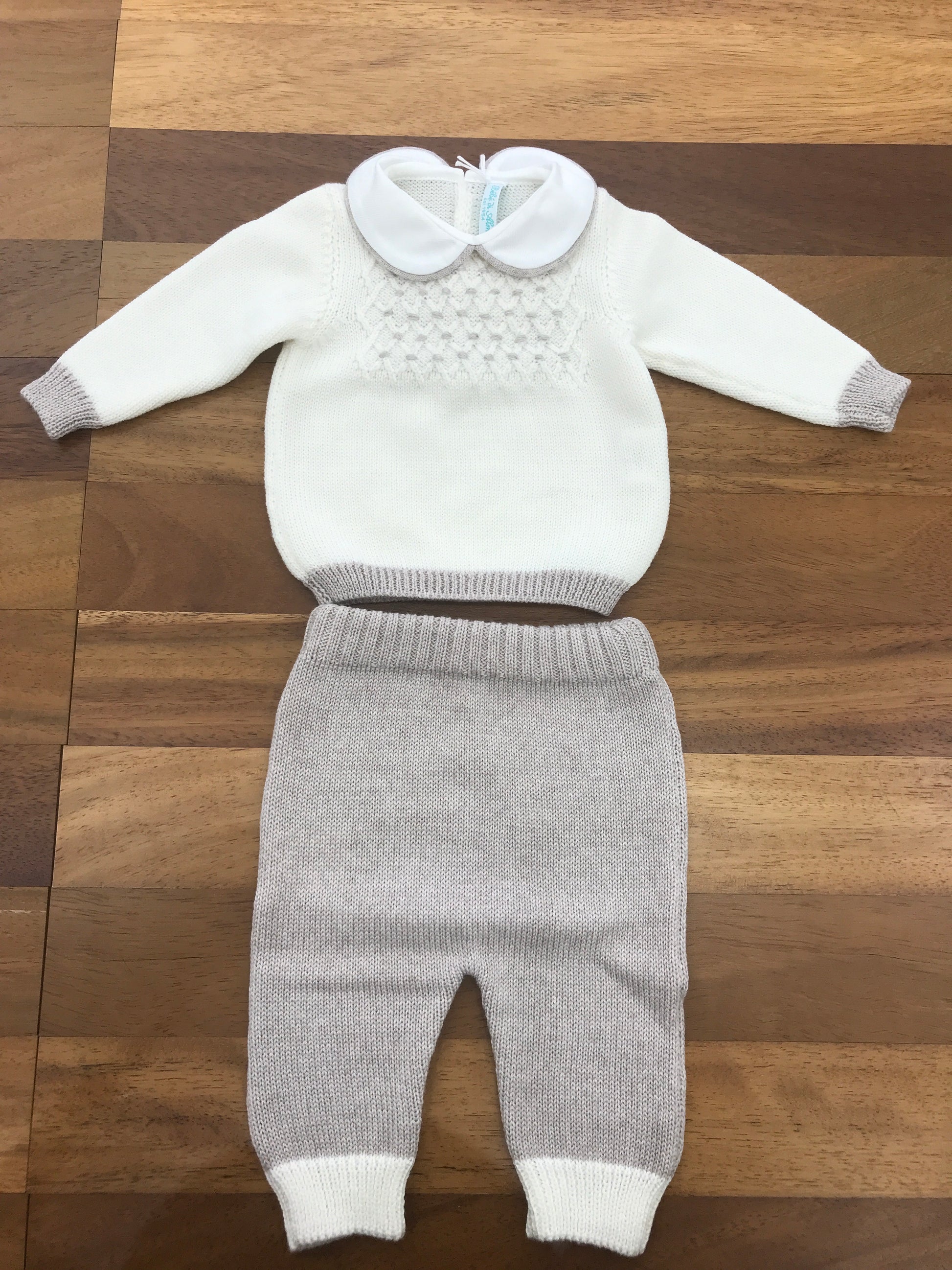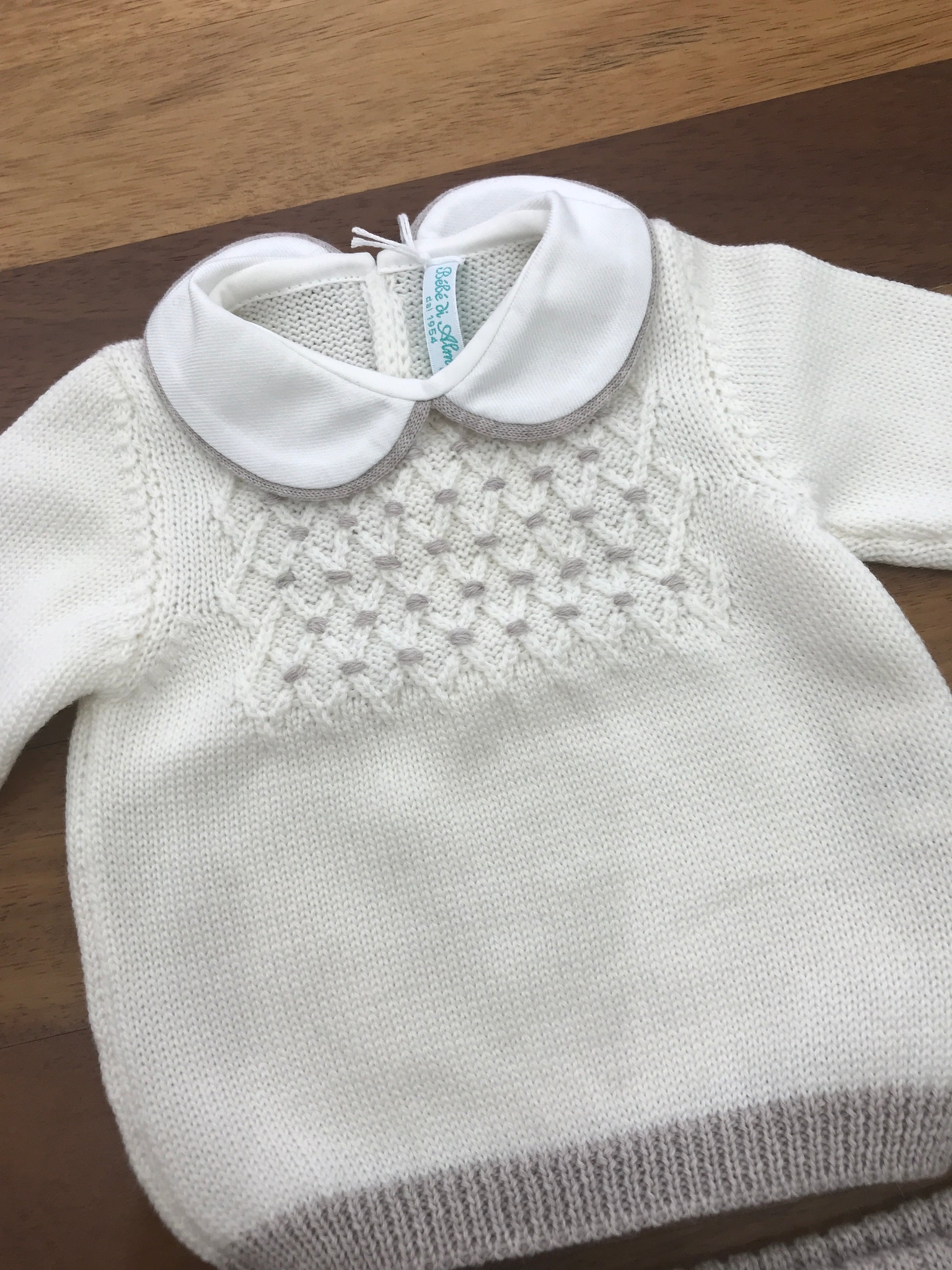 Completo due pezzi senza piedini, dotato di collo e decorato con un raffinato ricamo a punto smock.