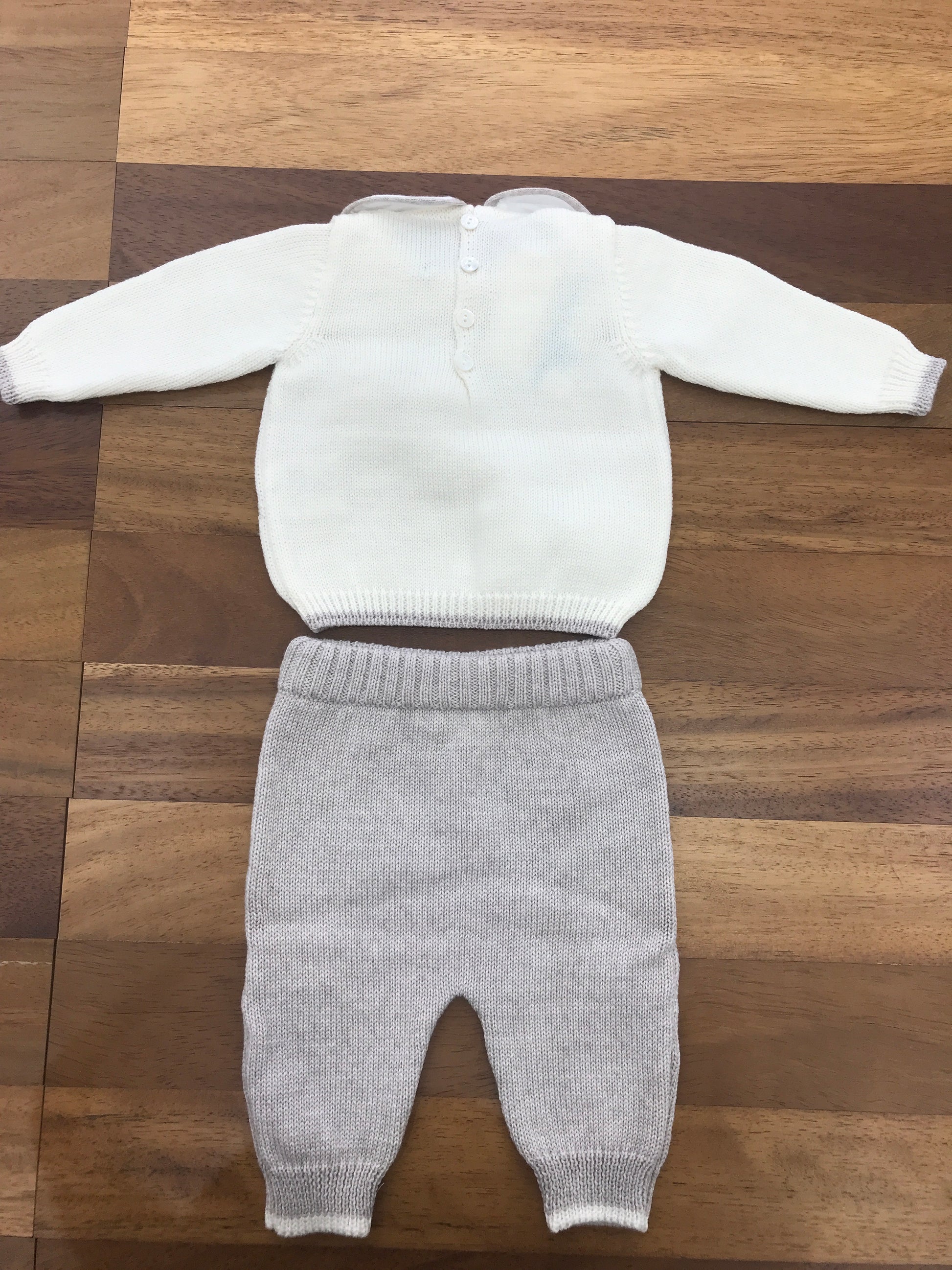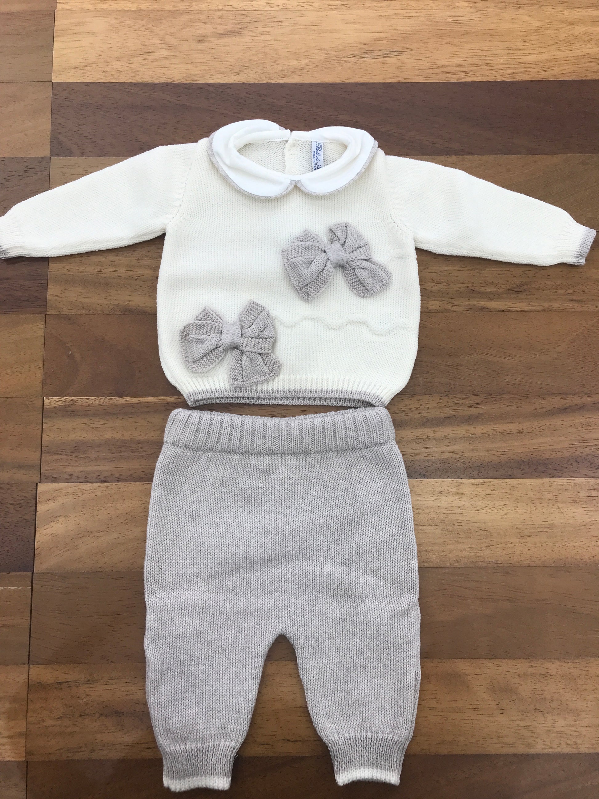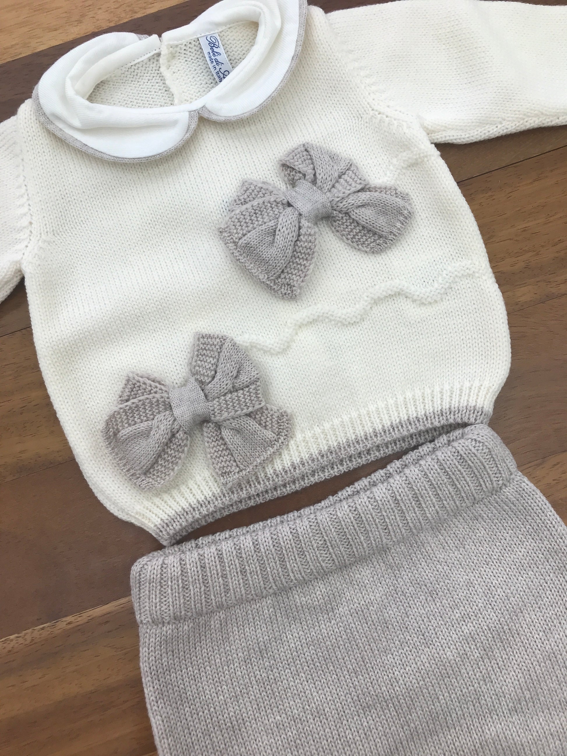 Completo in lana composto da due pezzi, caratterizzato da un collo e senza piedini, arricchito da due fiocchetti decorativi sul davanti.