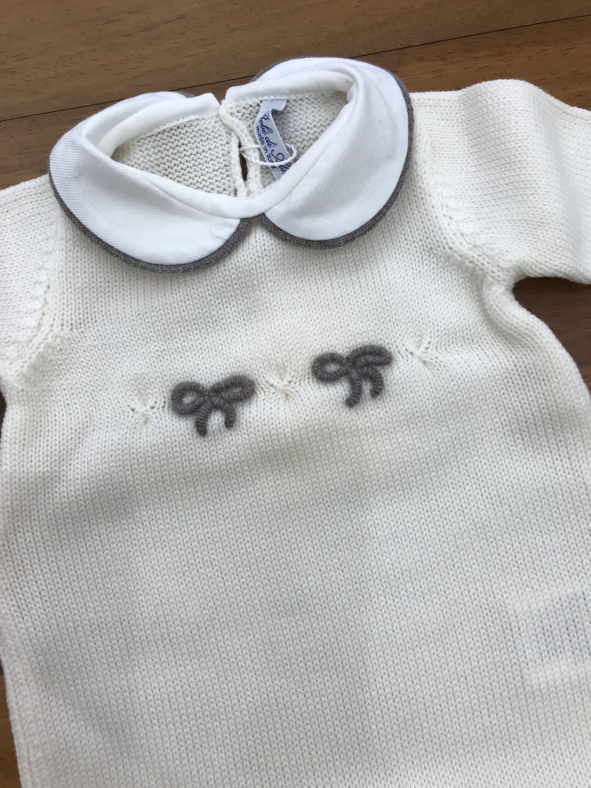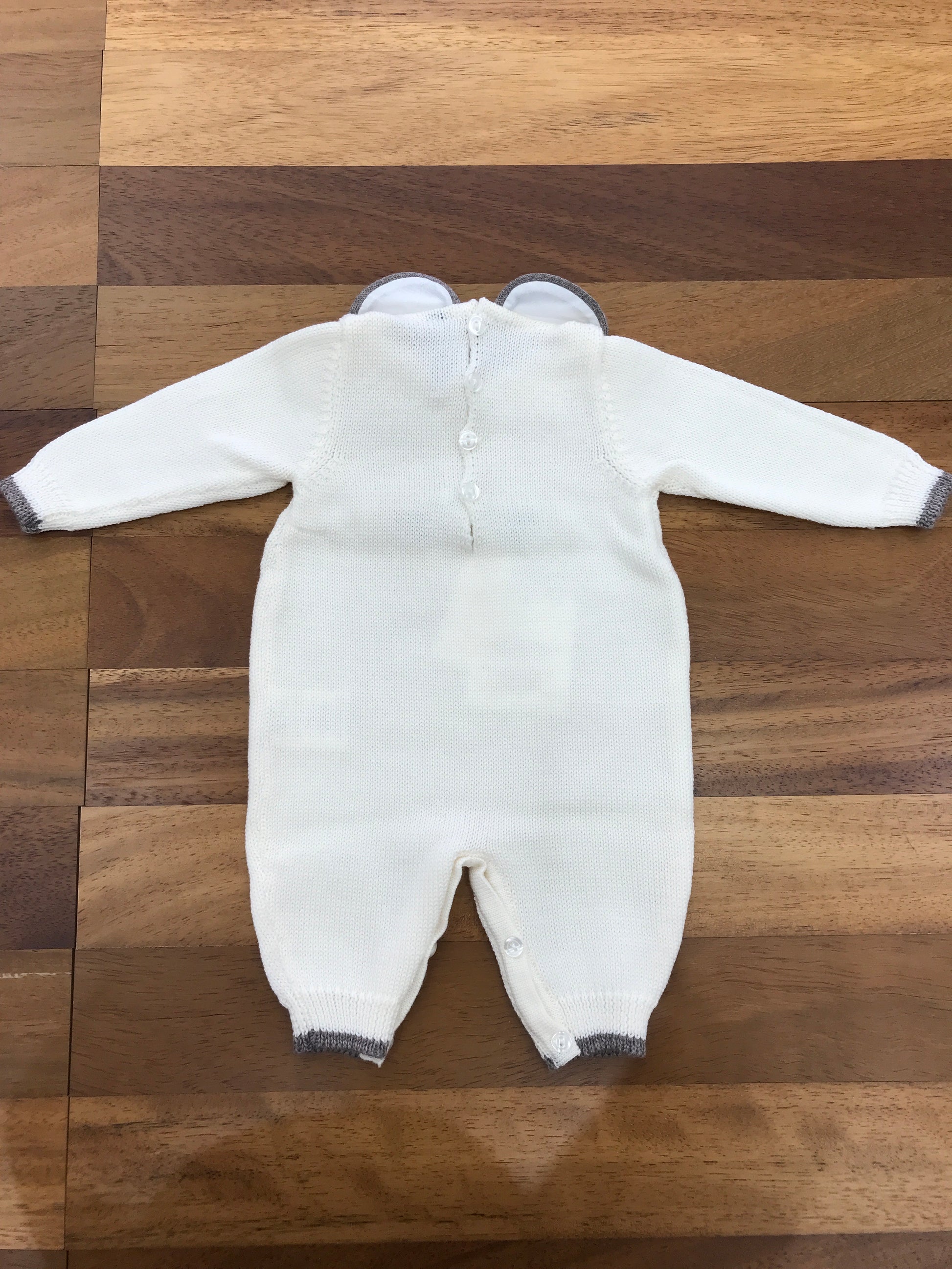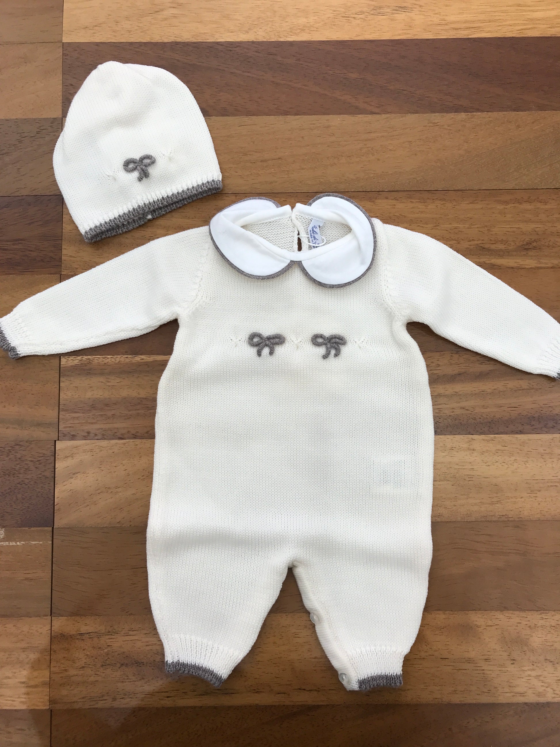Questa tutina in lana, senza piedini e con collo, è arricchita da delicati fiocchetti ricamati sul davanti, ideale per garantire comfort e stile al neonato.