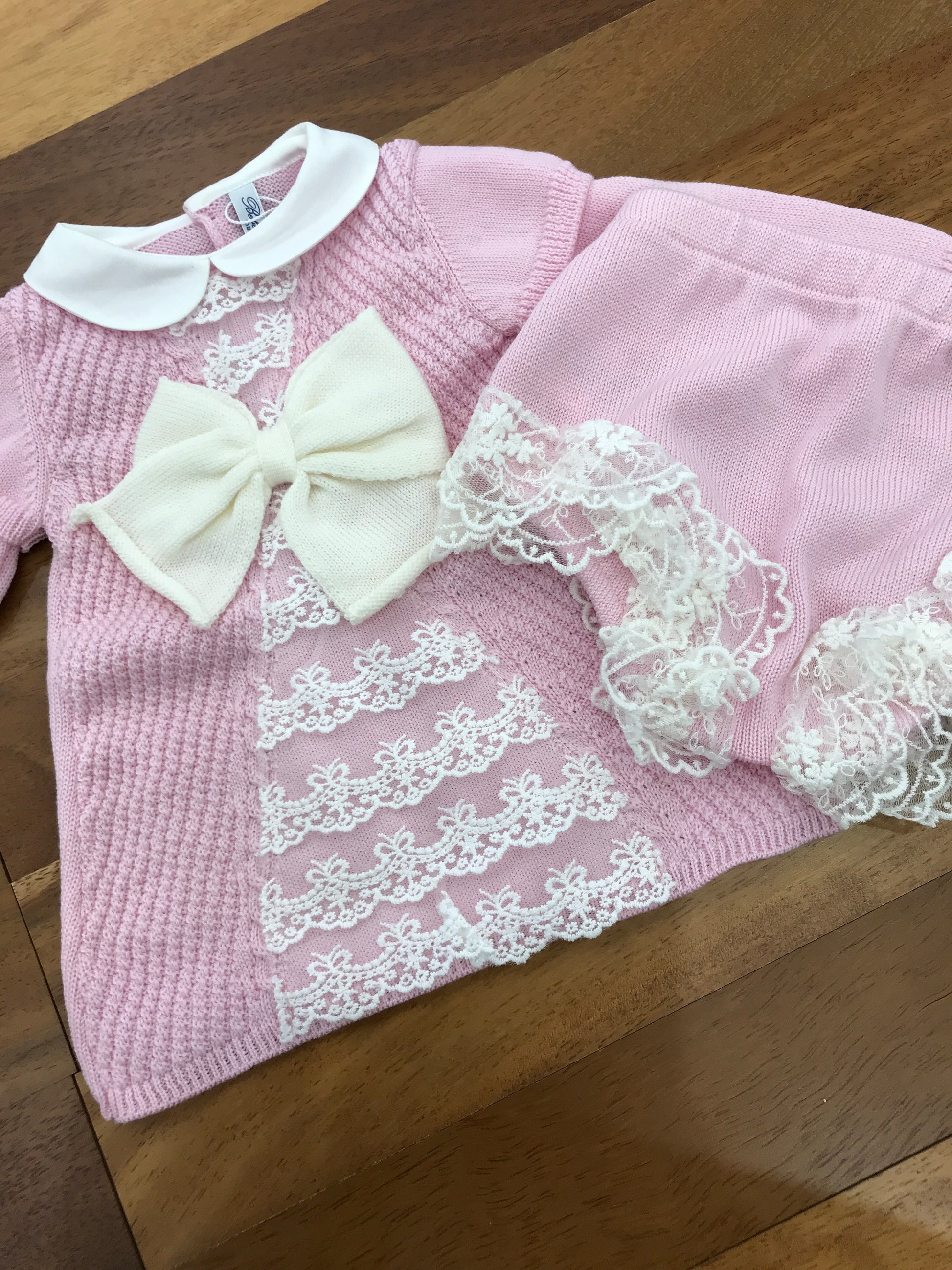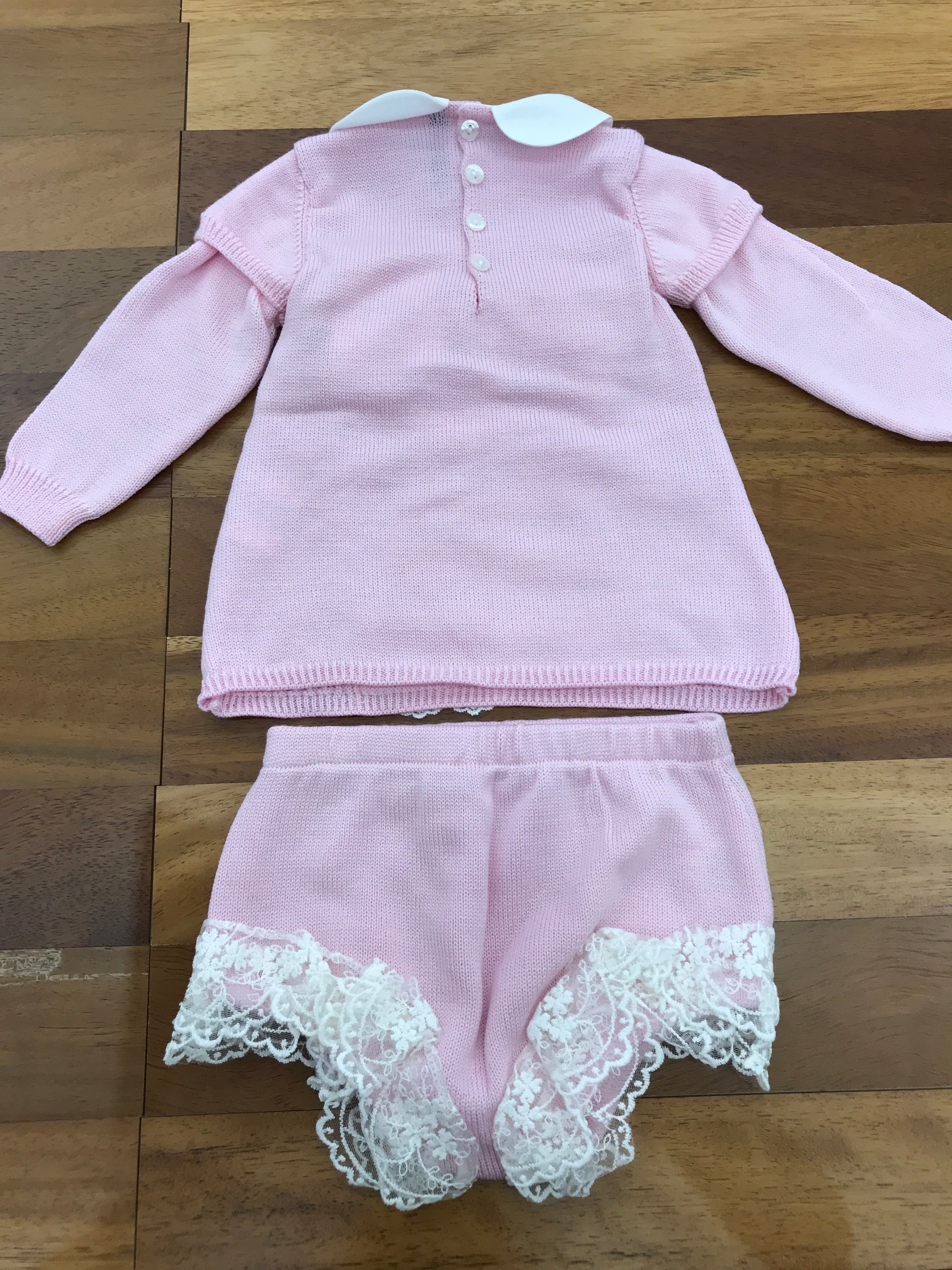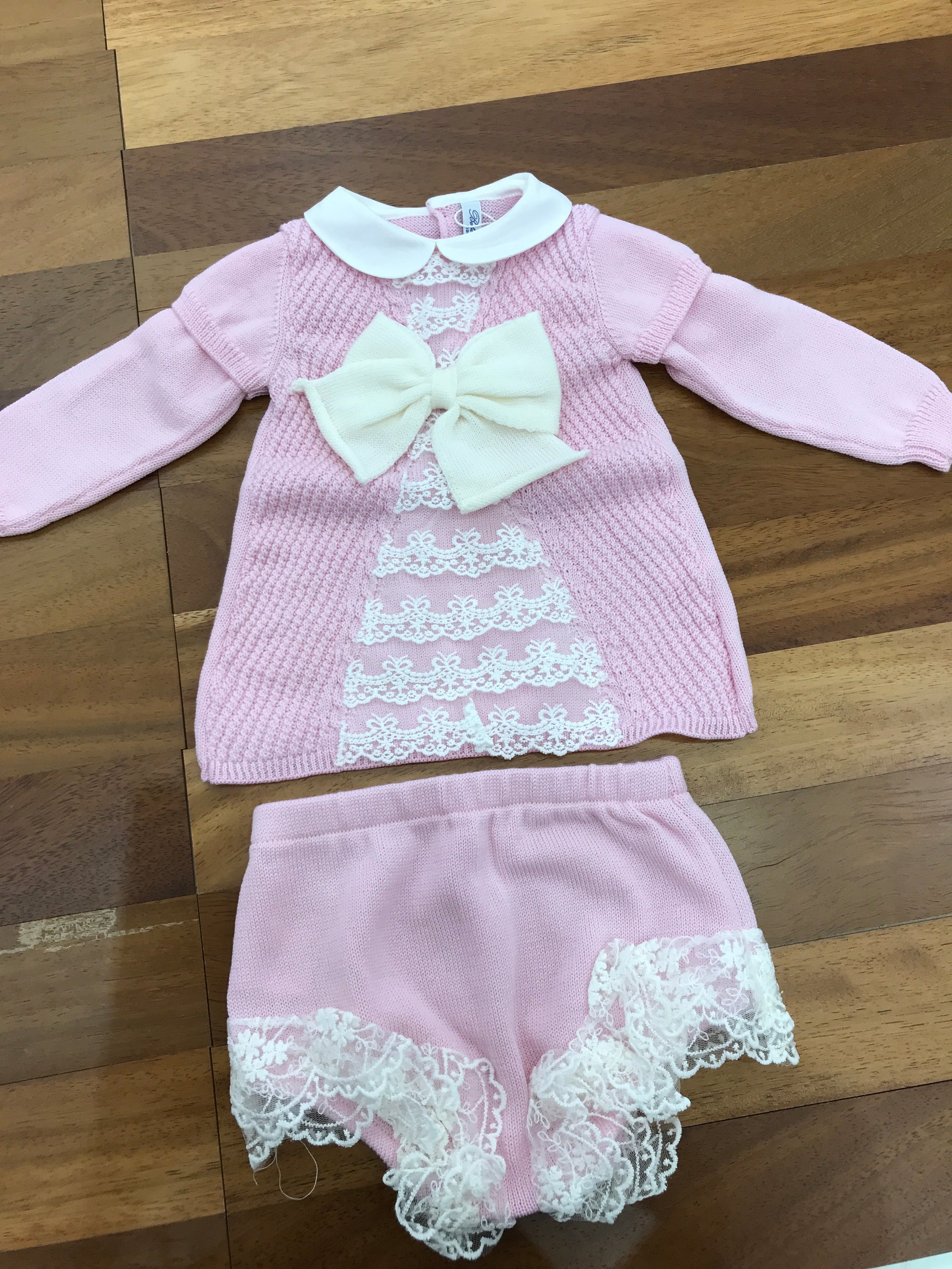 Completo in lana con merletto ricamato al centro e un fiocco panna posizionato in modo elegante. Include una coulotte con elastico in vita e dettagli in merletto sul fondo.