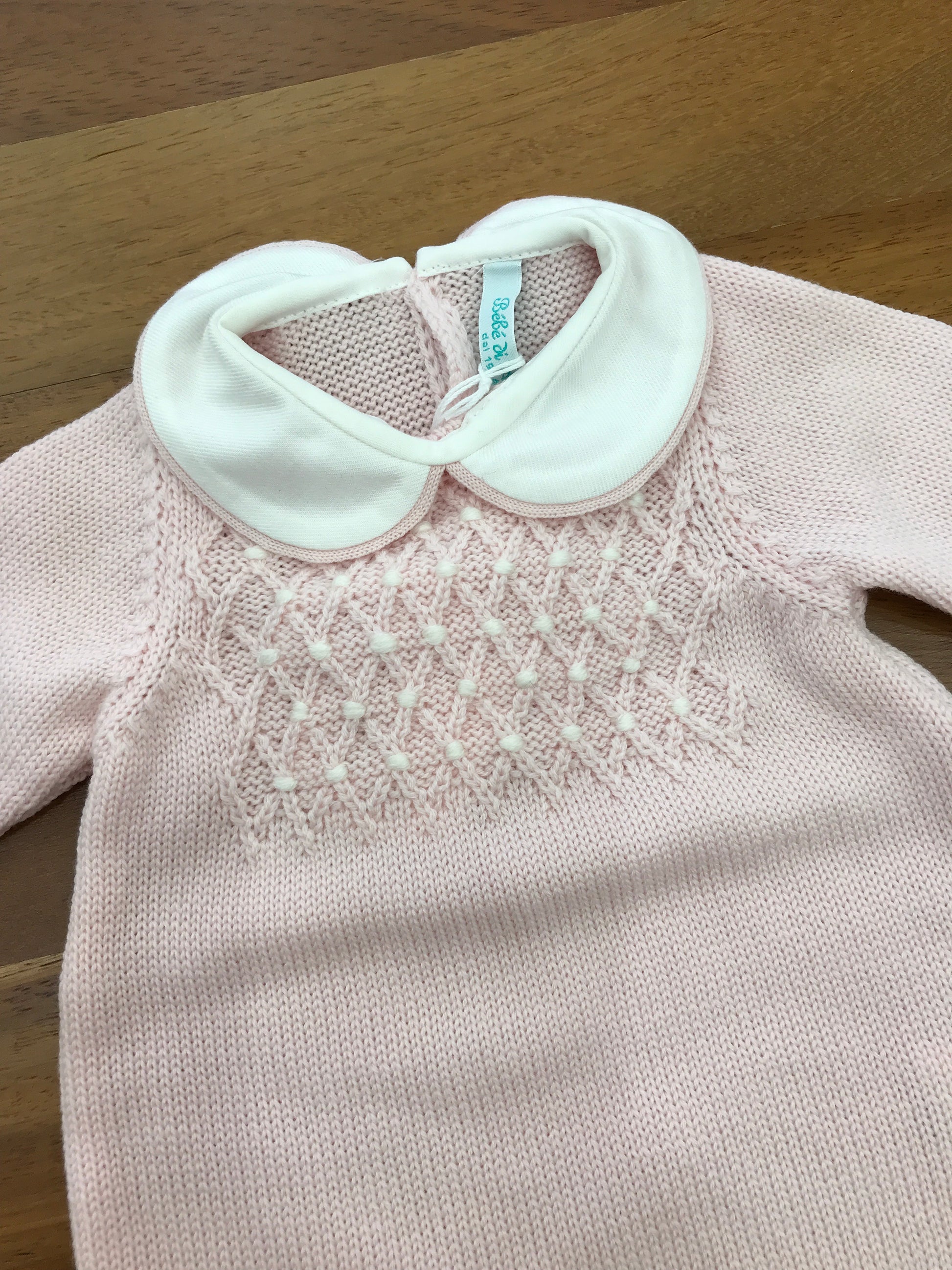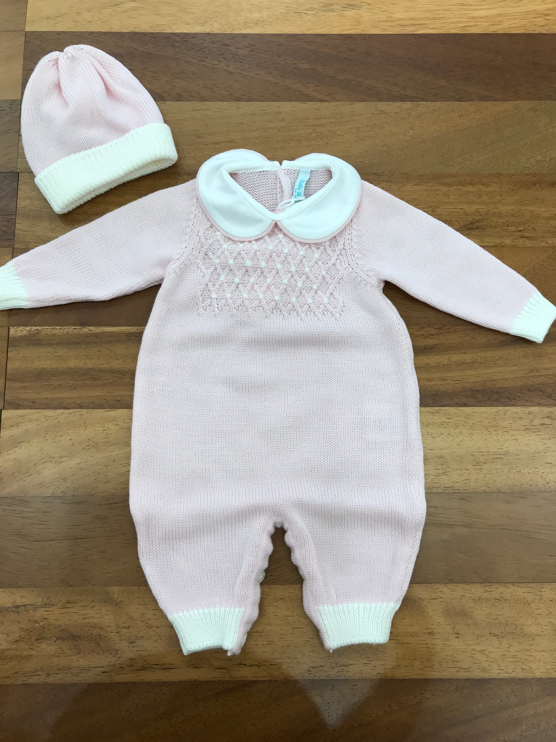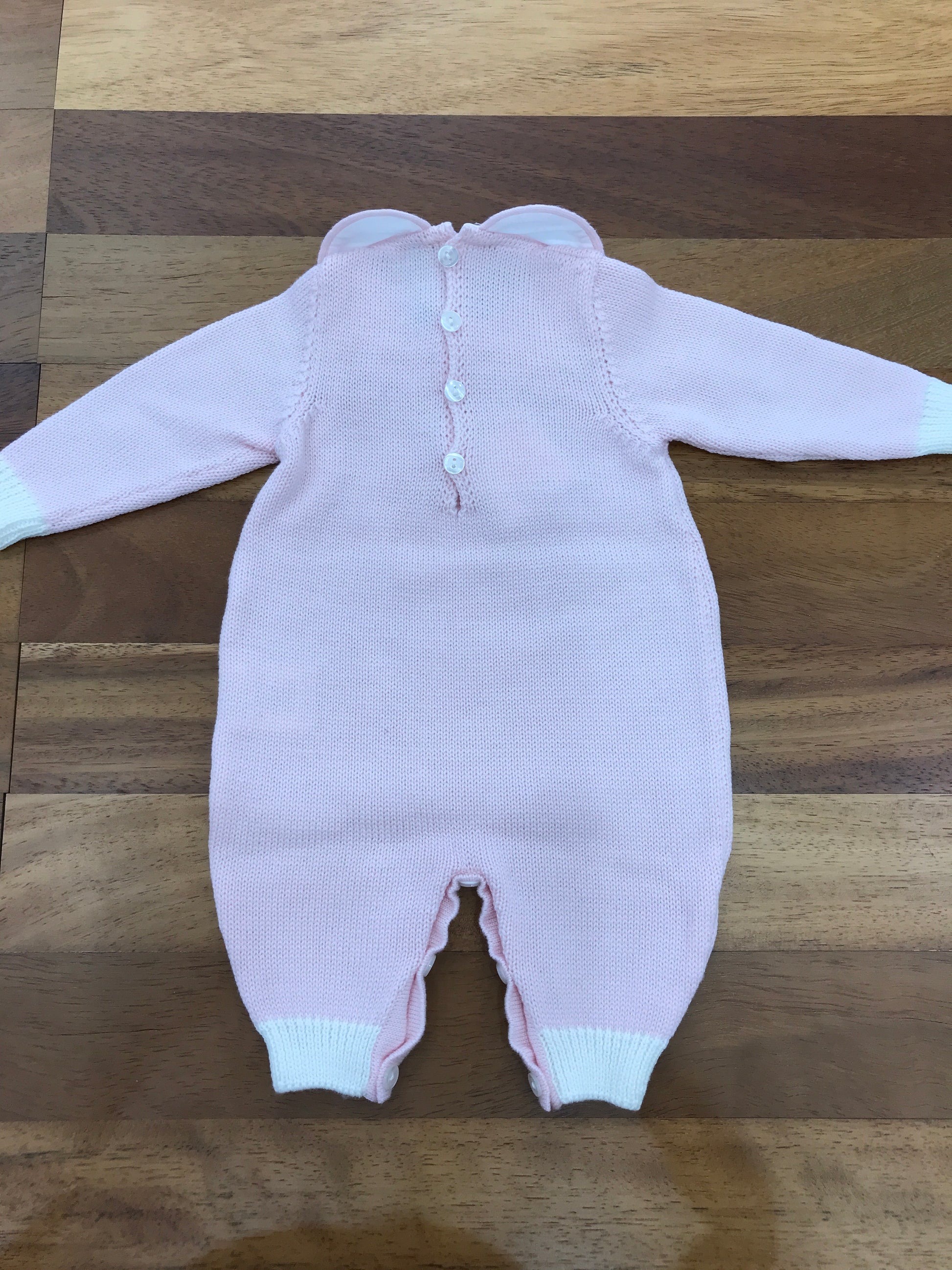 Questa tutina intera in lana, priva di piedini, presenta un collo rifinito e un elegante motivo a punto smok sul davanti, ideale per garantire comfort e stile al neonato.