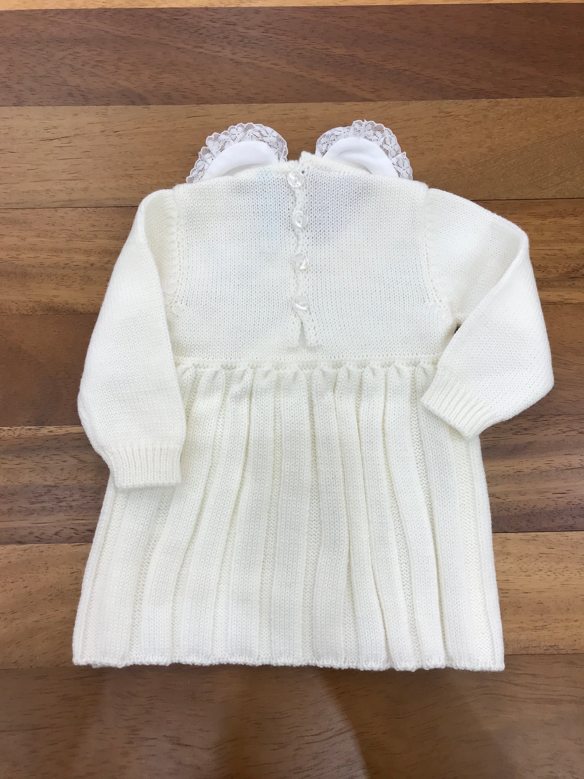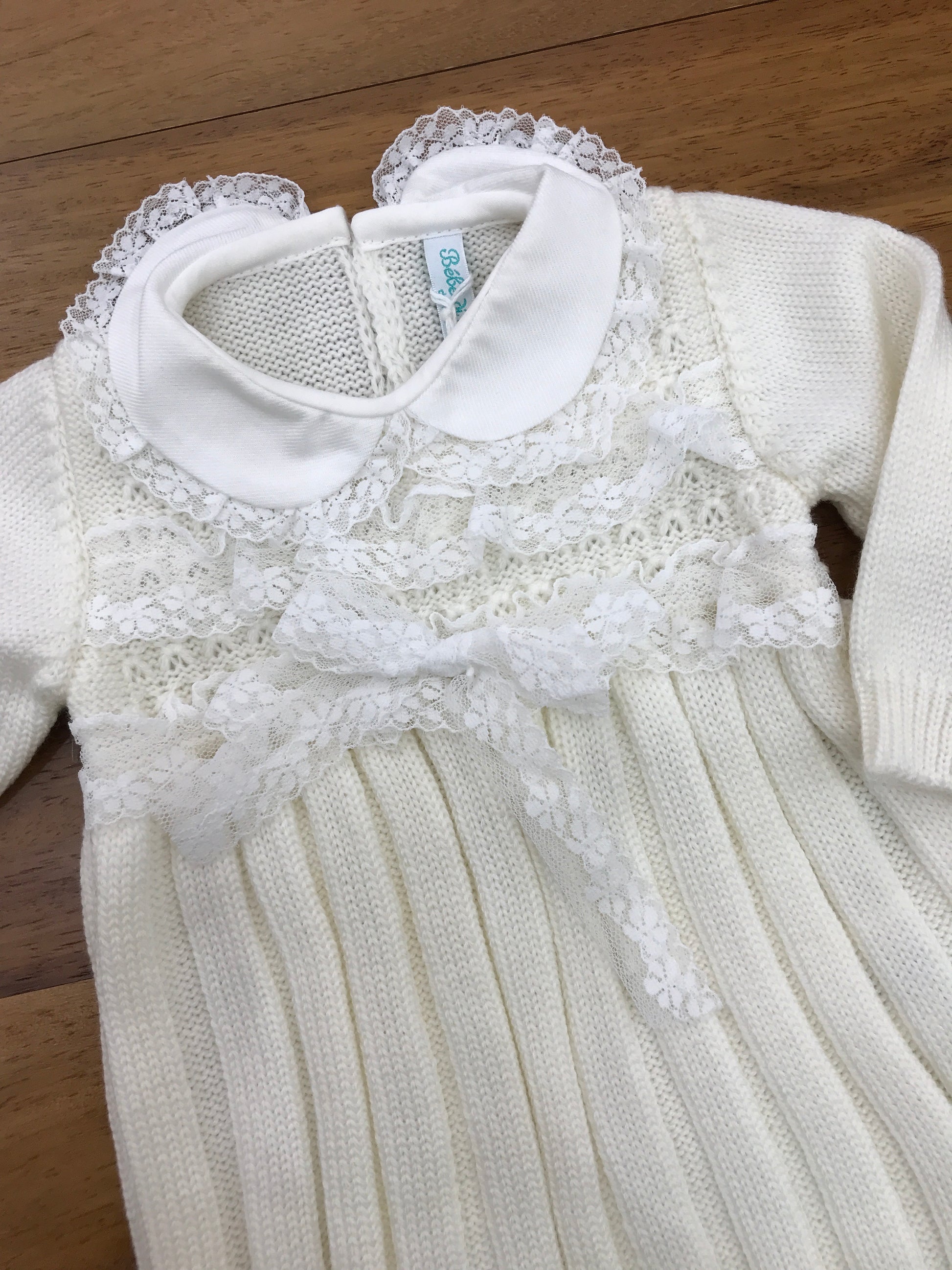 Questo abitino in lana presenta un colletto elegante e un delicato ricamo in merletto sulla parte frontale, ideale per garantire comfort e stile al tuo bebè.