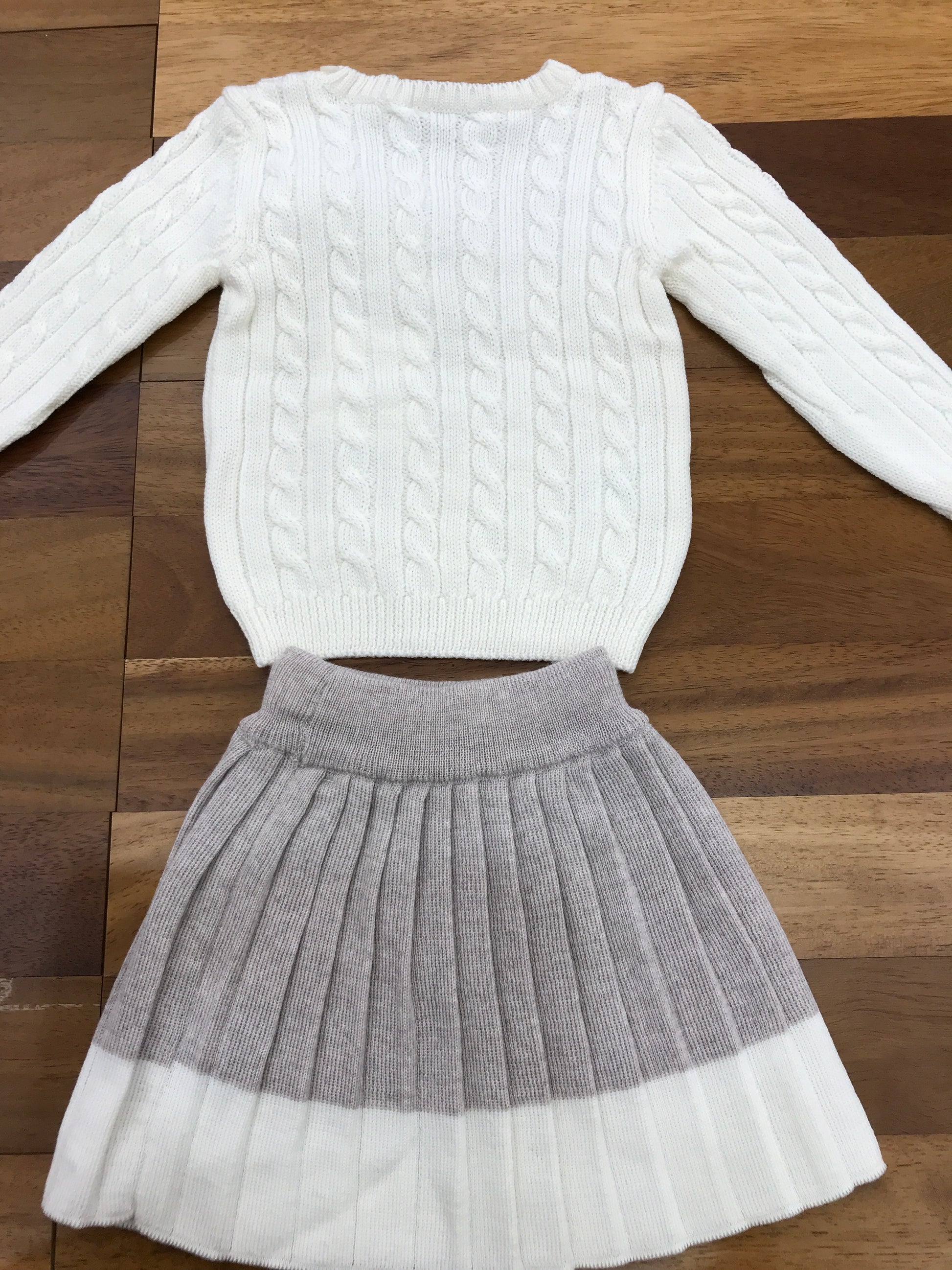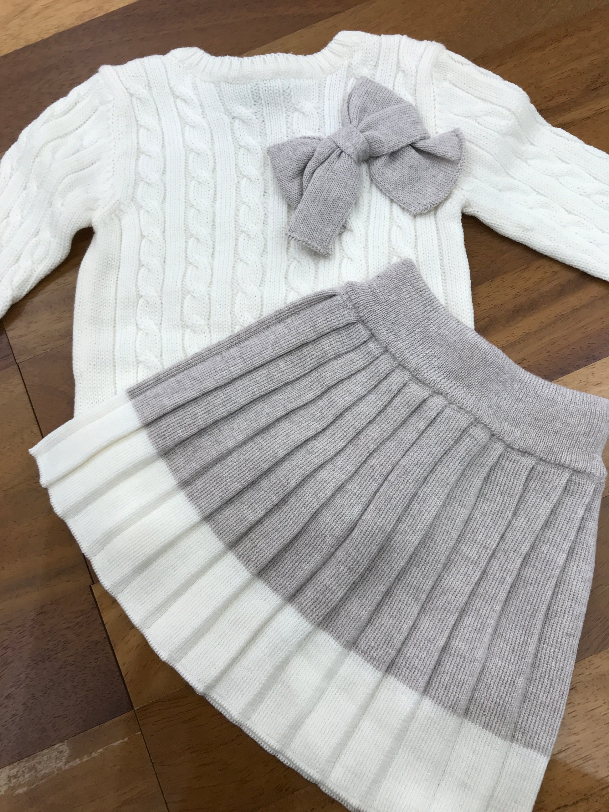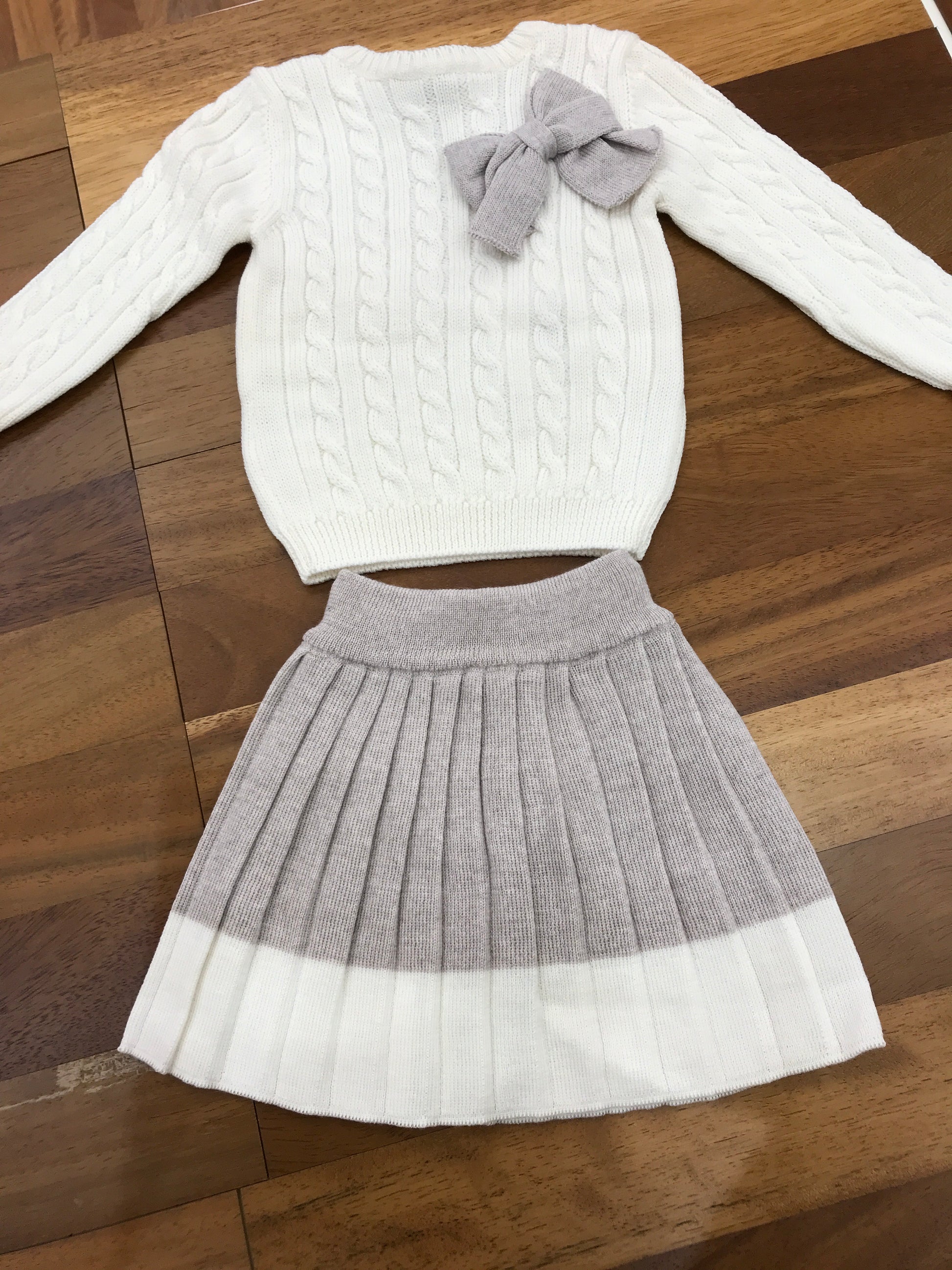 Completo in lana composto da due pezzi: una maglietta con dettagli a trecce e un fiocco decorativo, abbinata a una gonnellina coordinata.
