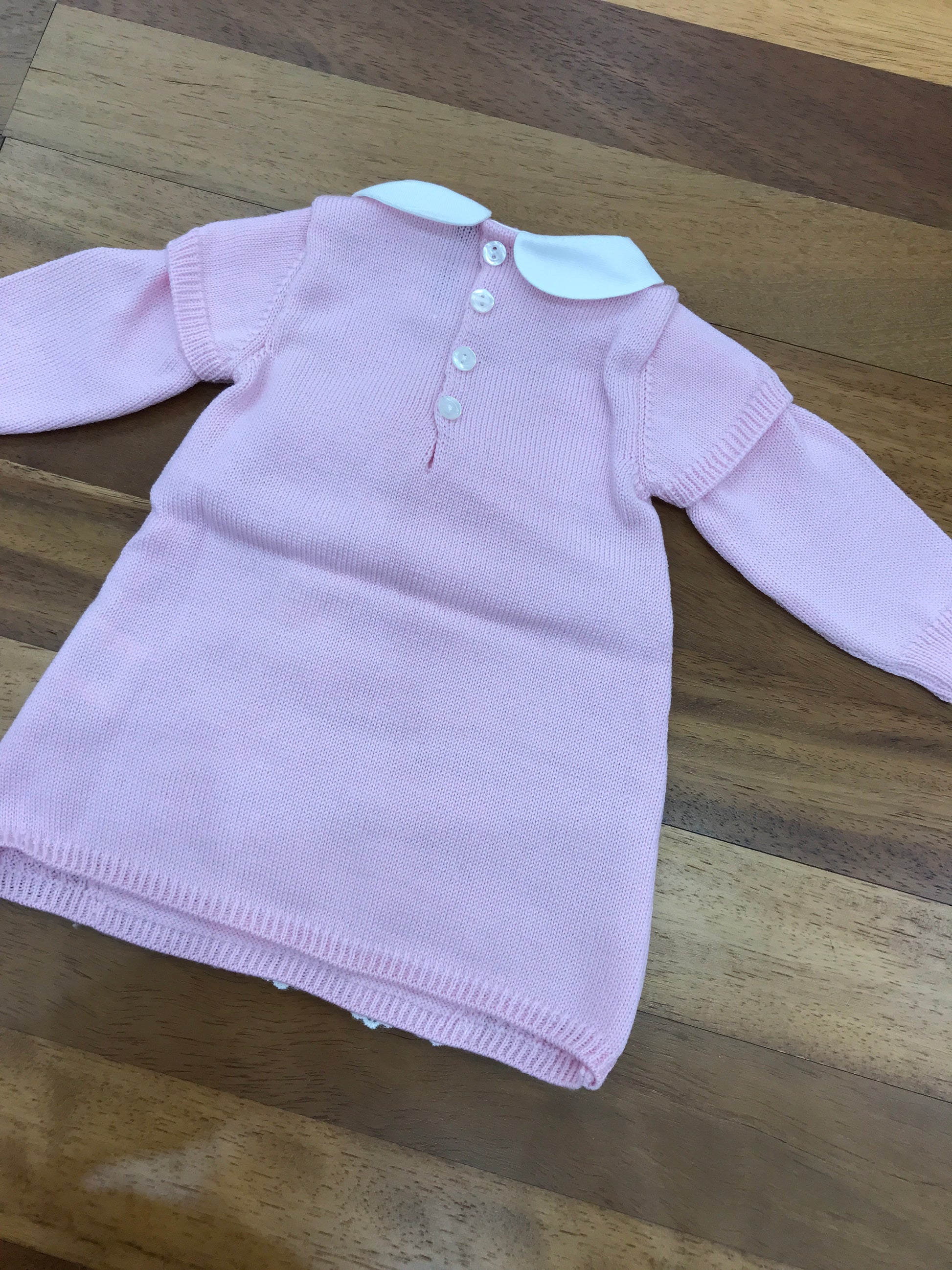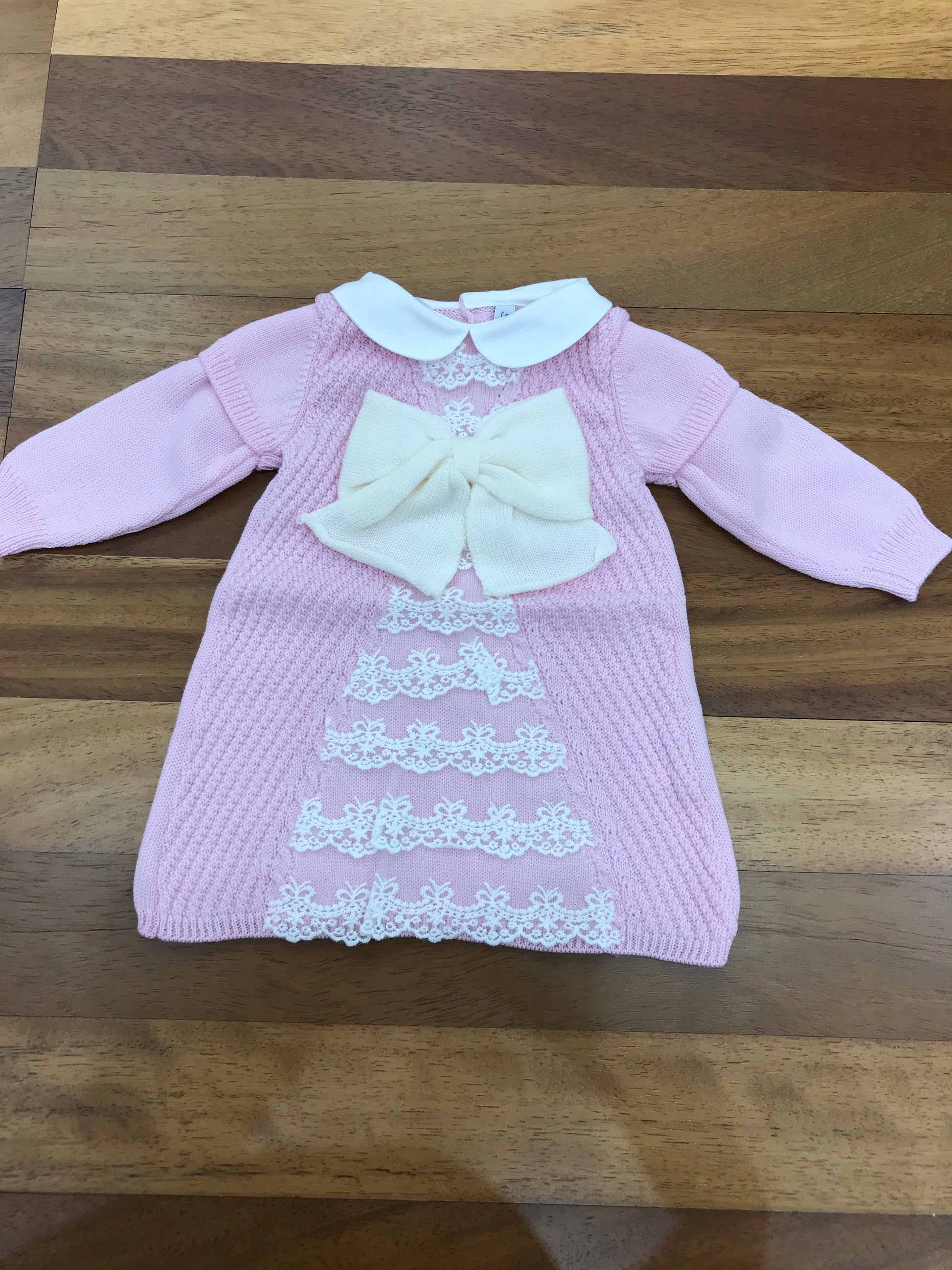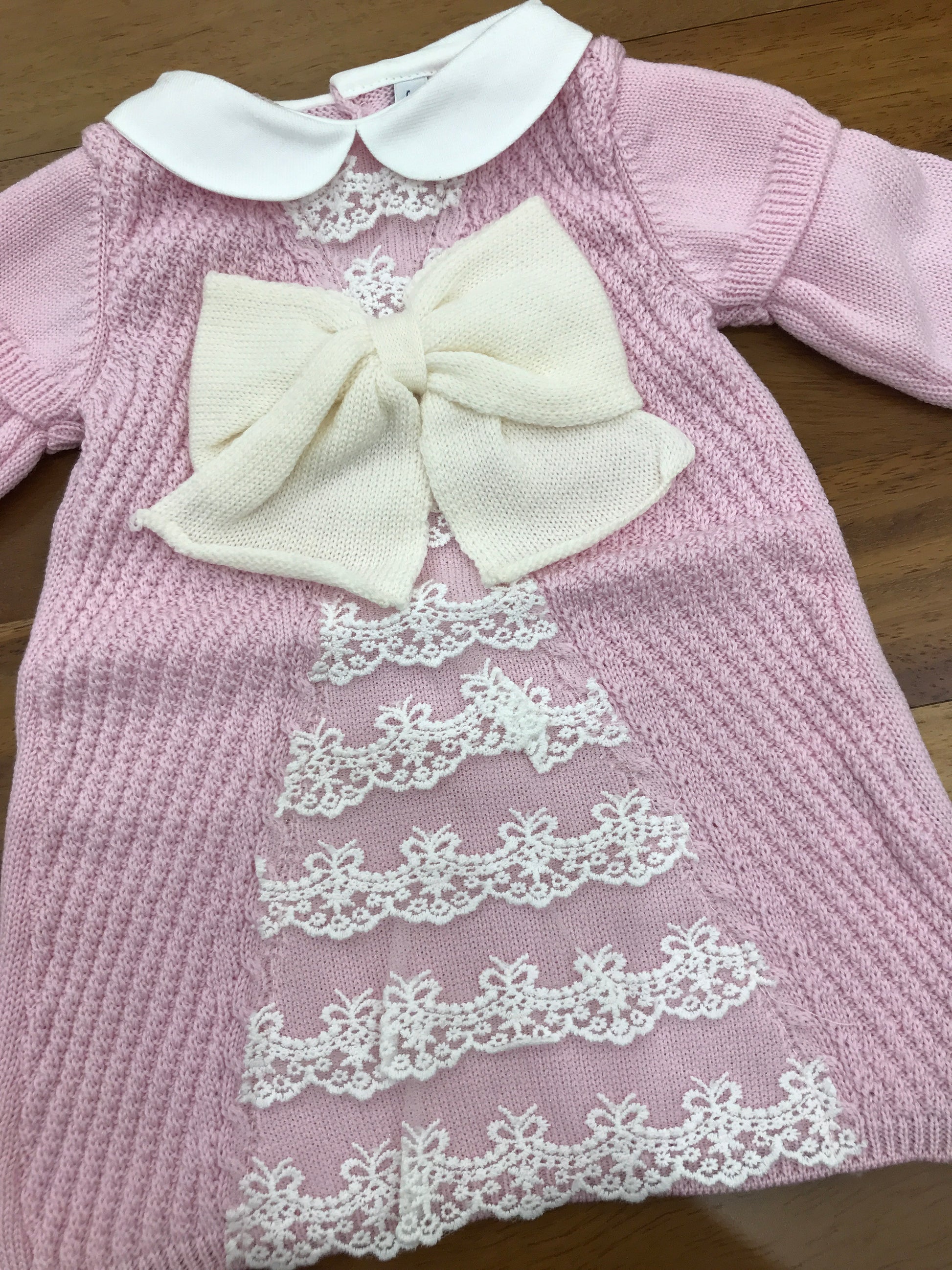 Questo abitino in lana presenta un delicato fiocco e un raffinato merletto sul davanti, aggiungendo un tocco elegante alla confezione.