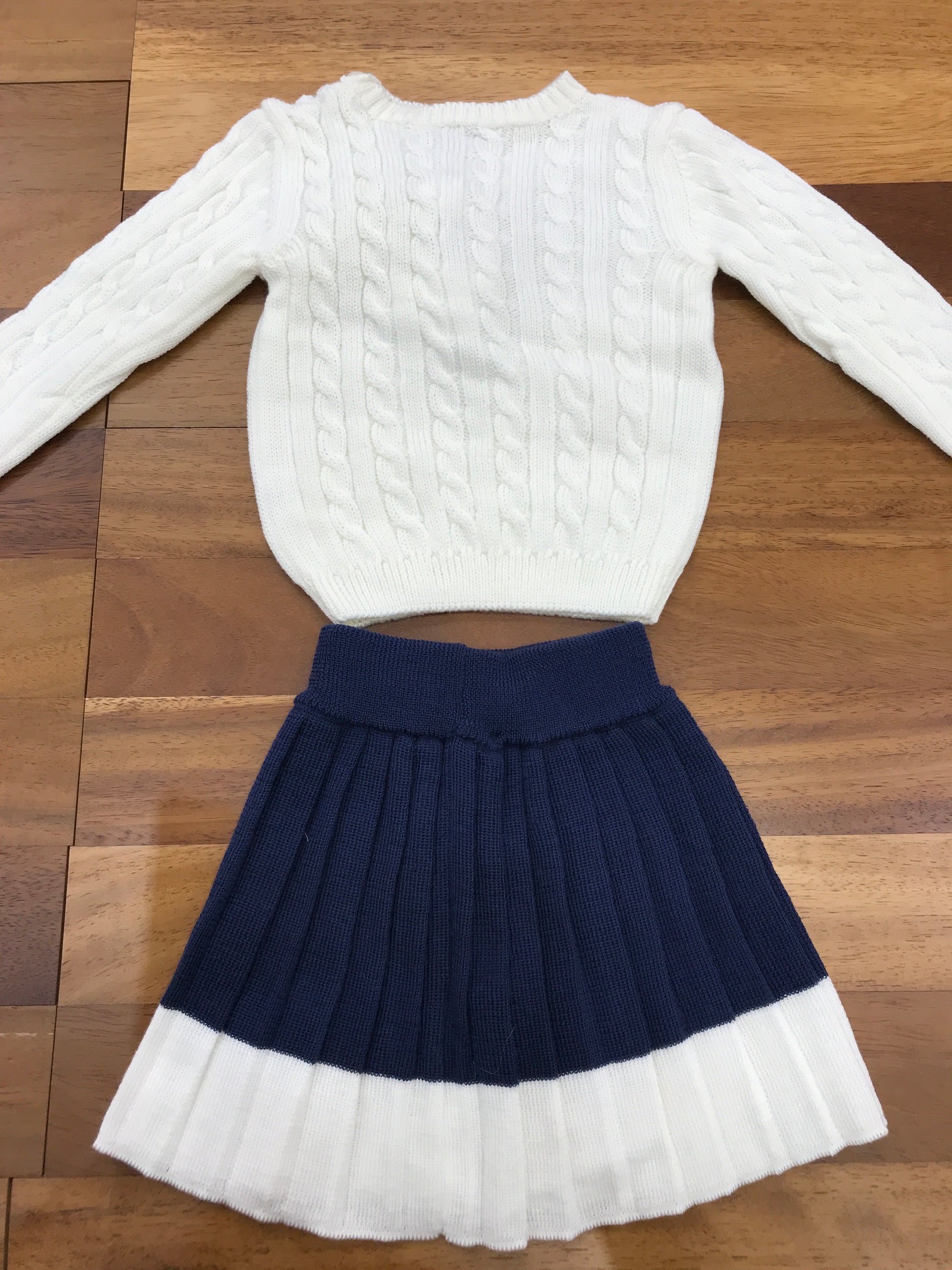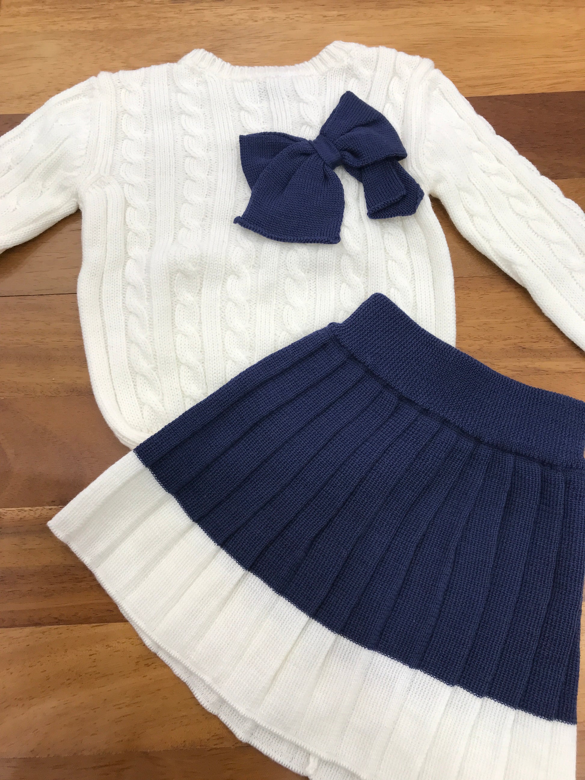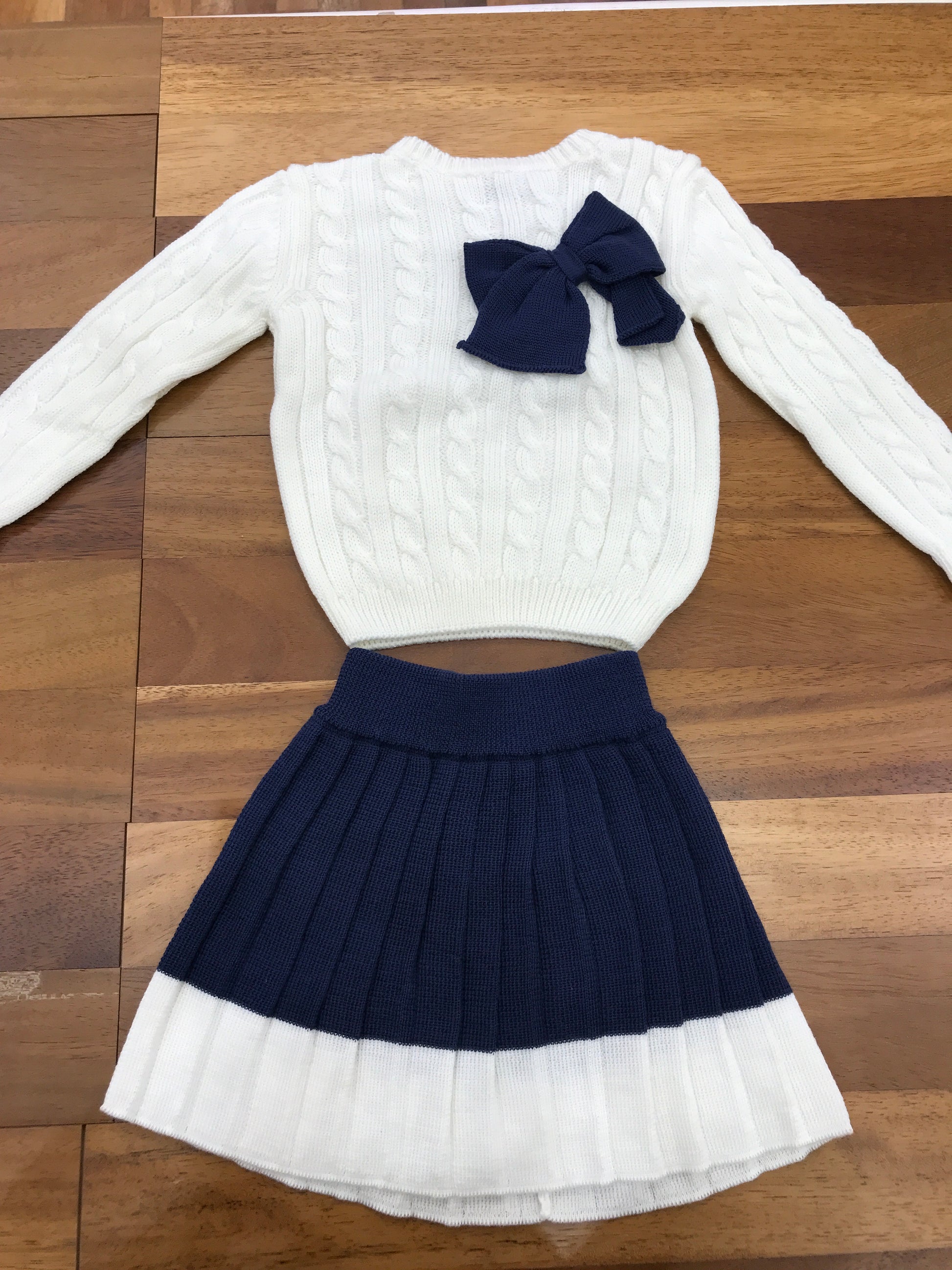 Completo in lana composto da due pezzi: una maglietta con dettagli a trecce e un fiocco decorativo, abbinata a una gonnellina coordinata.
