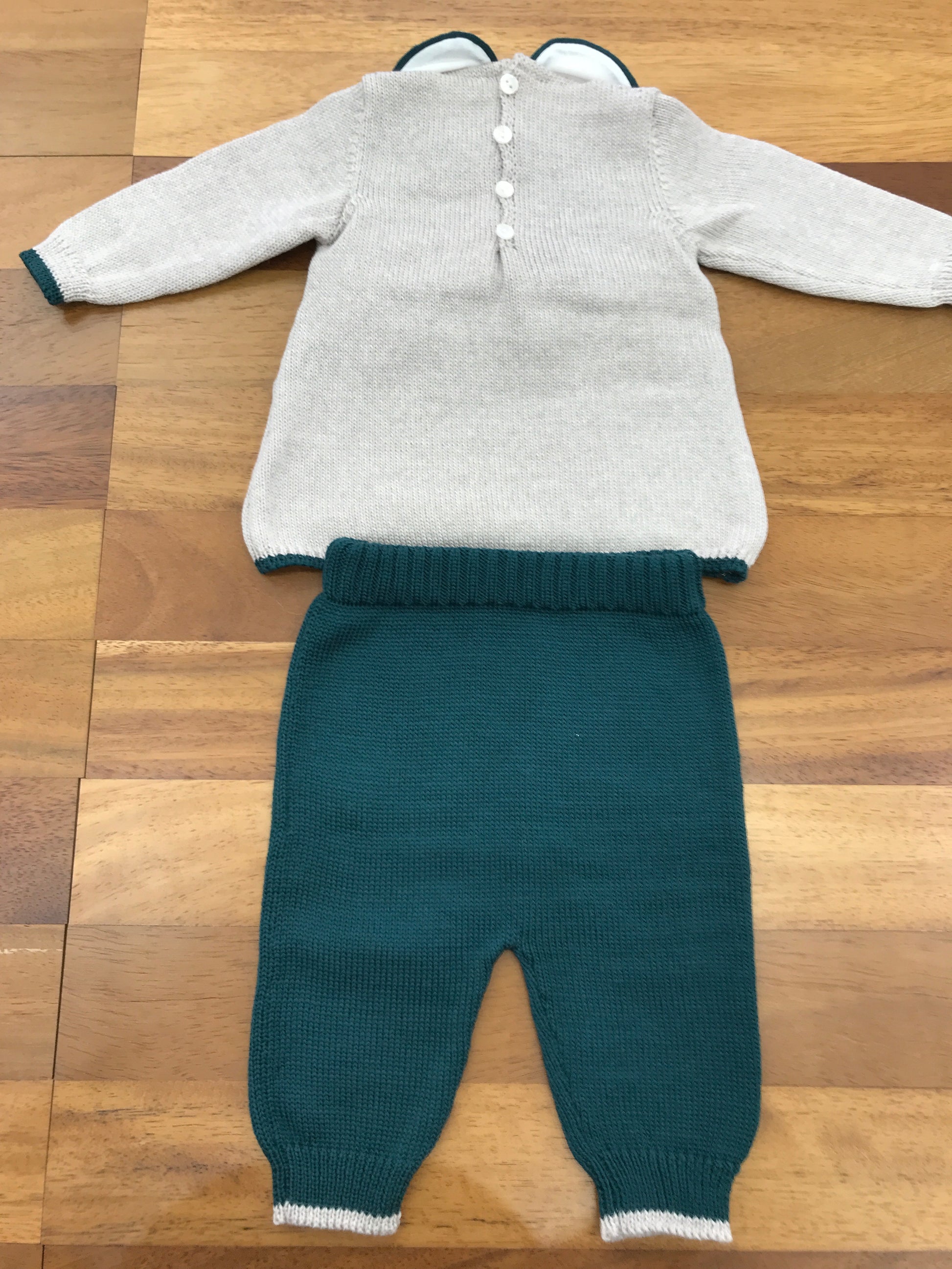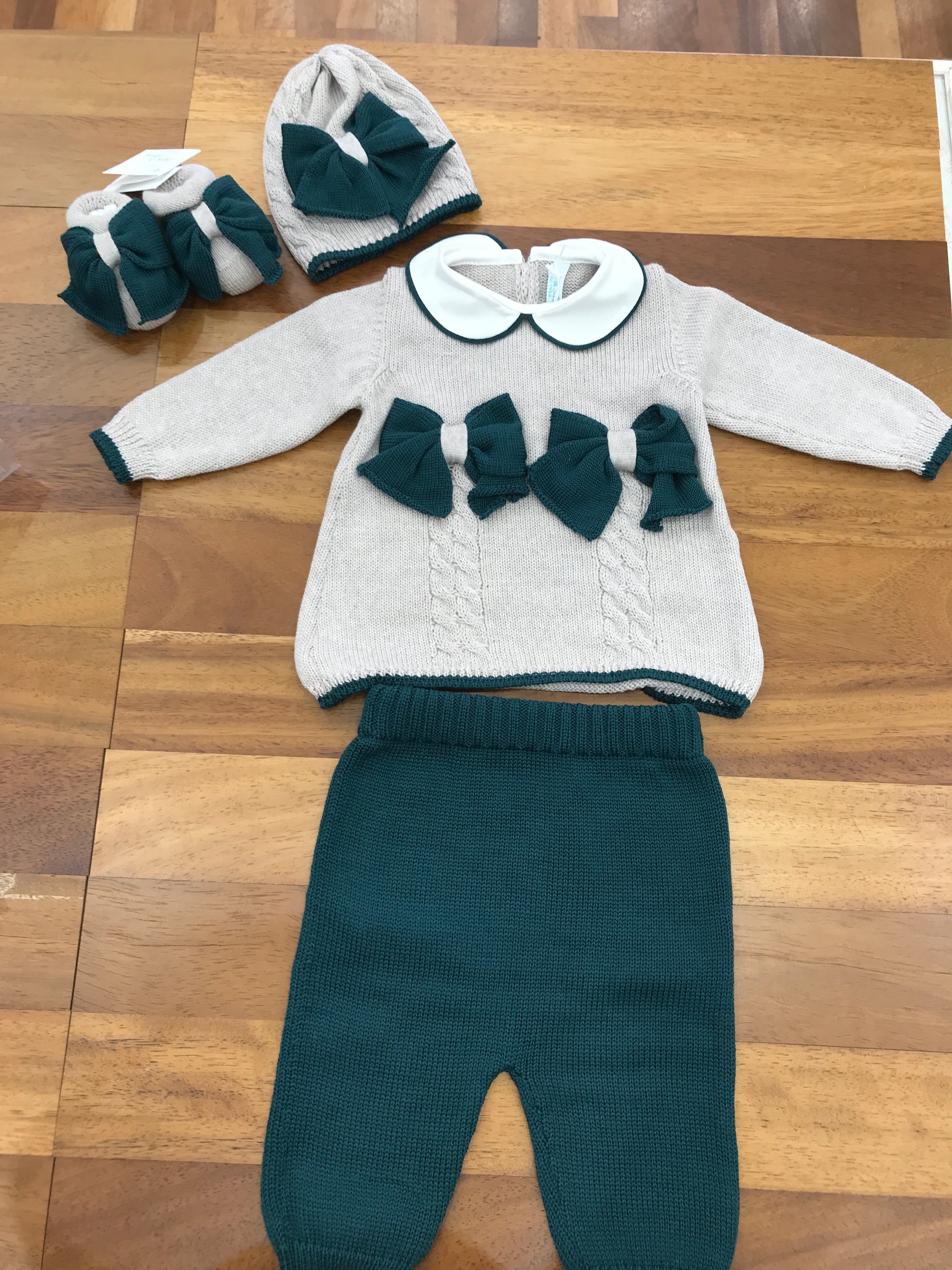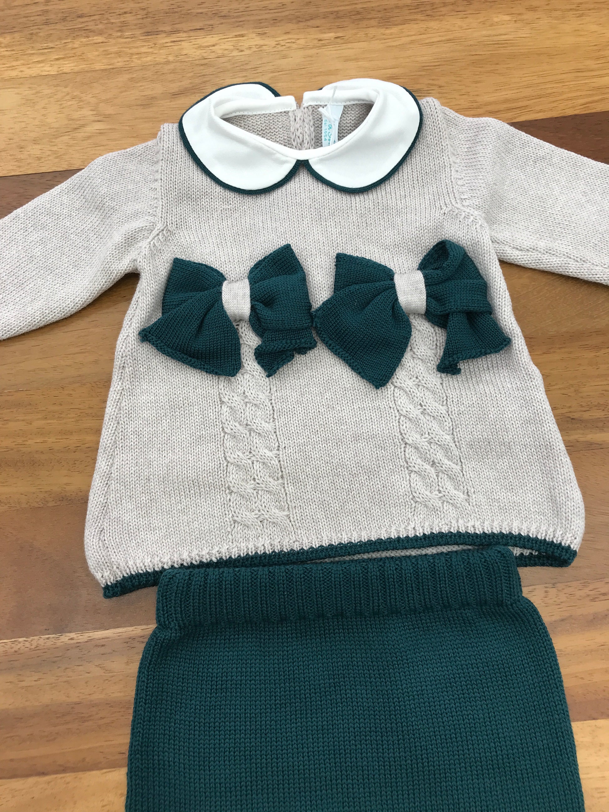 Completo in lana composto da due pezzi: maglia con collo tondo rifinito e due fiocchi bicolore al centro, abbinata a pantaloni lisci senza piedini.