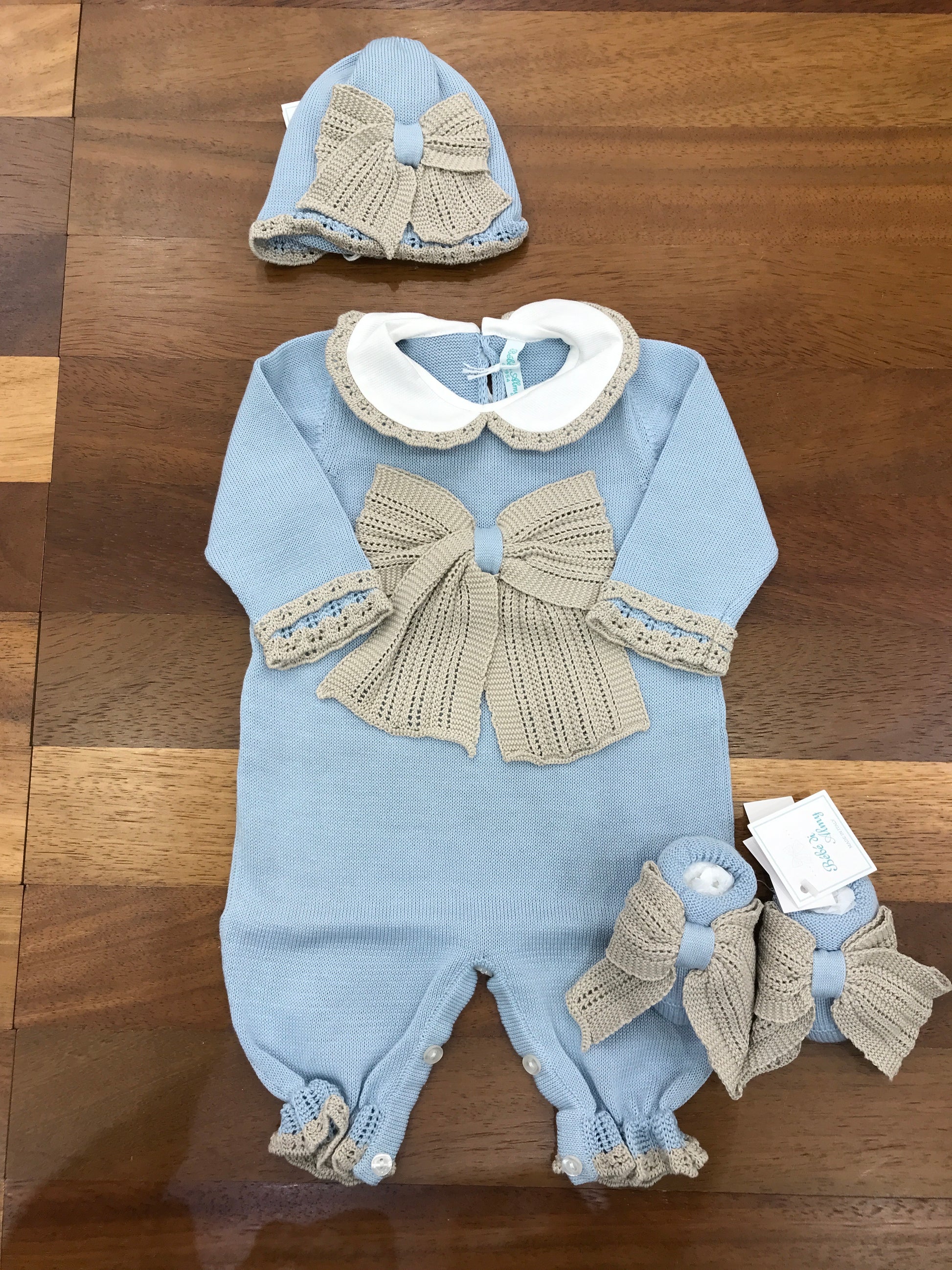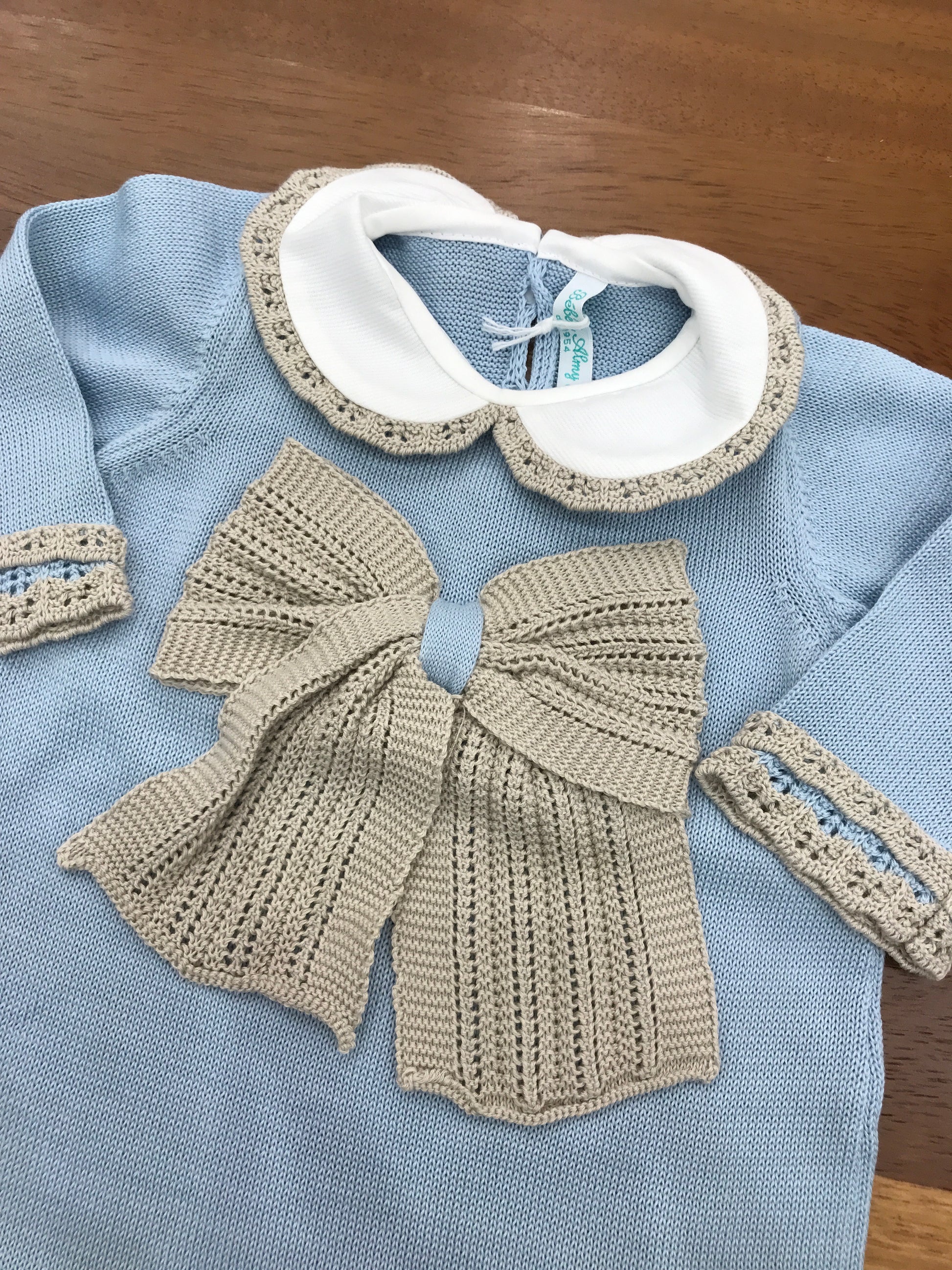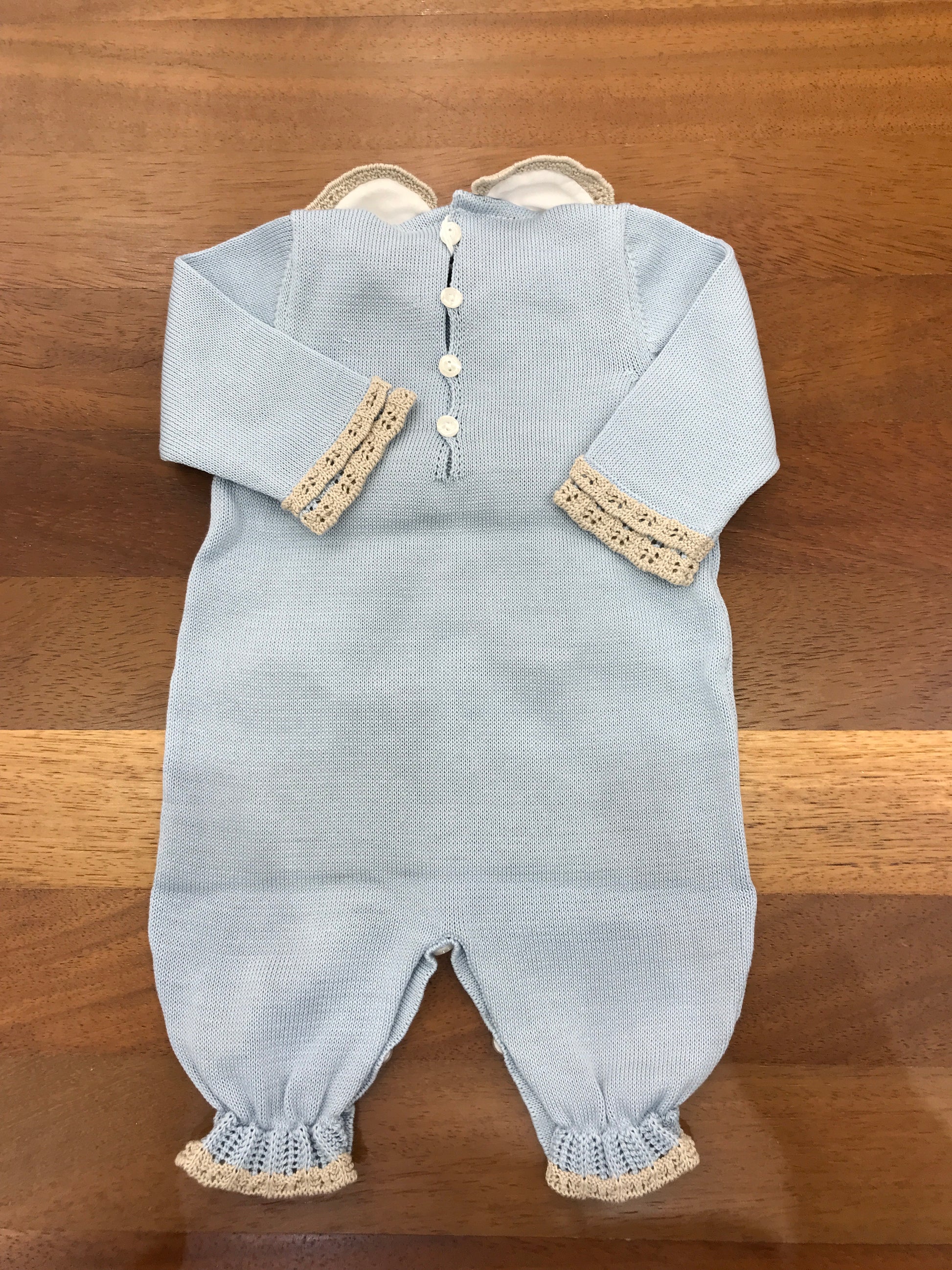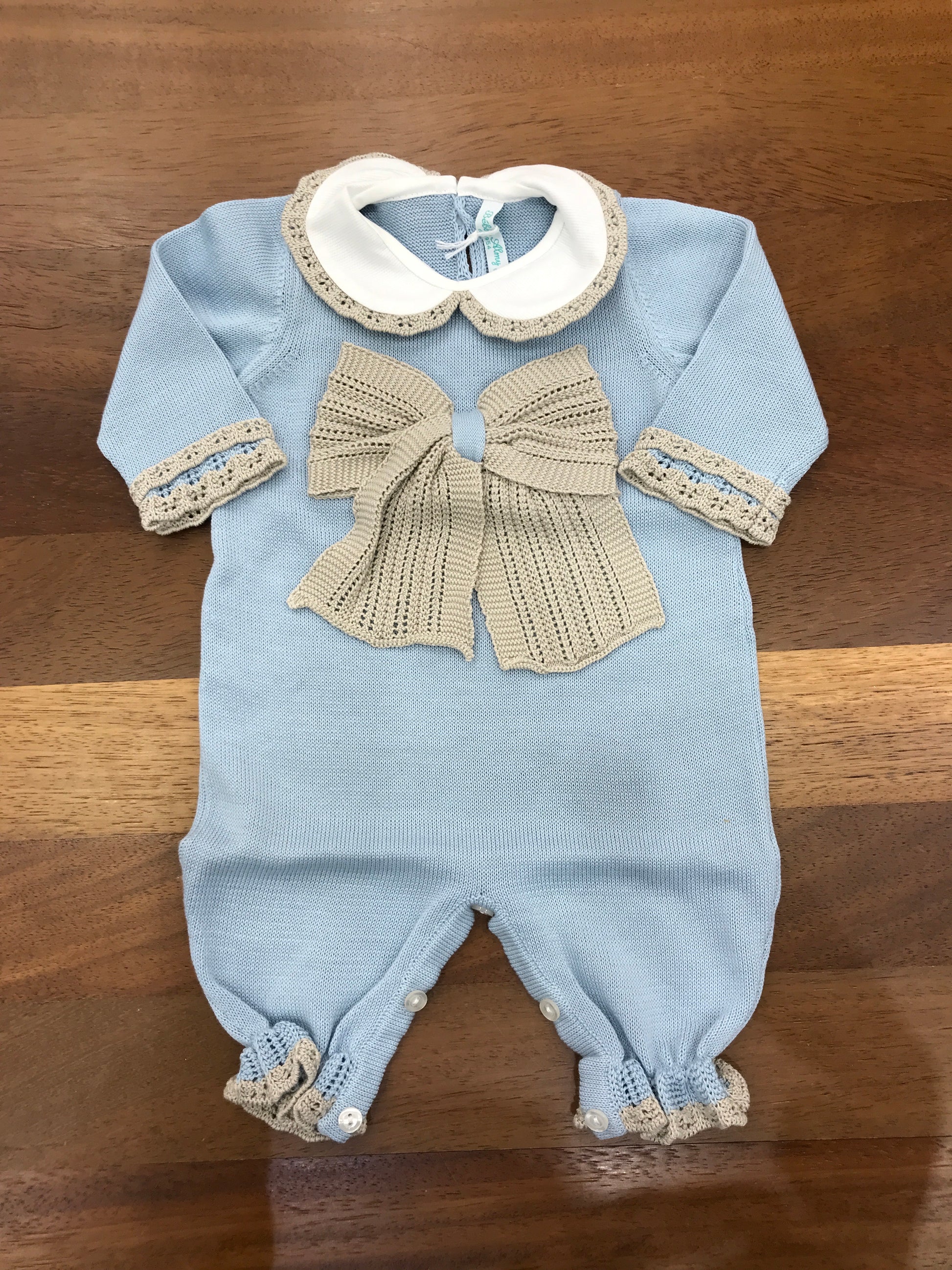 Elegante tutina intera in pregiato filo di cotone dal delicato colore celeste. Caratterizzata da un raffinato fiocco tortora posizionato al centro, la tutina presenta polsini alle maniche e alle gambine rifiniti con arricciature e dettagli ricamati in tortora. Il colletto bianco, anch'esso impreziosito da ricamo in tortora, completa una composizione che unisce semplicità e ricercatezza, ideale per i momenti speciali del vostro bambino.