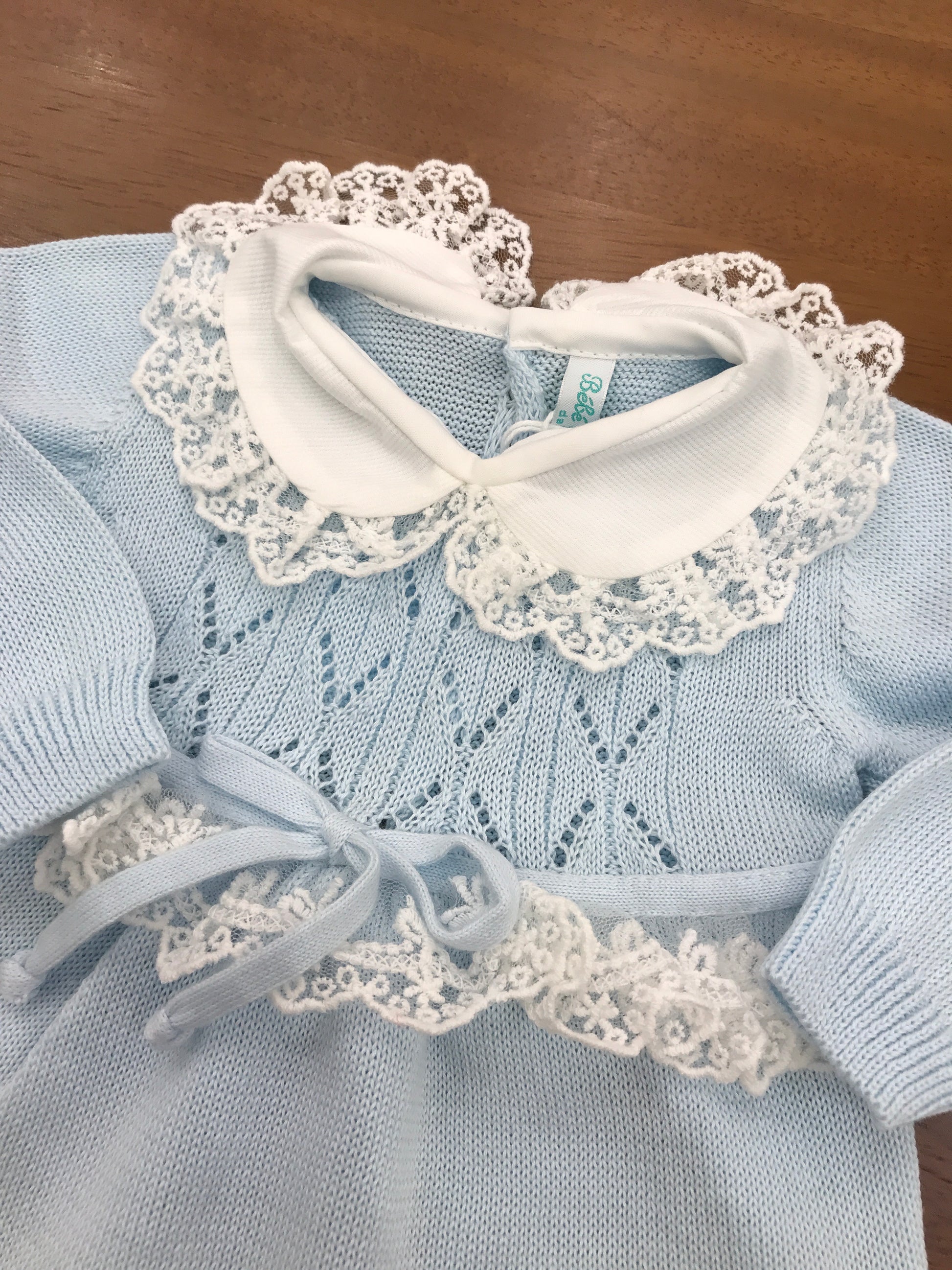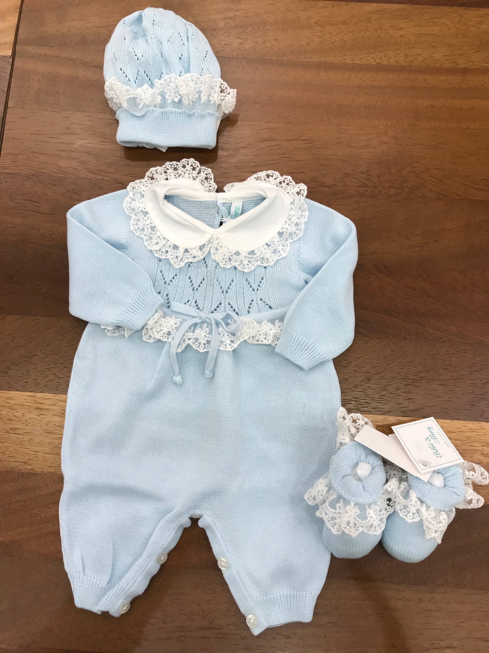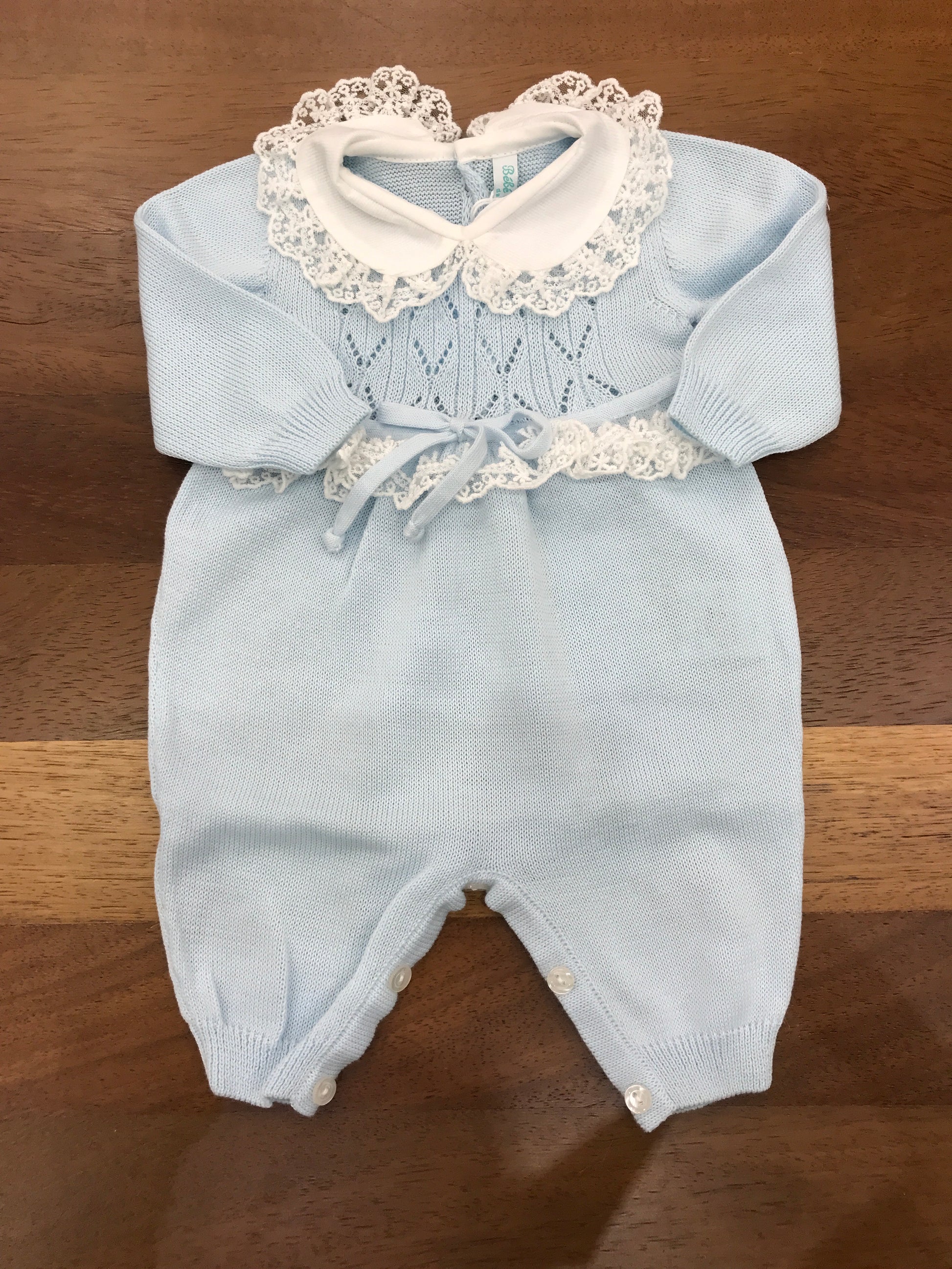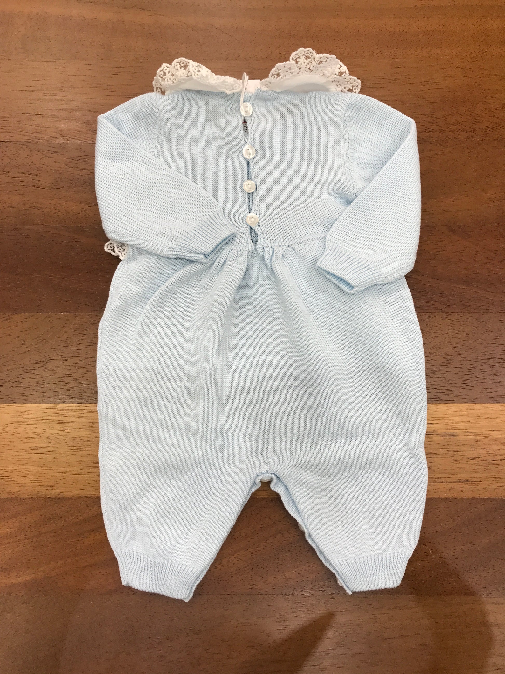 Delicato capo in cotone celeste per neonati, caratterizzato da una raffinata lavorazione ricamata sul petto e completato da una elegante valancienne bianca. Questa tutina intera combina comfort e stile, ideale per le occasioni speciali dei più piccoli. La qualità costruttiva garantisce morbidezza e traspirabilità, mentre i dettagli ricercati la rendono un pezzo versatile nel guardaroba del bebè.