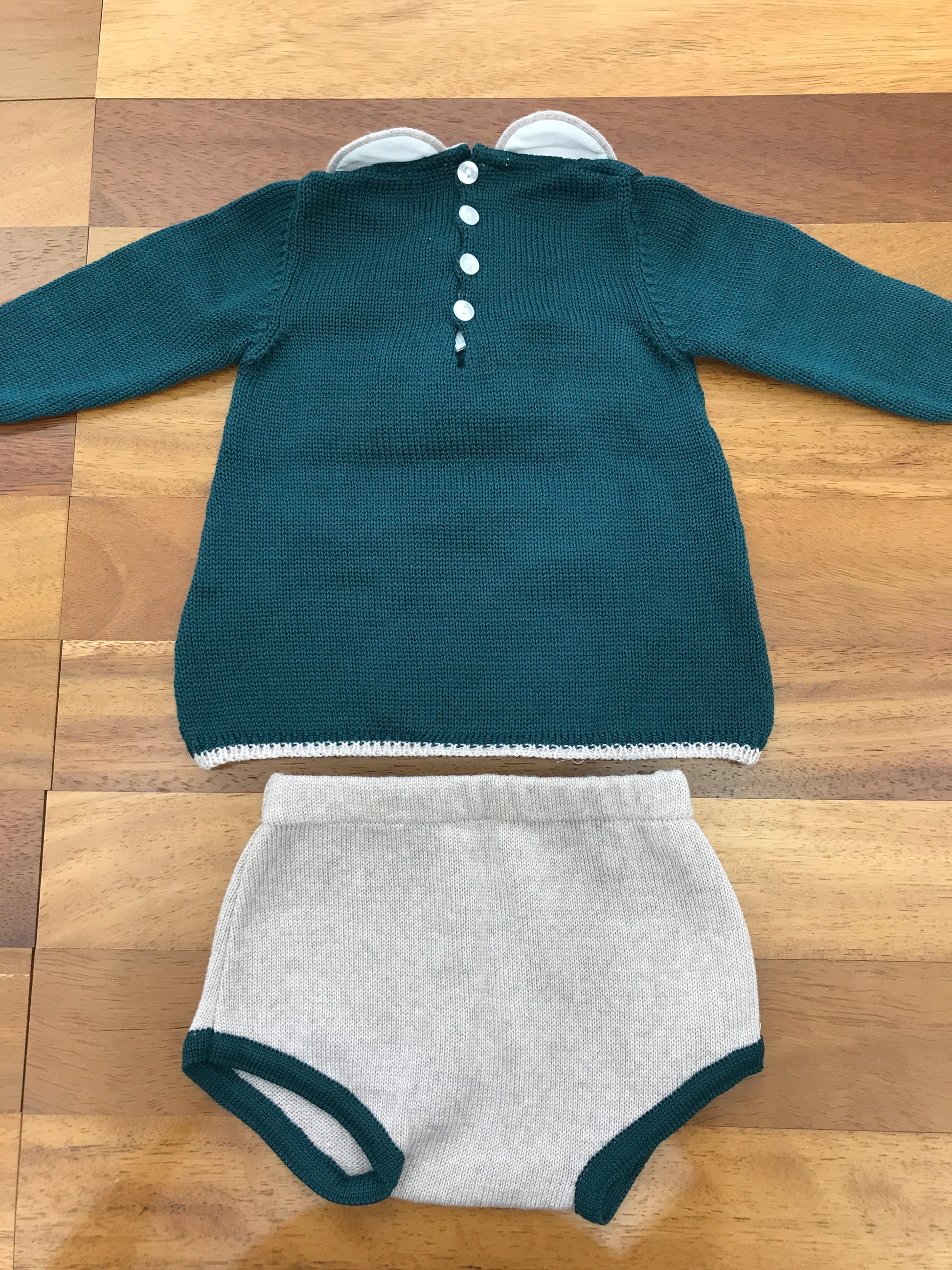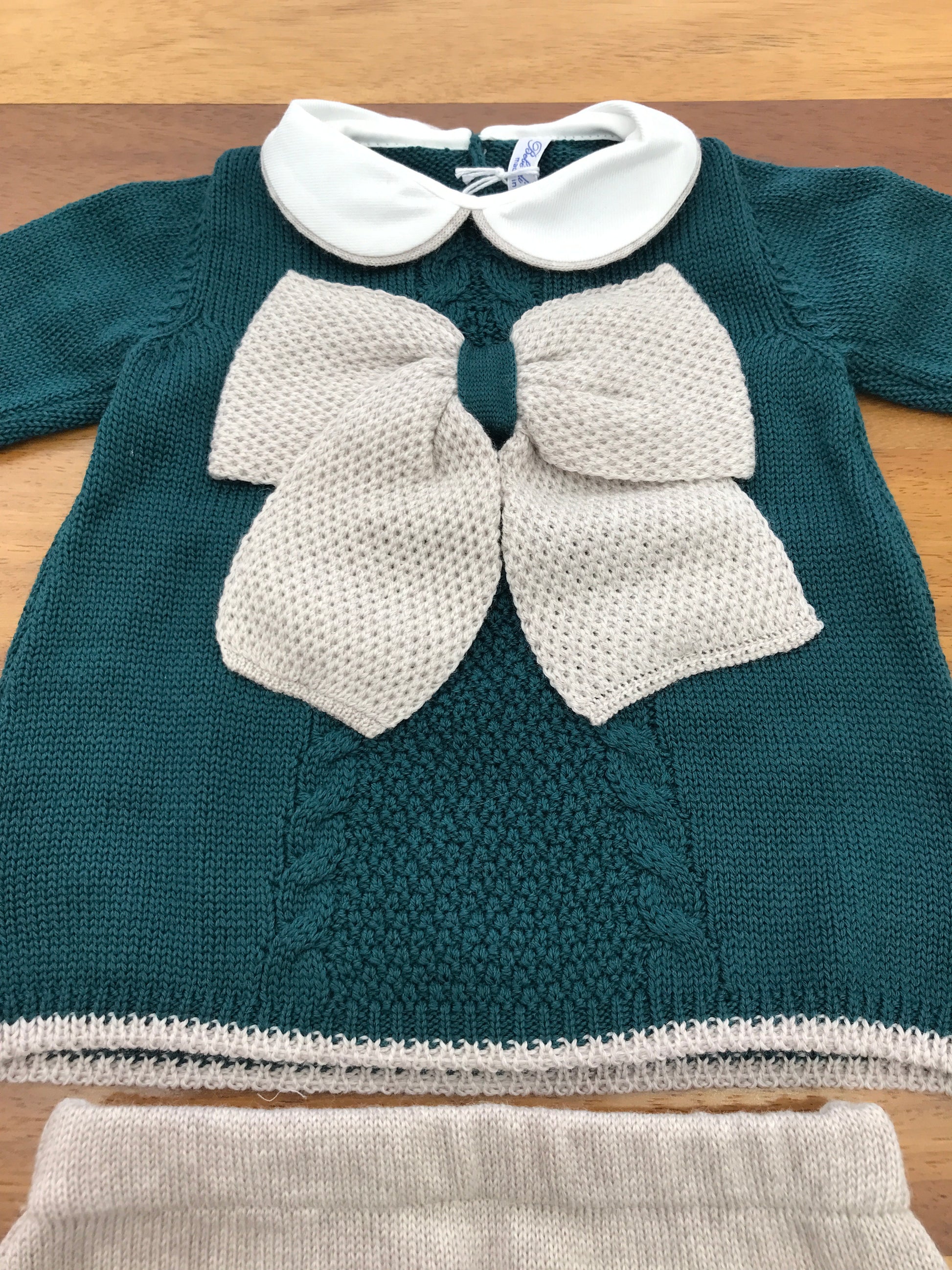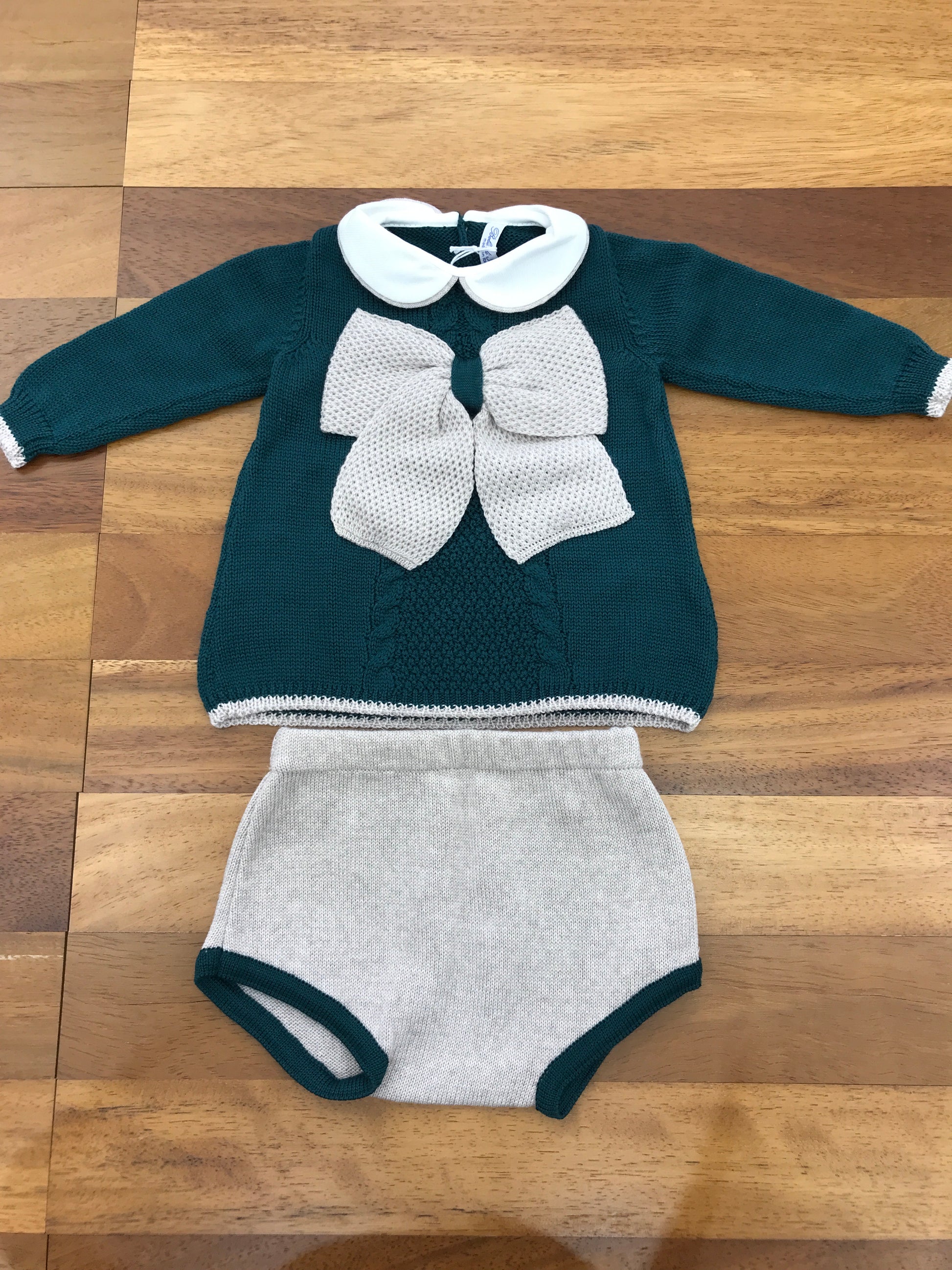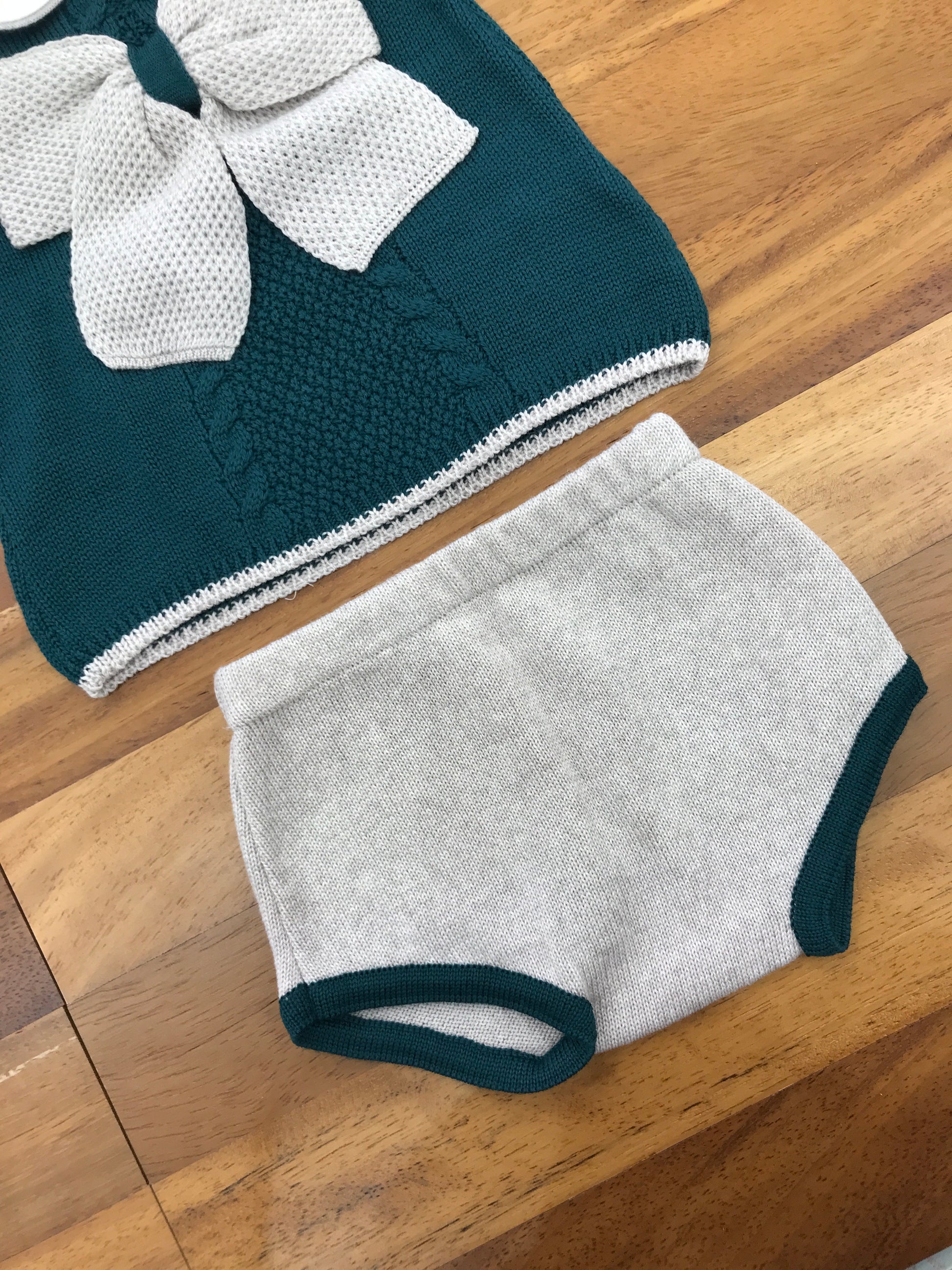 Completo due pezzi composto da una maglia con collo tondo e motivo a piramide intrecciata, arricchita da un grande fiocco centrale anch’esso intrecciato. La parte inferiore è una culotte semplice, sagomata con profili delicati lungo il giro gamba per garantire comfort e vestibilità ottimale.