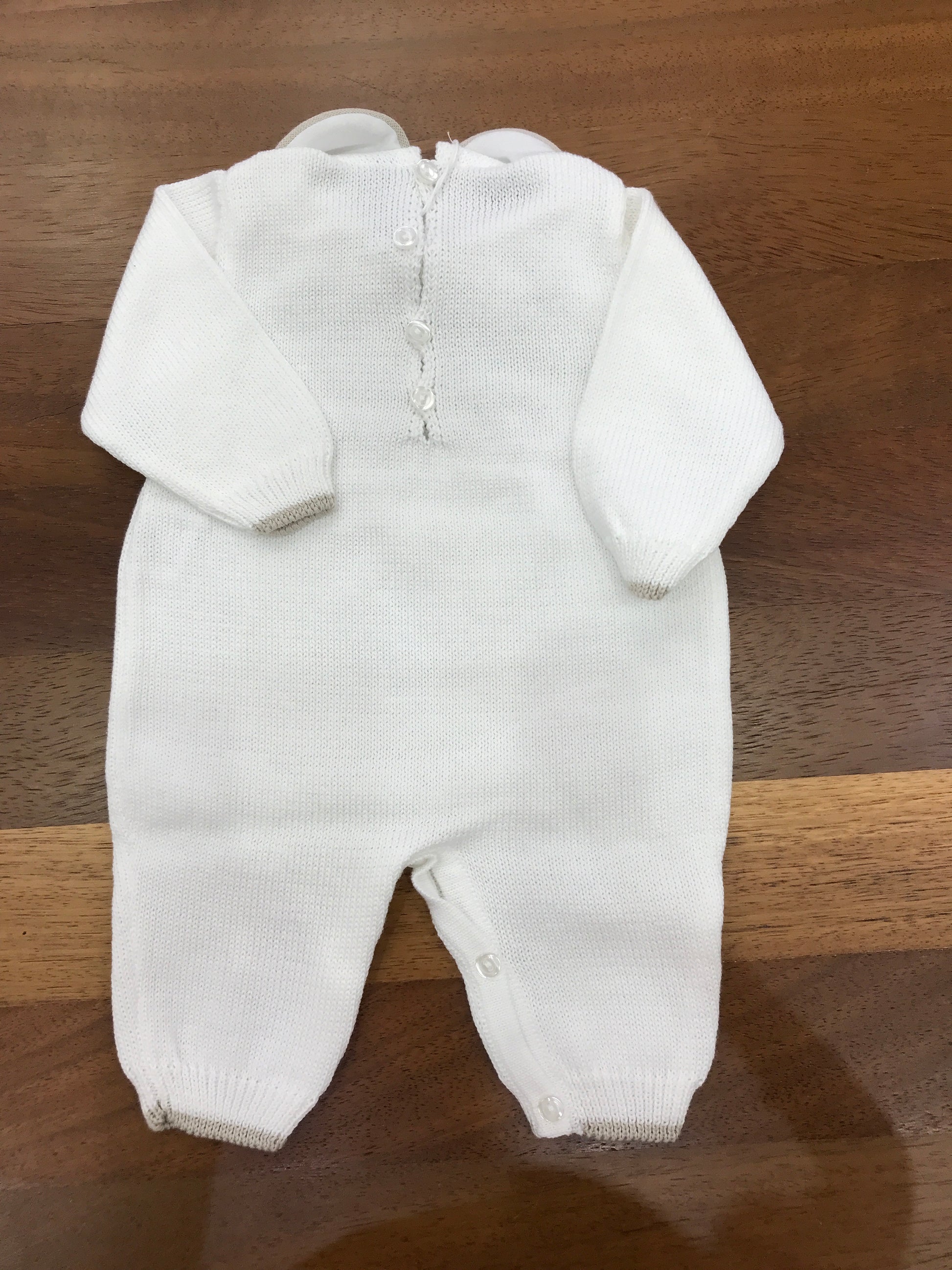 Elegante tutina intera realizzata in pregiato filo di cotone bianco, caratterizzata da un raffinato colletto con finitura in tonalità tortora. Il capo presenta un delicato punto smerletto centrale lavorato a mano, che conferisce un tocco di sofisticatezza e artigianalità al design. Perfetta per i piccoli, combina comfort e stile con dettagli curati nei minimi particolari.