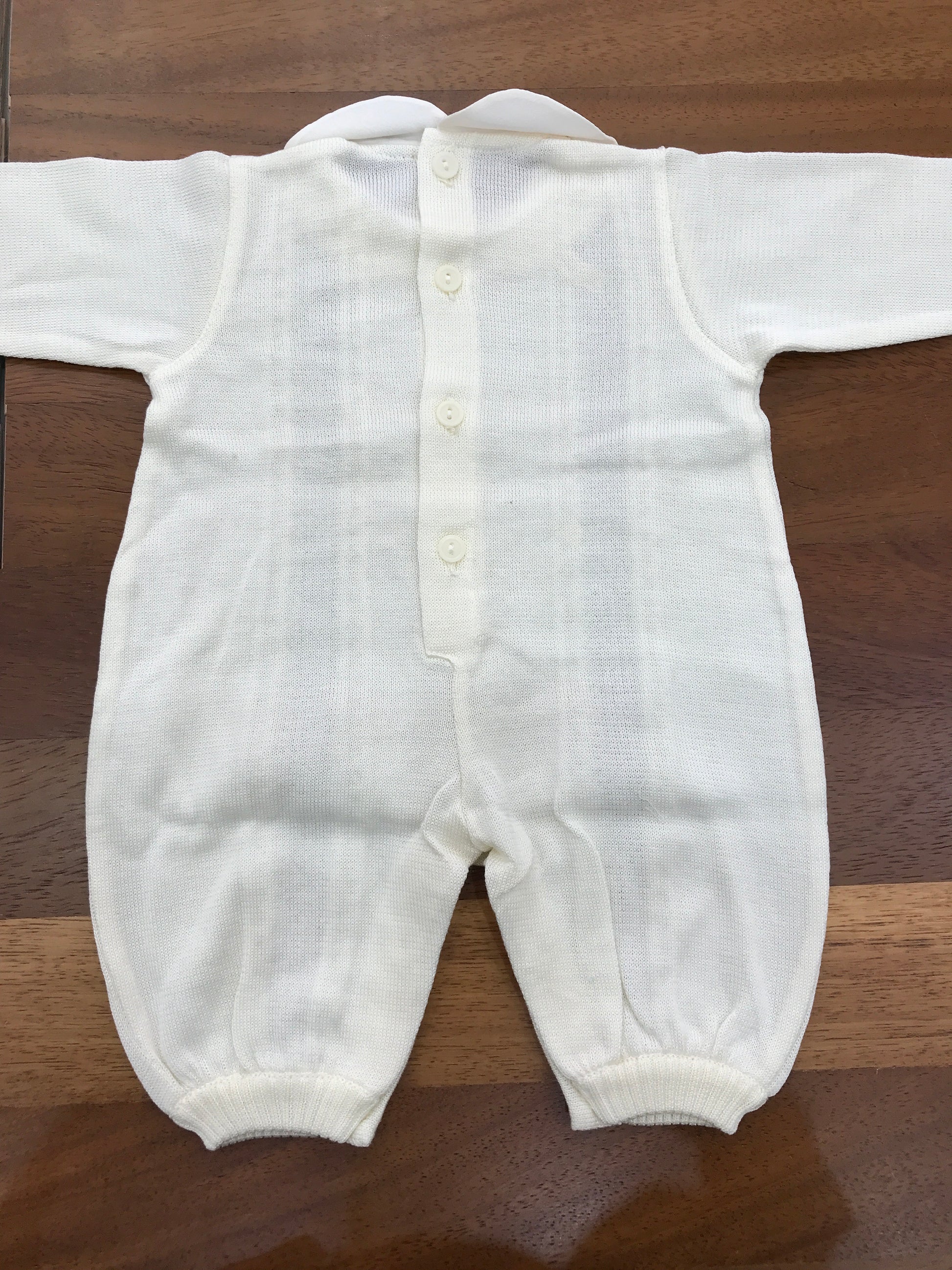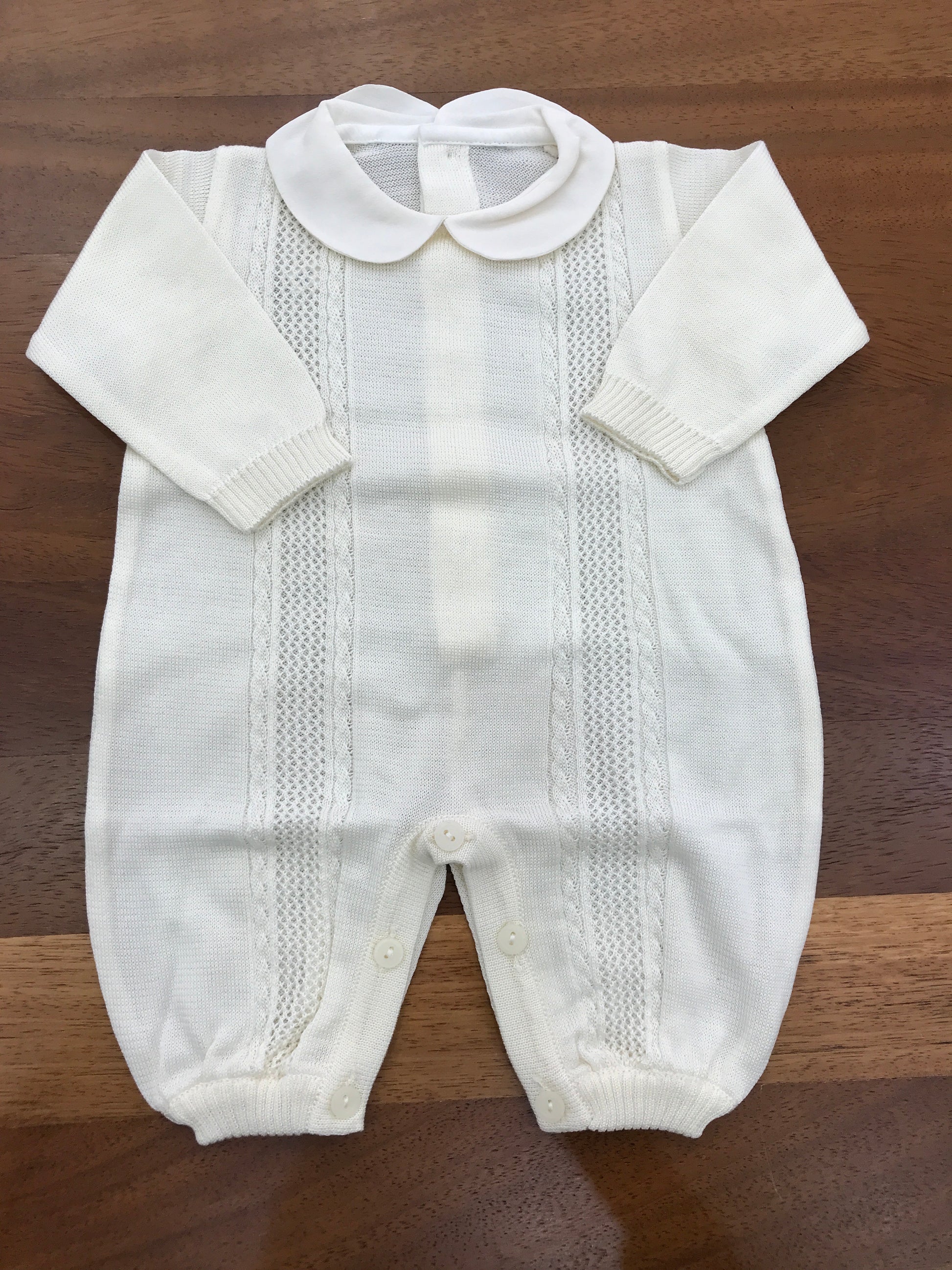 Tutina intera realizzata in pregiato filo di cotone nella delicata tonalità panna. Il capo si distingue per le raffinate traforature che decorano il fronte, conferendo eleganza e leggerezza al design. Una scelta sofisticata per i piccoli, che unisce comfort e stile con dettagli artigianali curati.