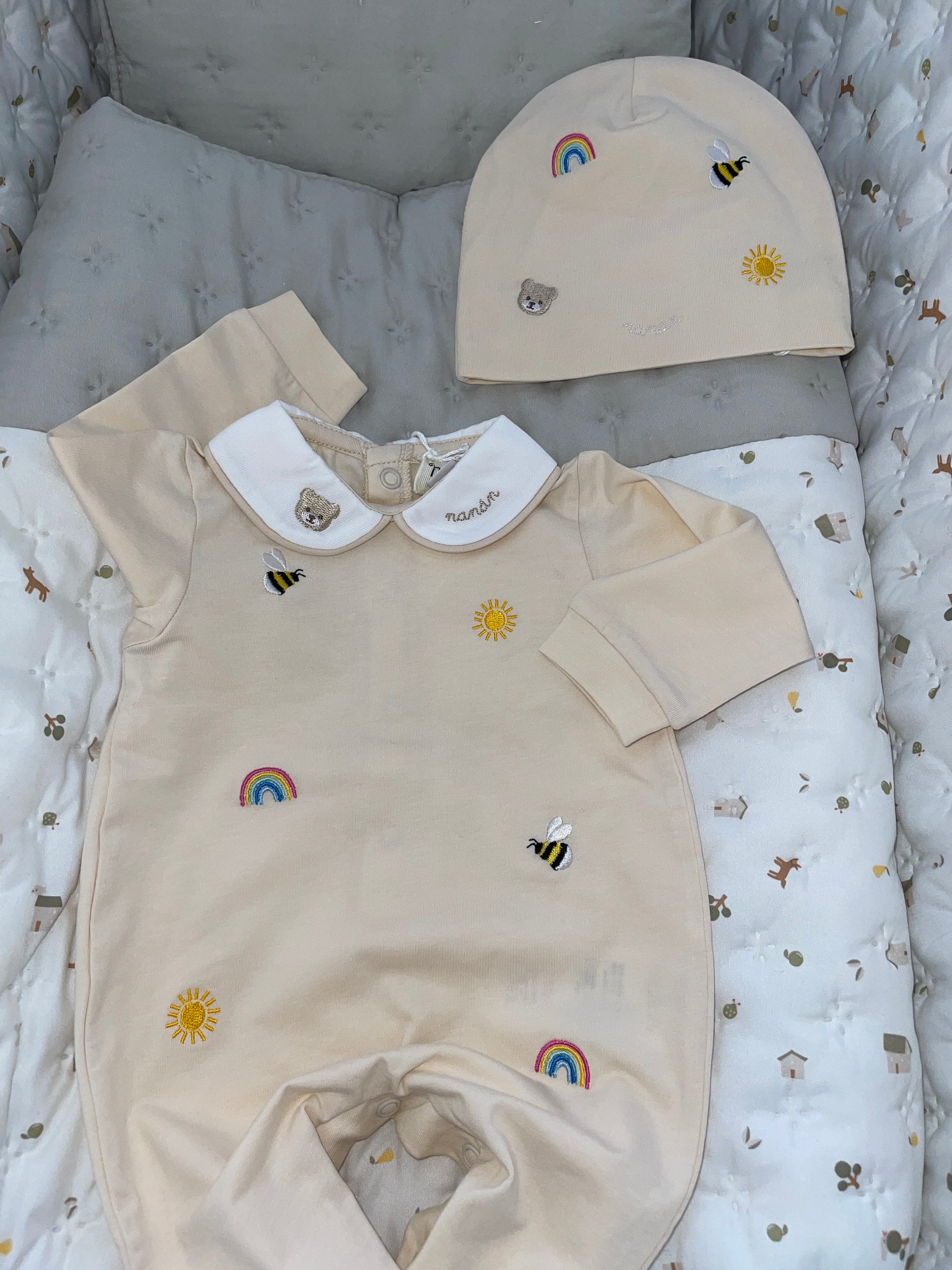 "La tutina beige in morbido cotone di Nanan, combinata con il suo cappellino, è la scelta perfetta per il confort e la dolcezza del tuo piccolo. I dettagli ricamati arcobaleno aggiungono un tocco di colore e allegria ad ogni outfit."