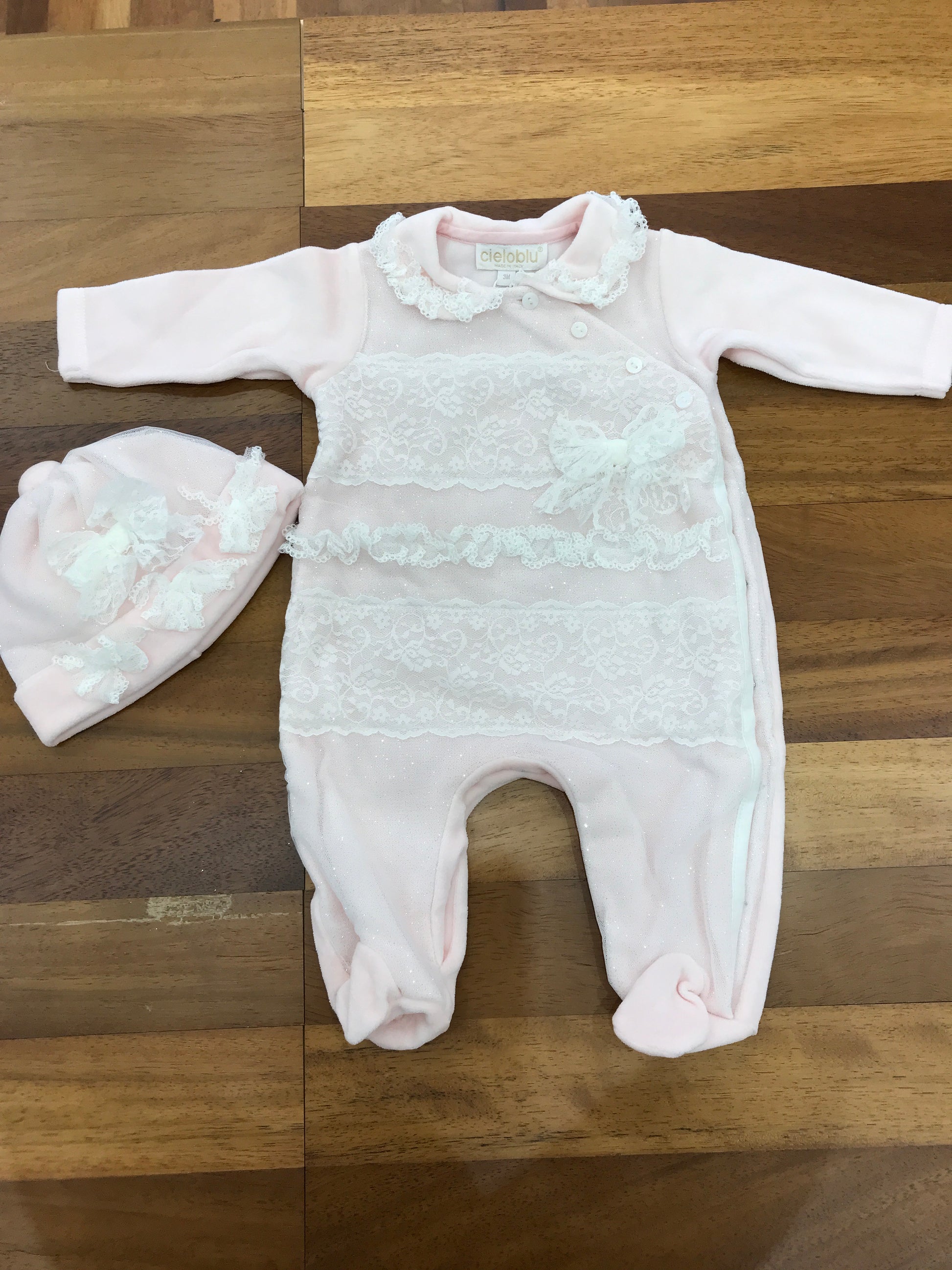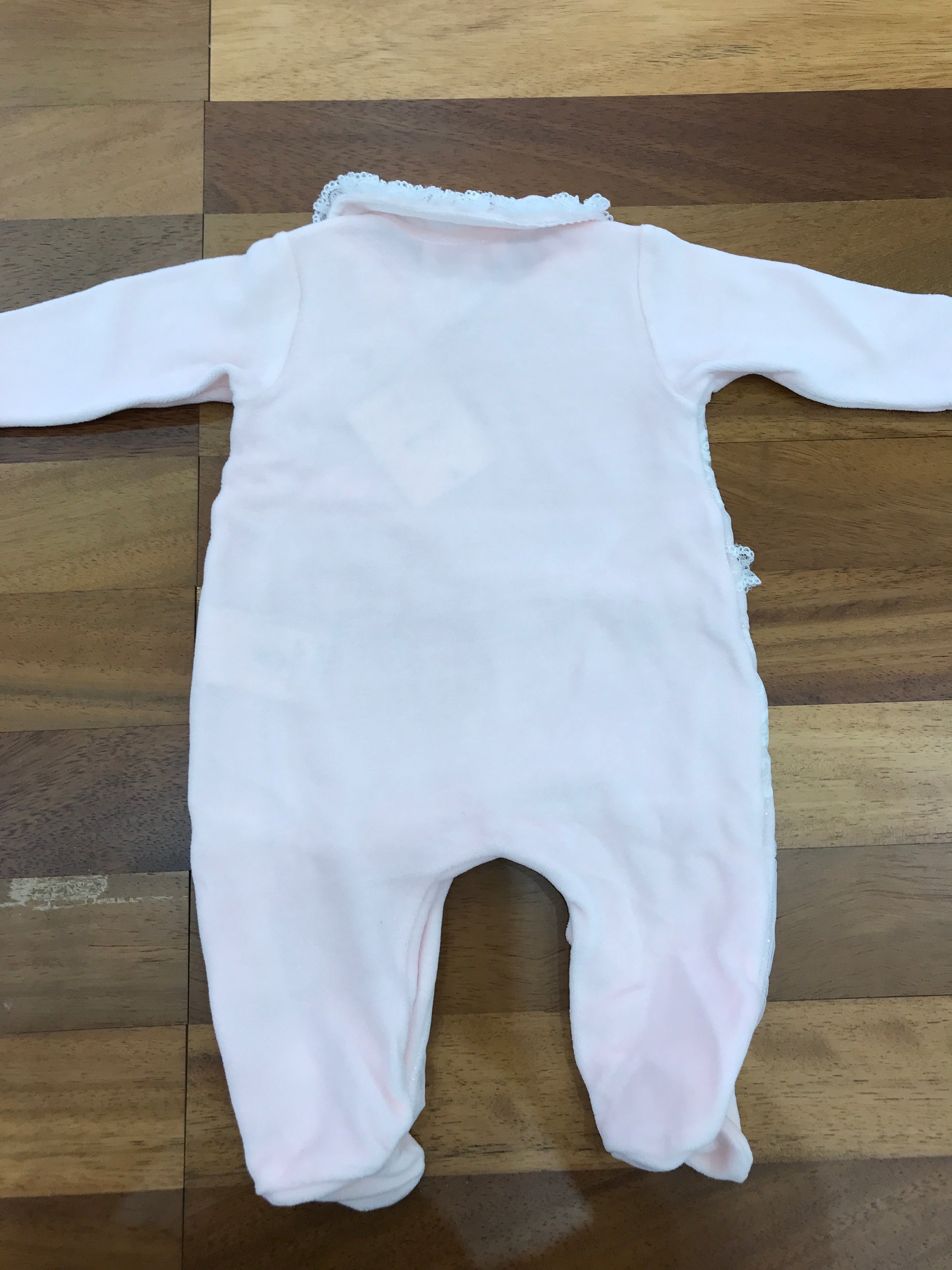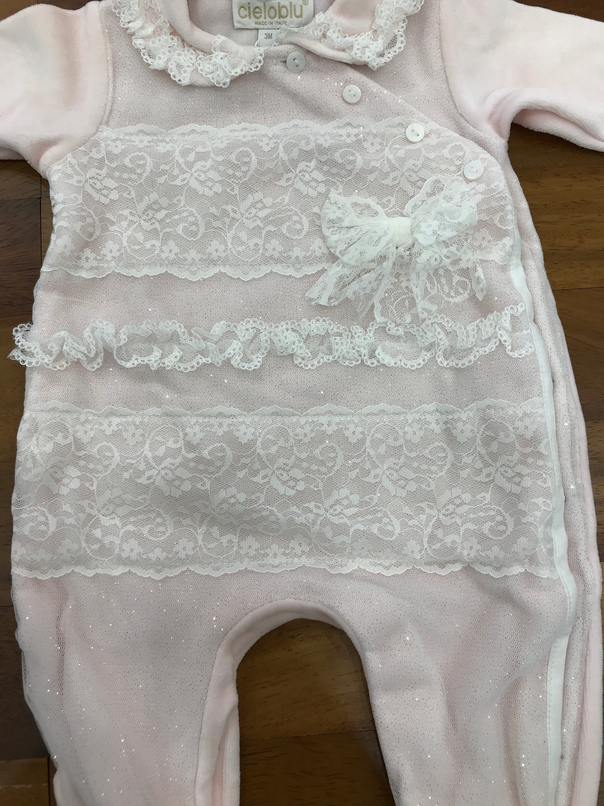 Intera tutina in ciniglia con piedini e colletto inclusi, decorata sul davanti da un delicato merletto ricamato e arricchita da fiocchetti in merletto ricamato, completata da una raffinata applicazione di brillantini.