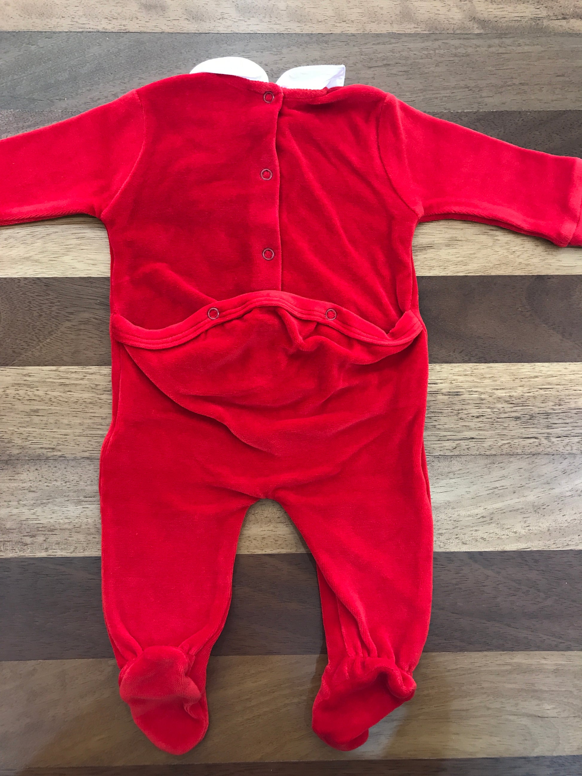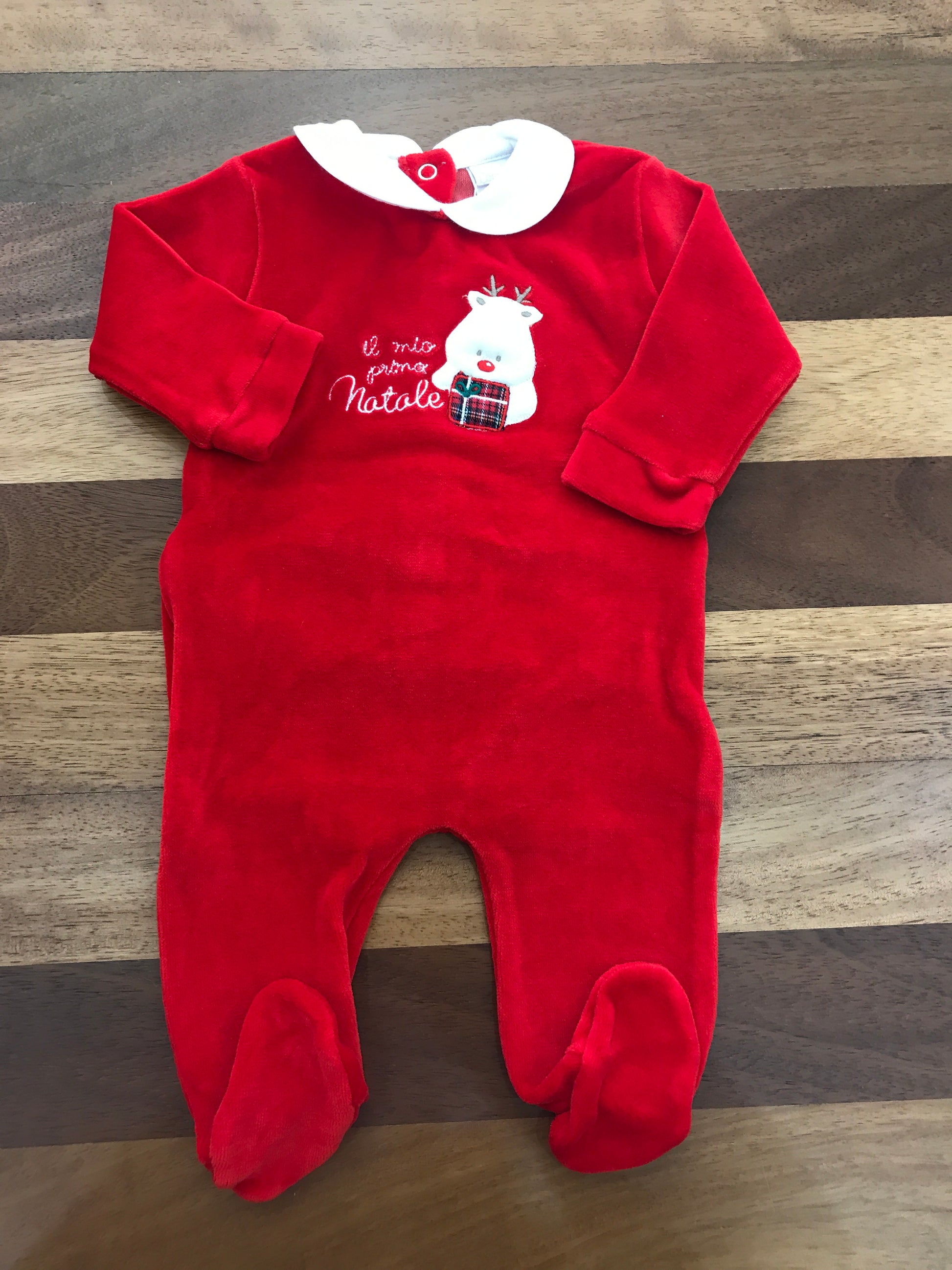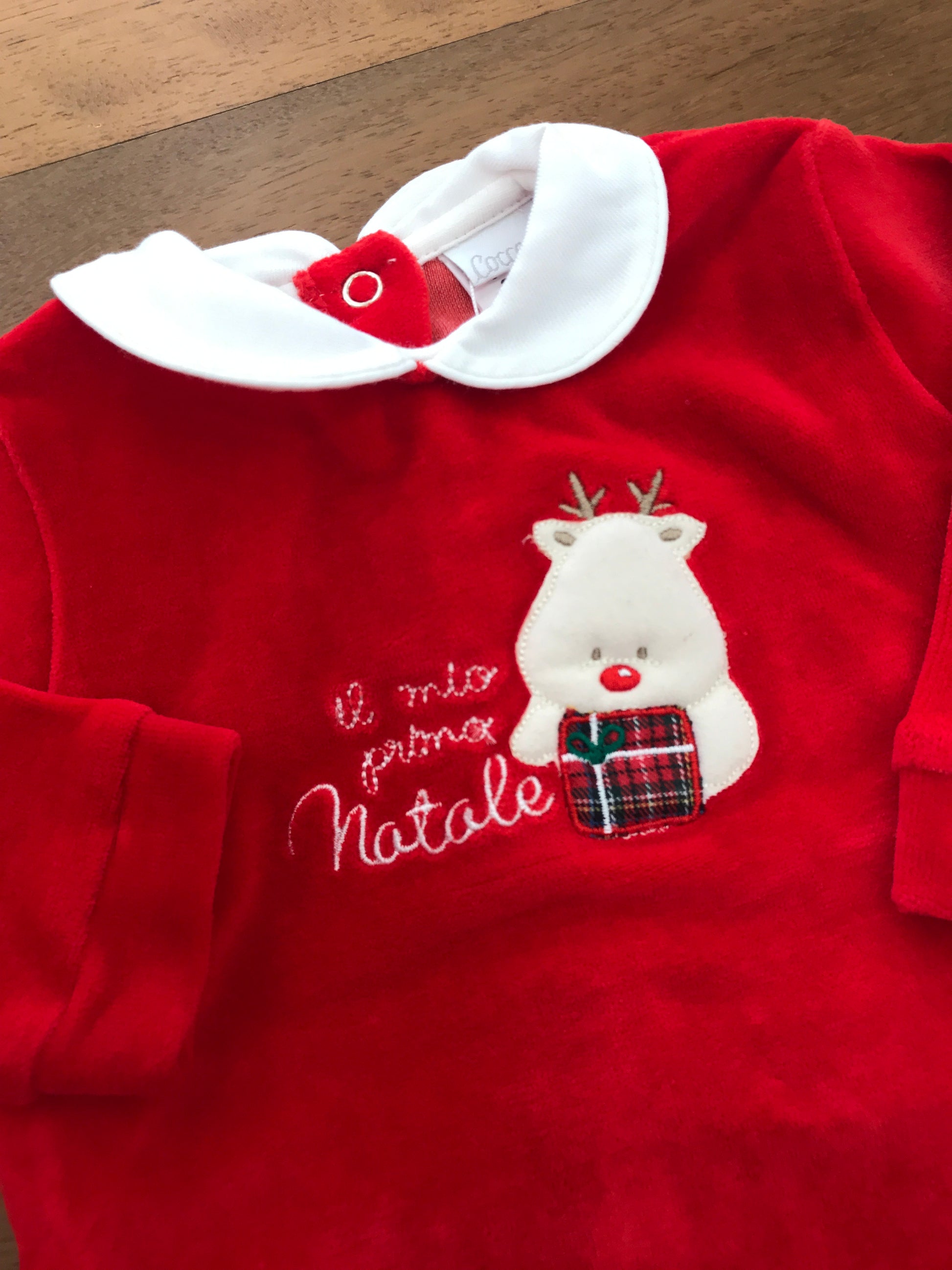 Raffinata tutina intera in morbida ciniglia rossa, ideale per le festività natalizie. Caratterizzata da comodi piedini integrati e un elegante colletto bianco, presenta una decorazione centrale con scritta "Il mio primo Natale" accompagnata da un delicato orsetto renna. Un capo perfetto per celebrare il primo Natale del vostro bambino con stile e calore.