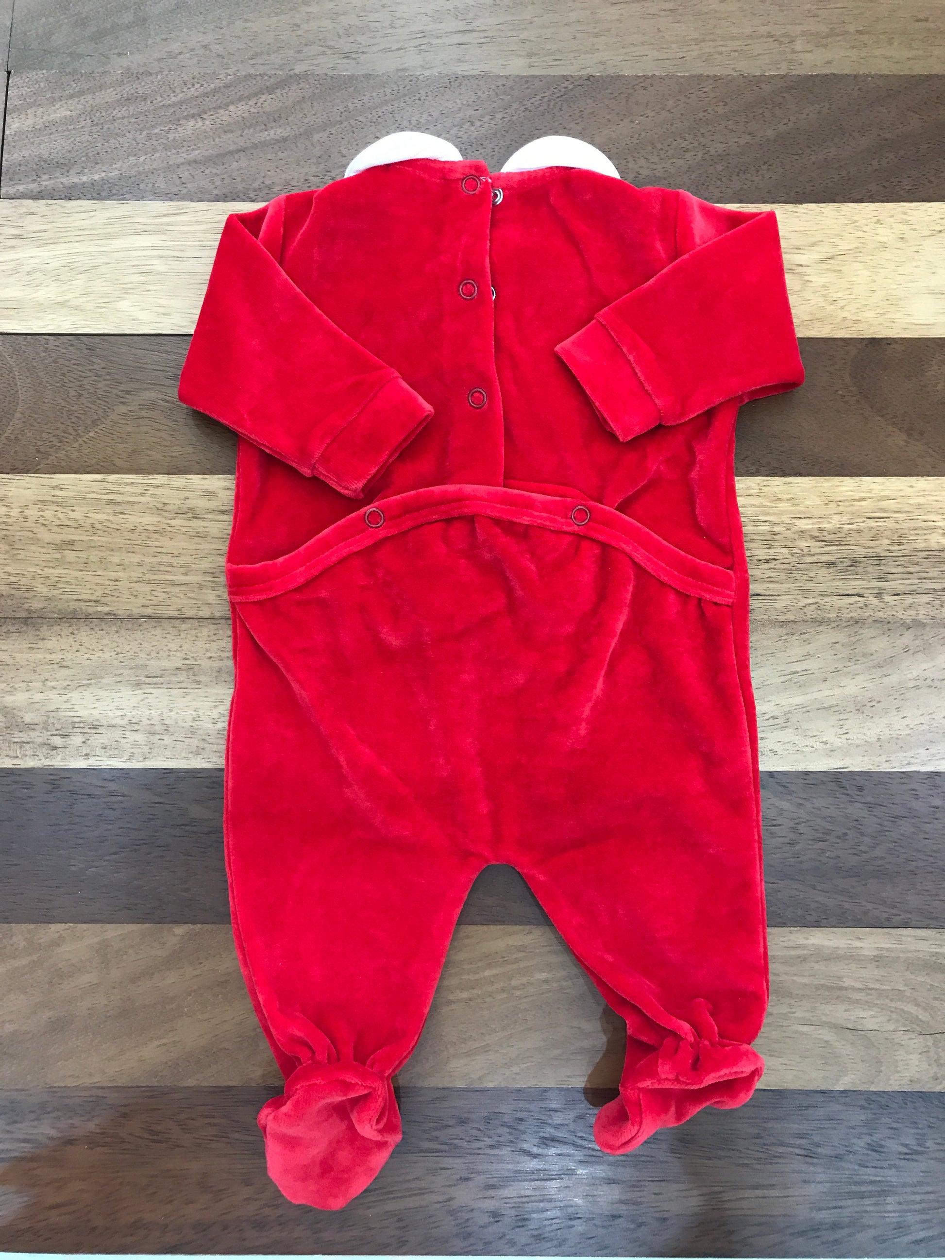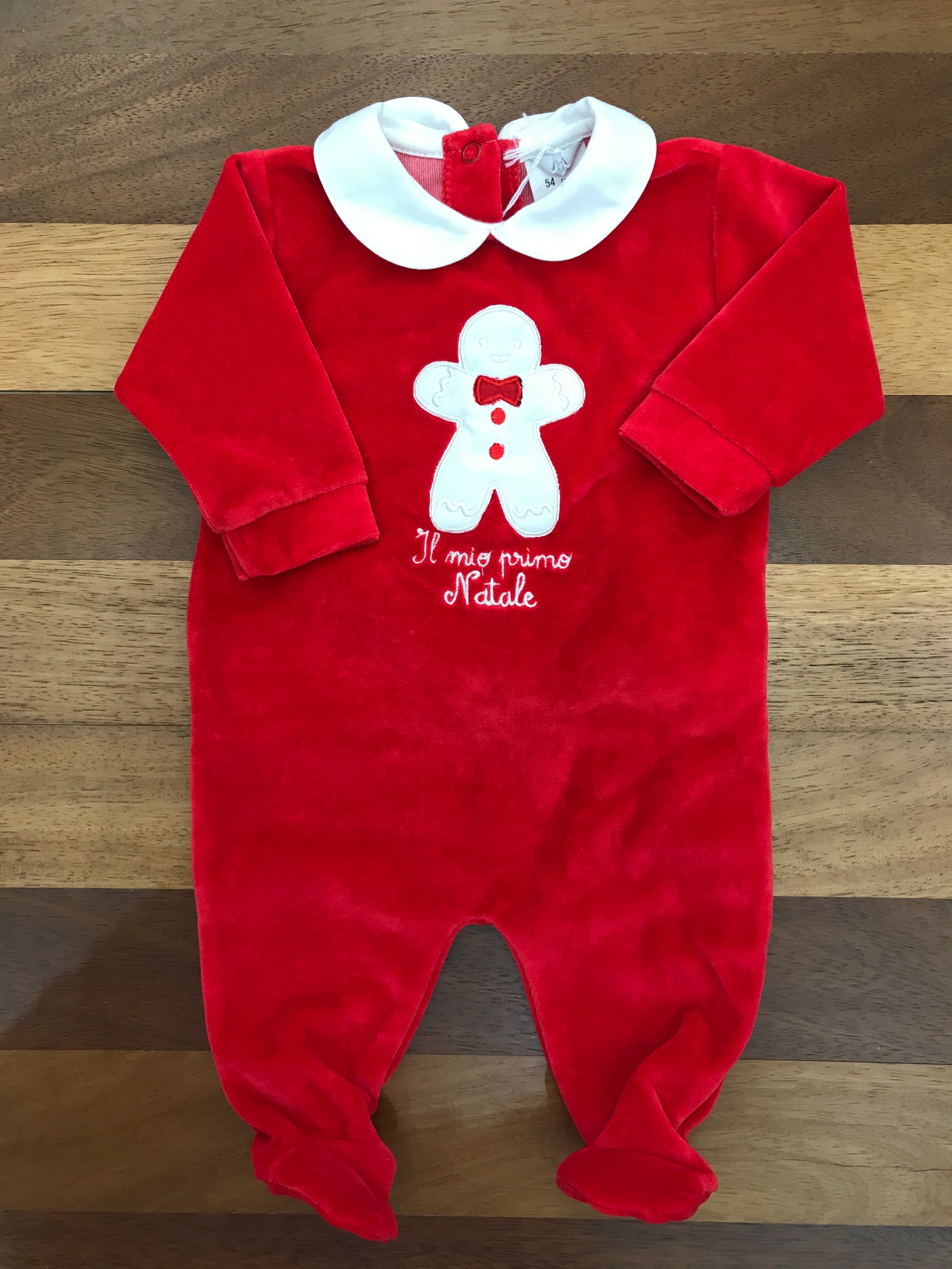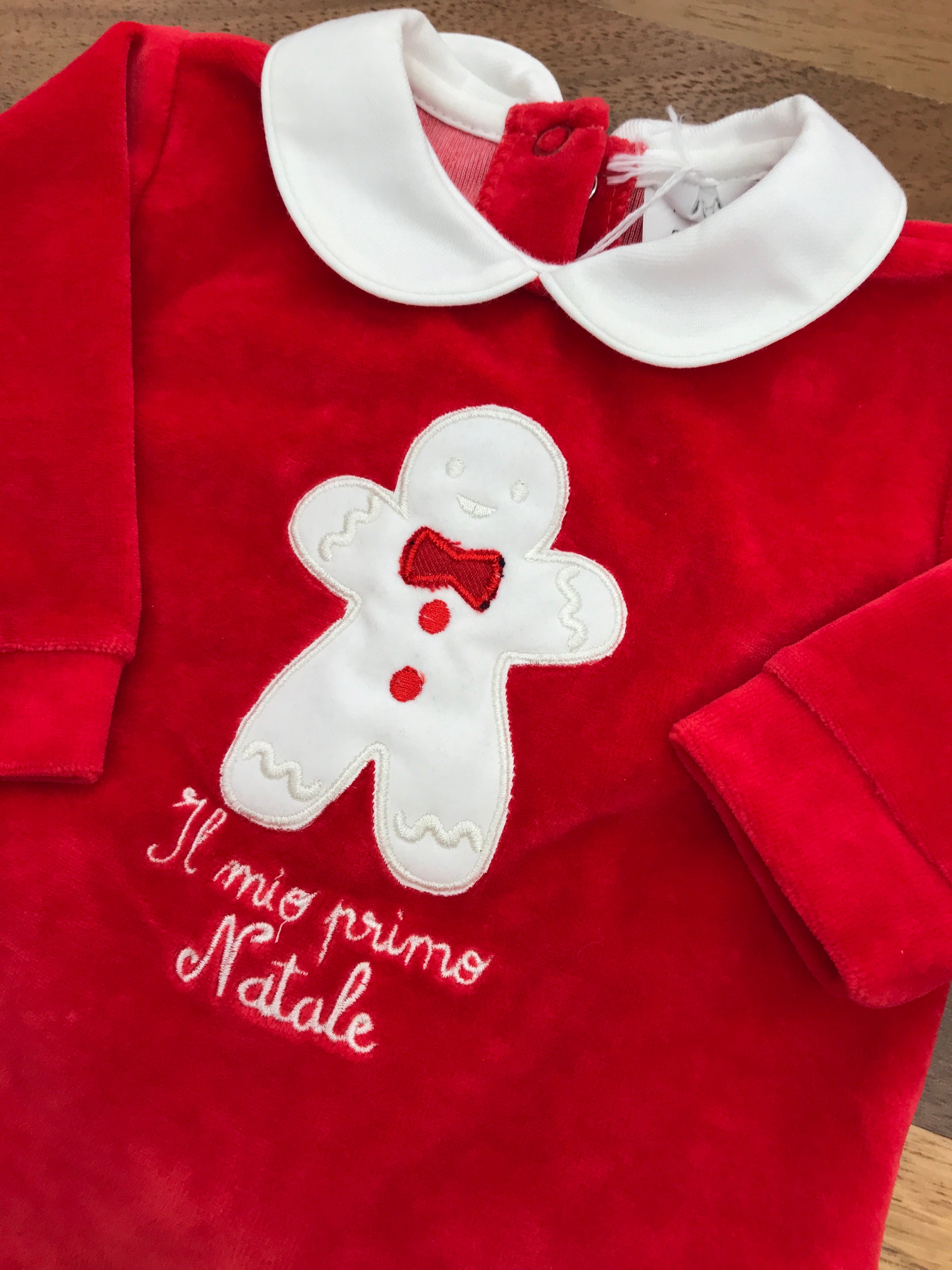Elegante tutina intera realizzata in morbida ciniglia rossa, completa di piedini integrati e raffinato colletto bianco. Arricchita dal caratteristico omino di Marza Pane in bianco, questo capo combina comfort e stile con dettagli ricercati che lo rendono perfetto per i piccoli.