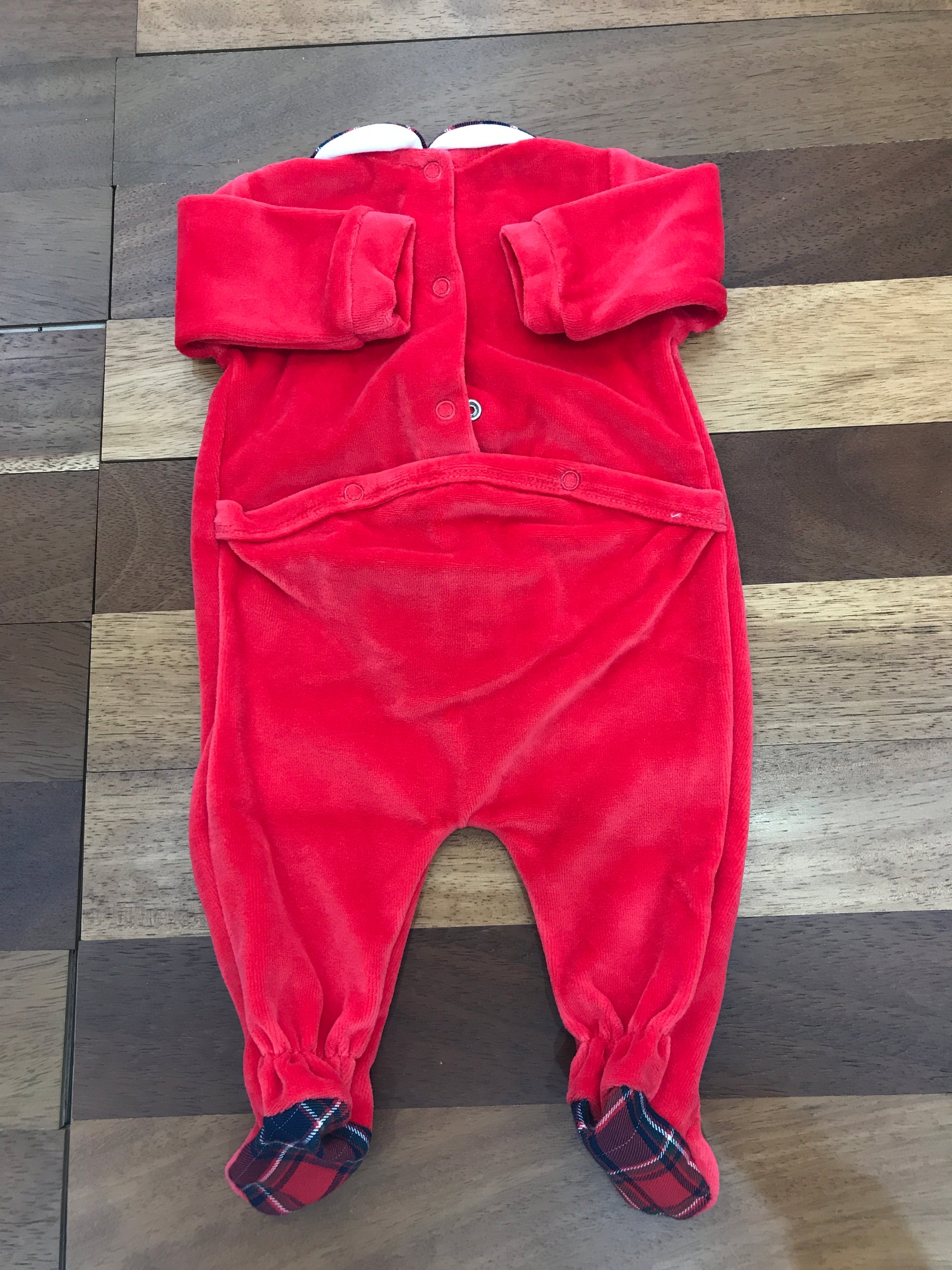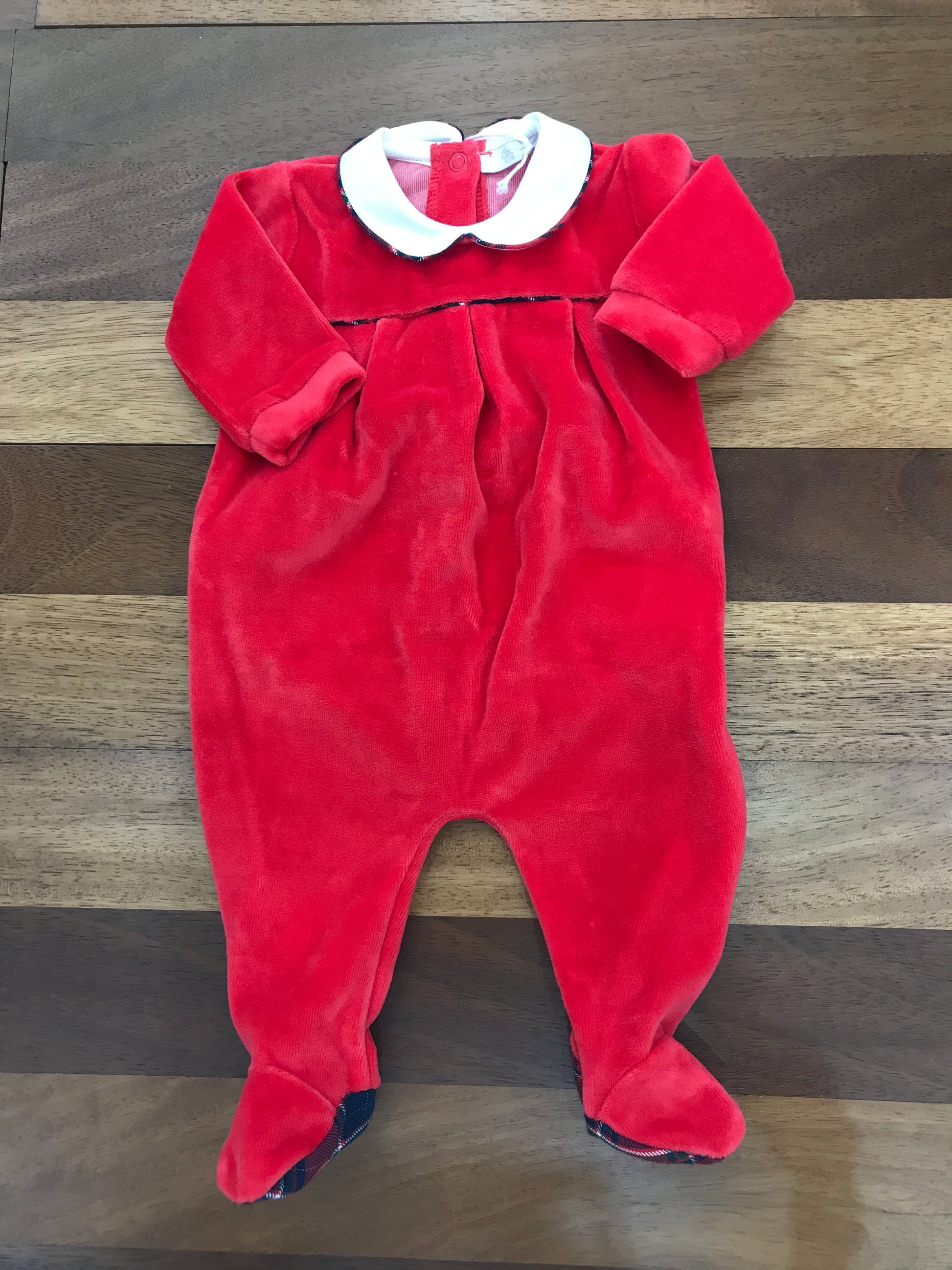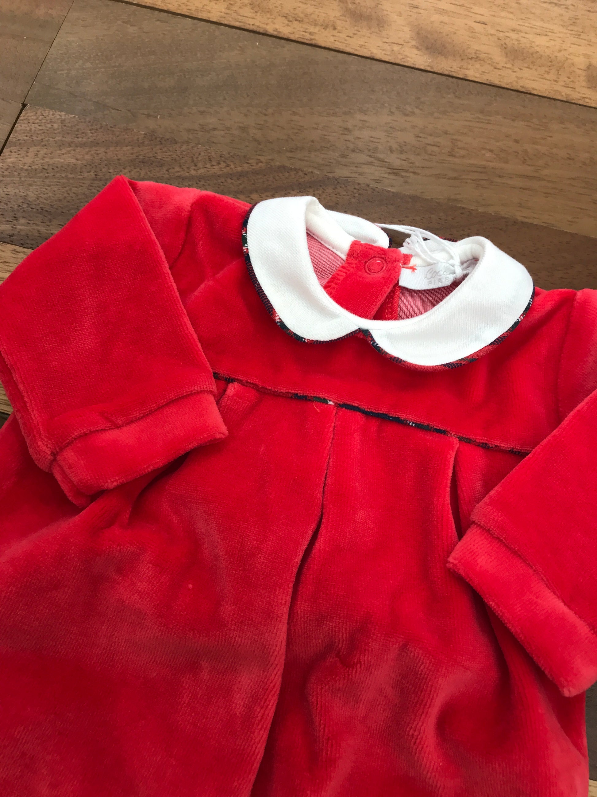 Raffinata tutina intera in morbida ciniglia rossa, impreziosita da un elegante colletto bianco e dettagli tartan che caratterizzano sia il profilo che i piedini. Gli accenti scozzesi distribuiti strategicamente sul fronte conferiscono un tocco di sofisticatezza classica a questo capo versatile e confortevole per i più piccoli.