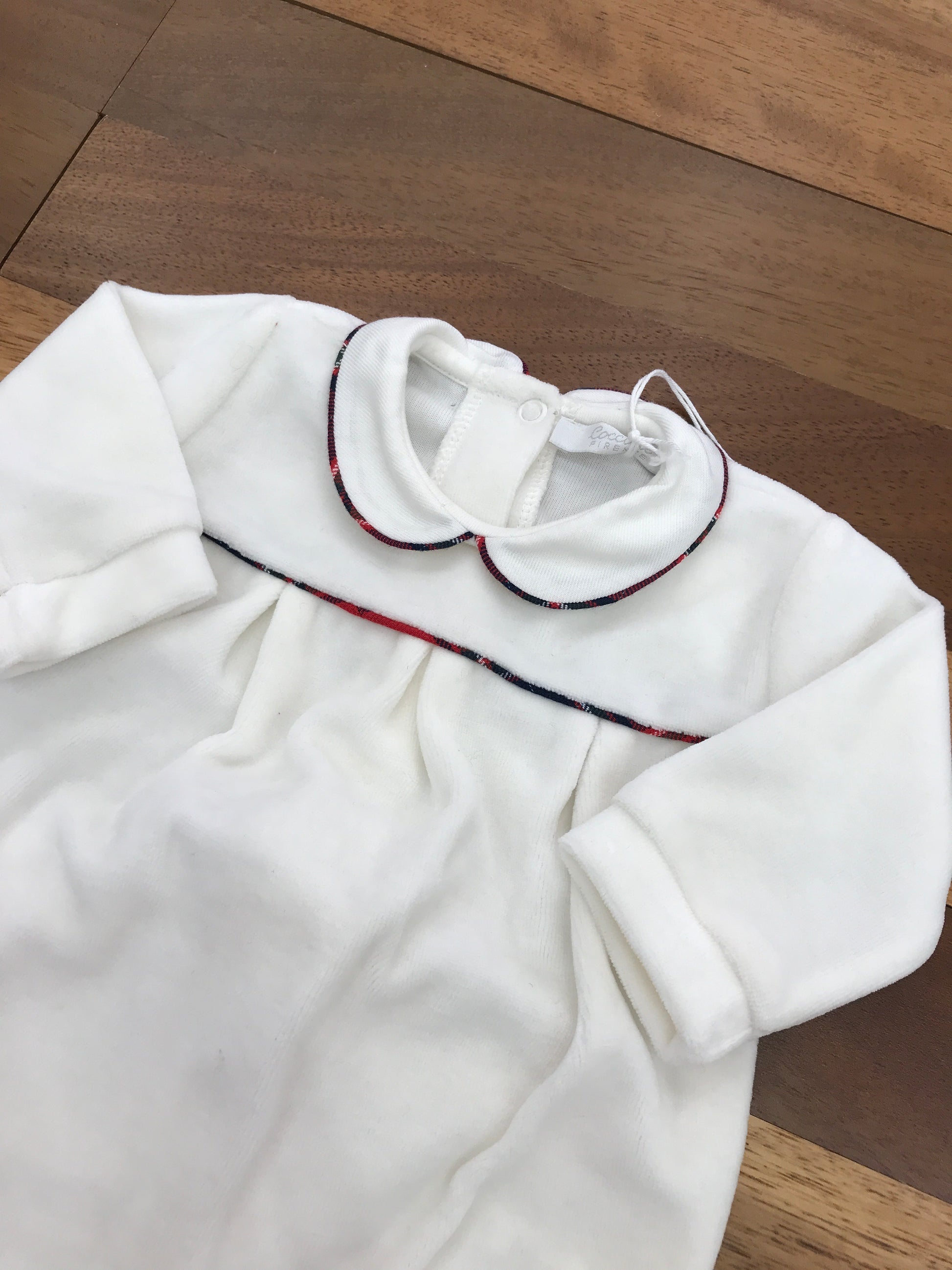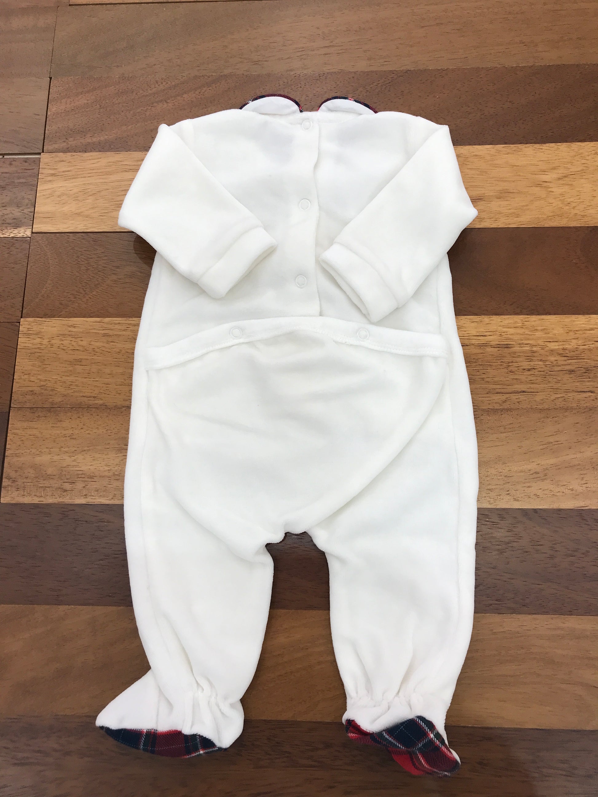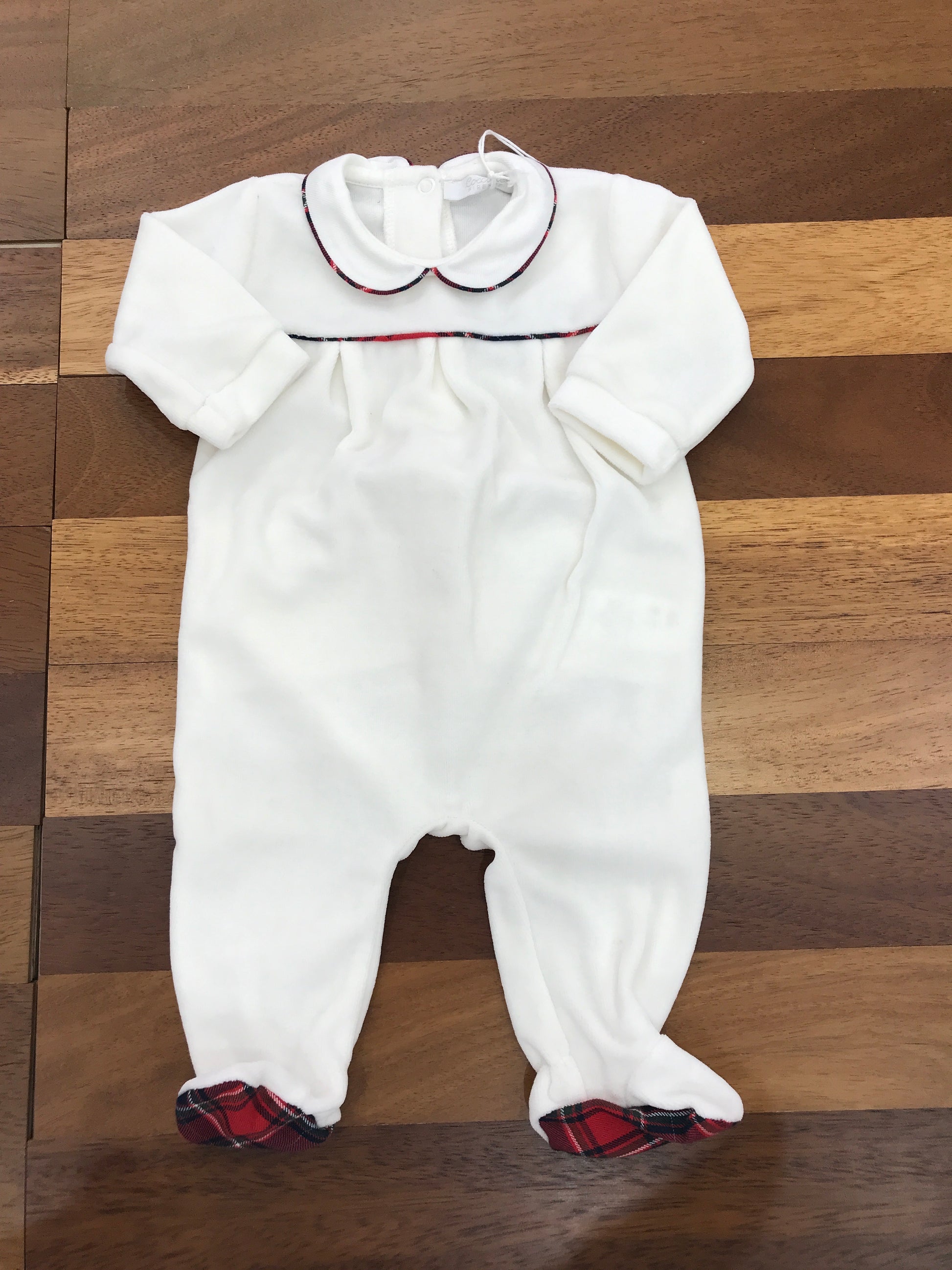 Raffinata tutina intera in morbida ciniglia bianca, caratterizzata da un elegante colletto con profilo scozzese e piedini coordinati. I dettagli scozzesi centrali completano il design, creando un capo versatile e sofisticato per i più piccoli. Perfetto per occasioni speciali o per l'uso quotidiano, combina comfort e stile con una qualità costruttiva superiore.
