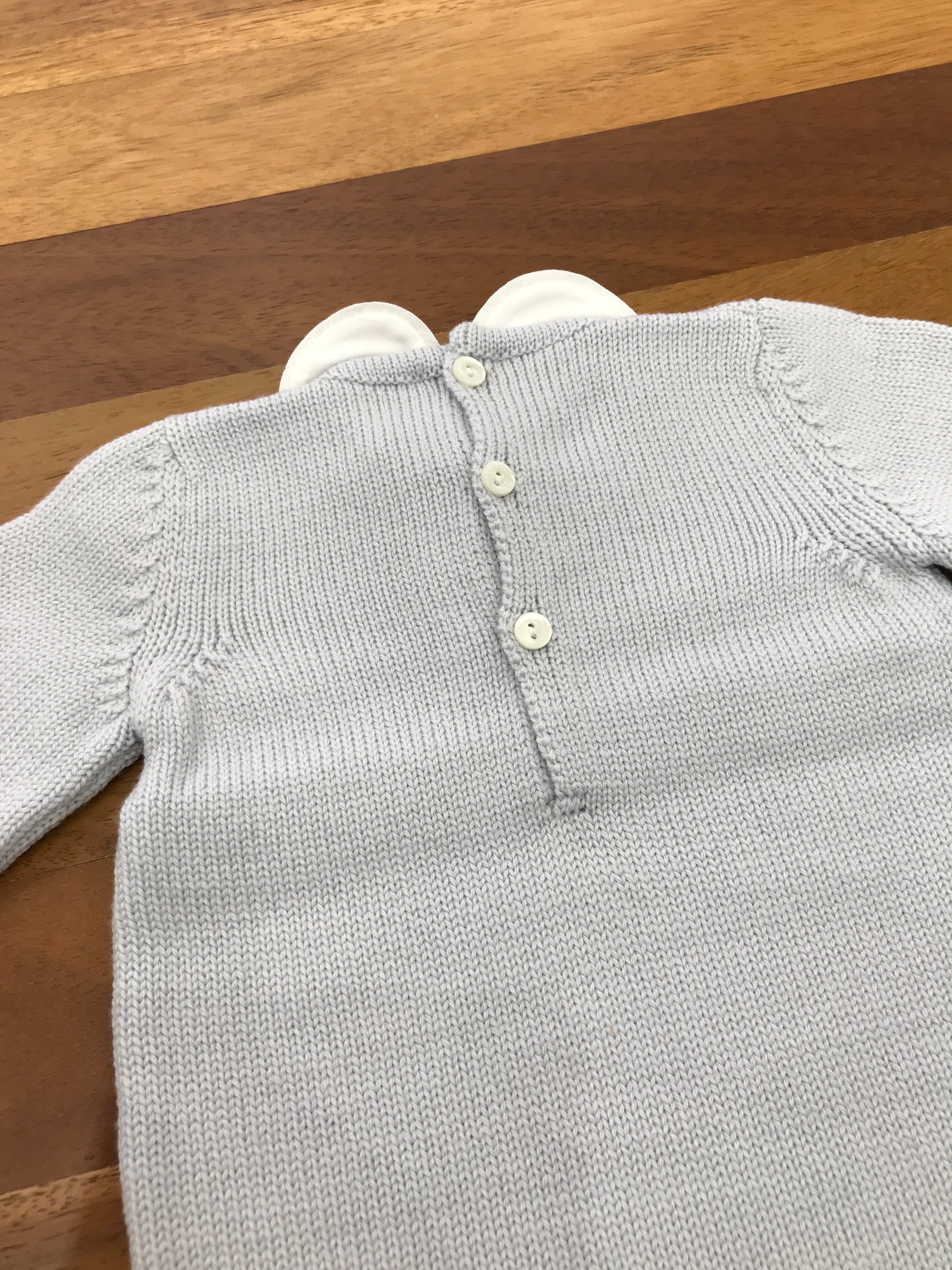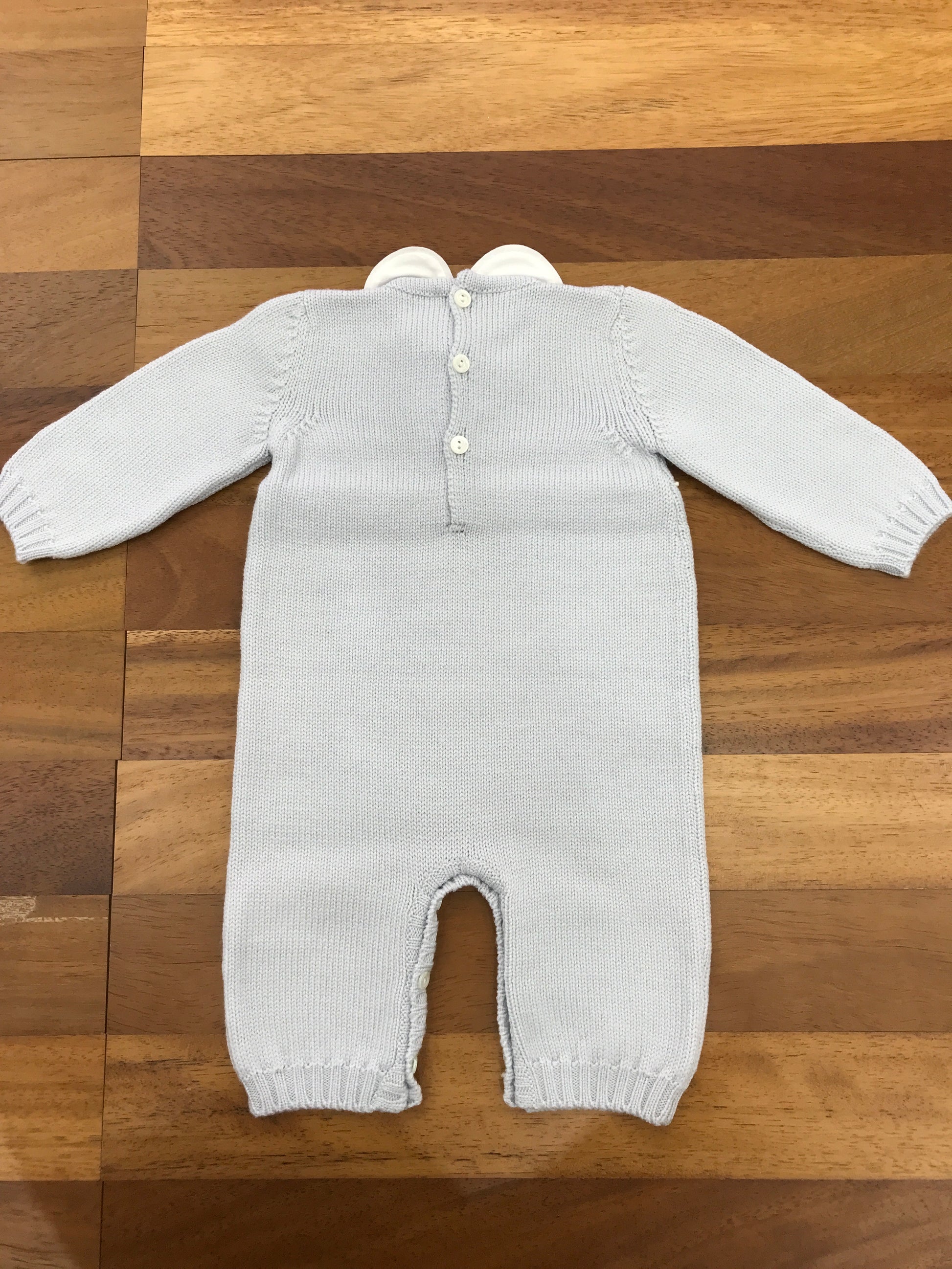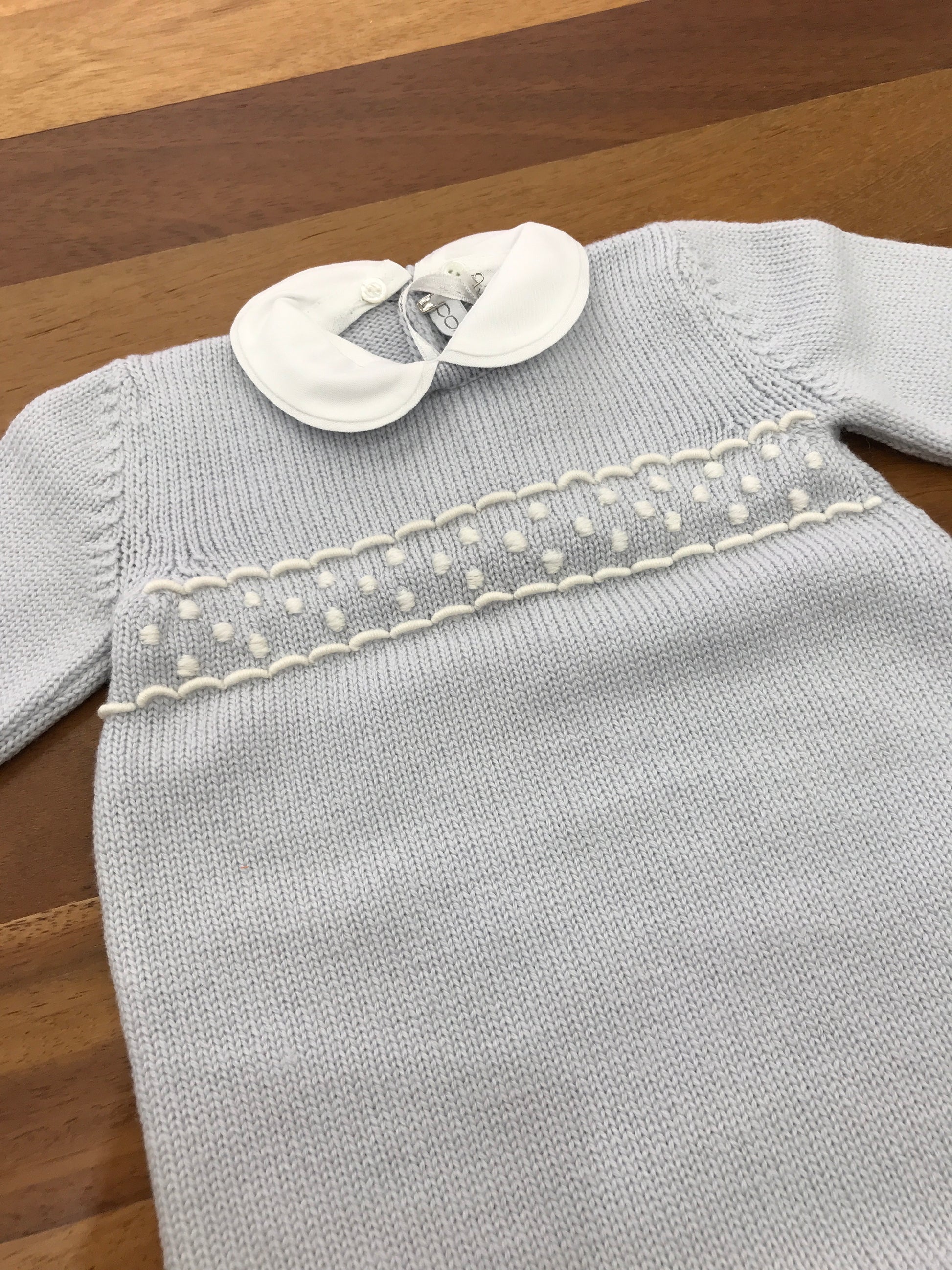 Questa tutina intera senza piedini presenta un collo removibile sul corpetto e si distingue per un raffinato lavoro artigianale con tratteggi e pois.