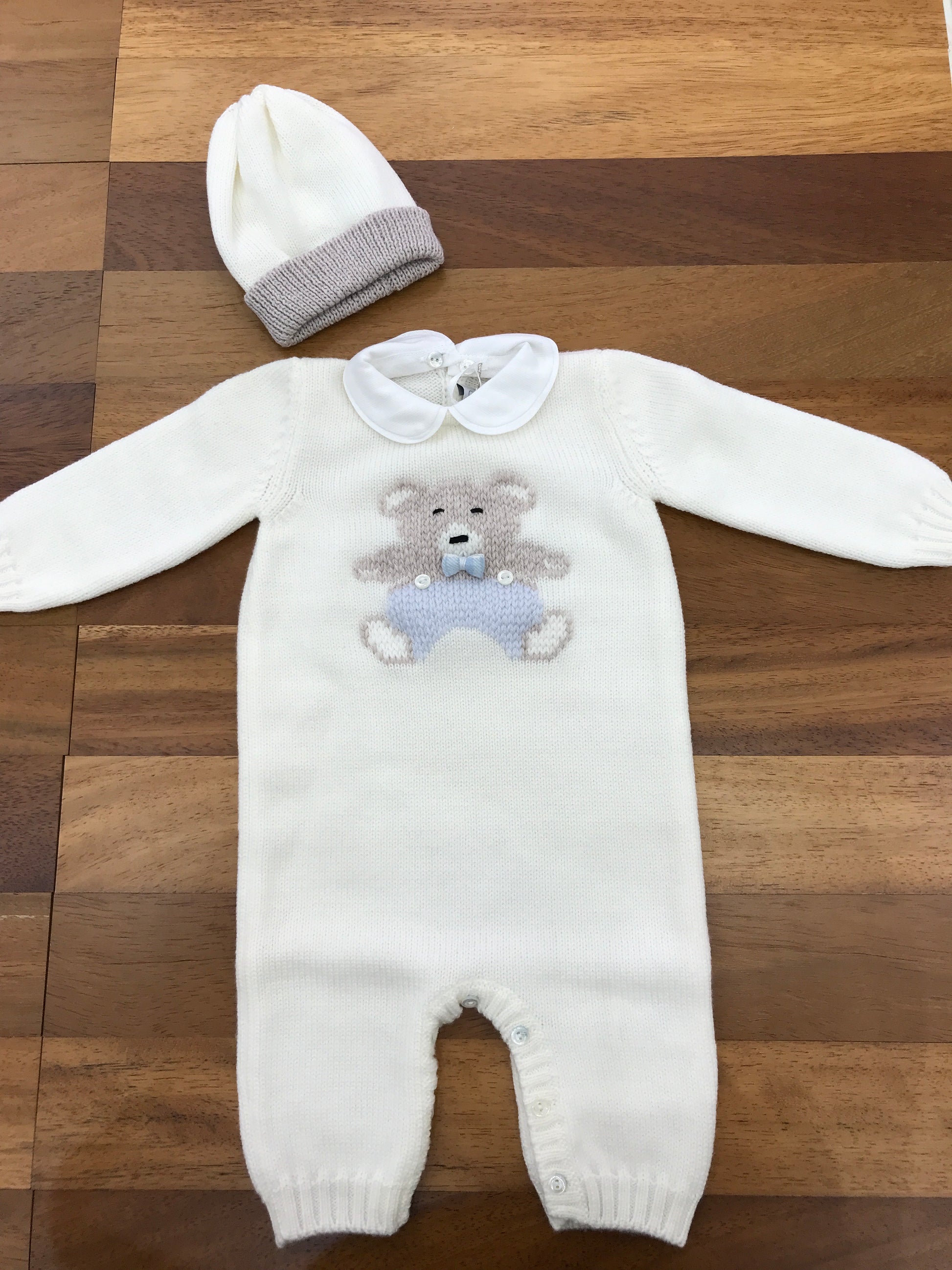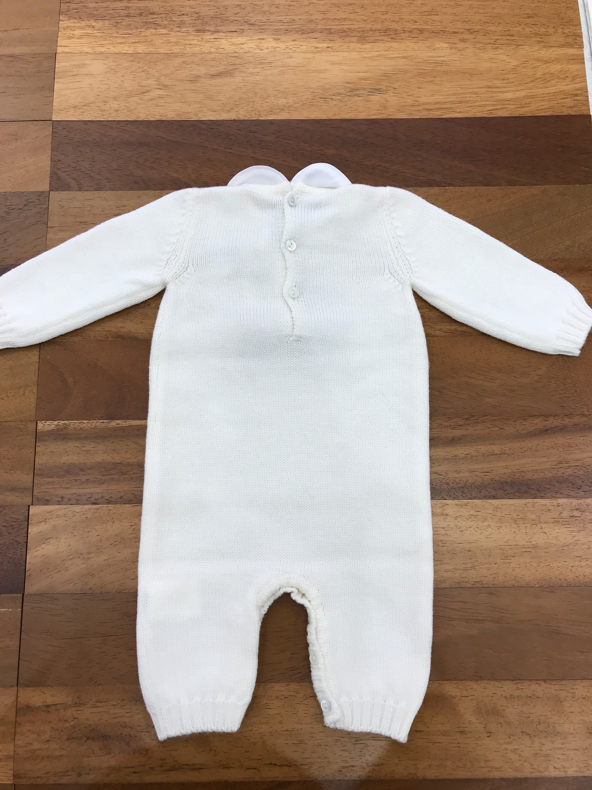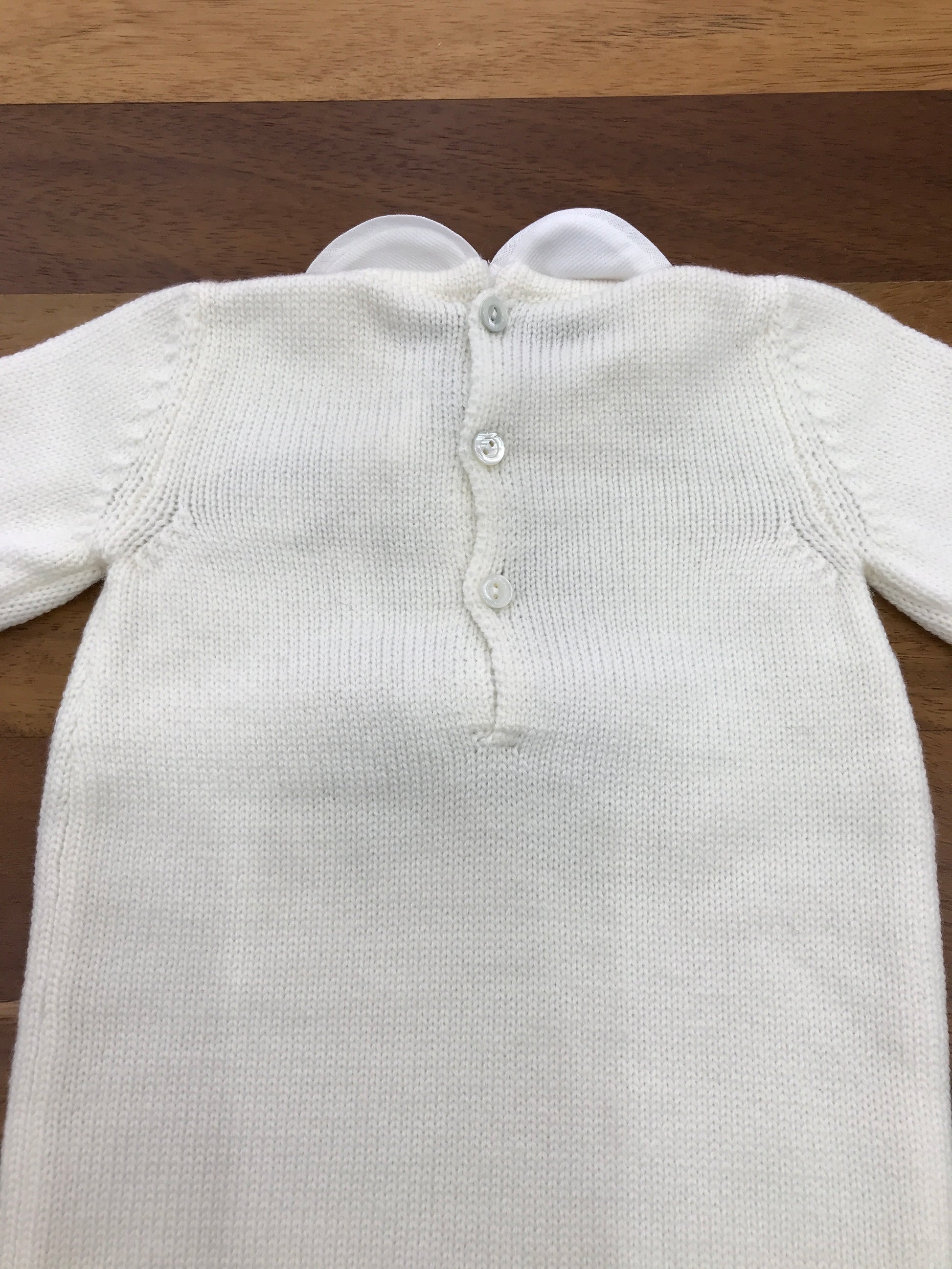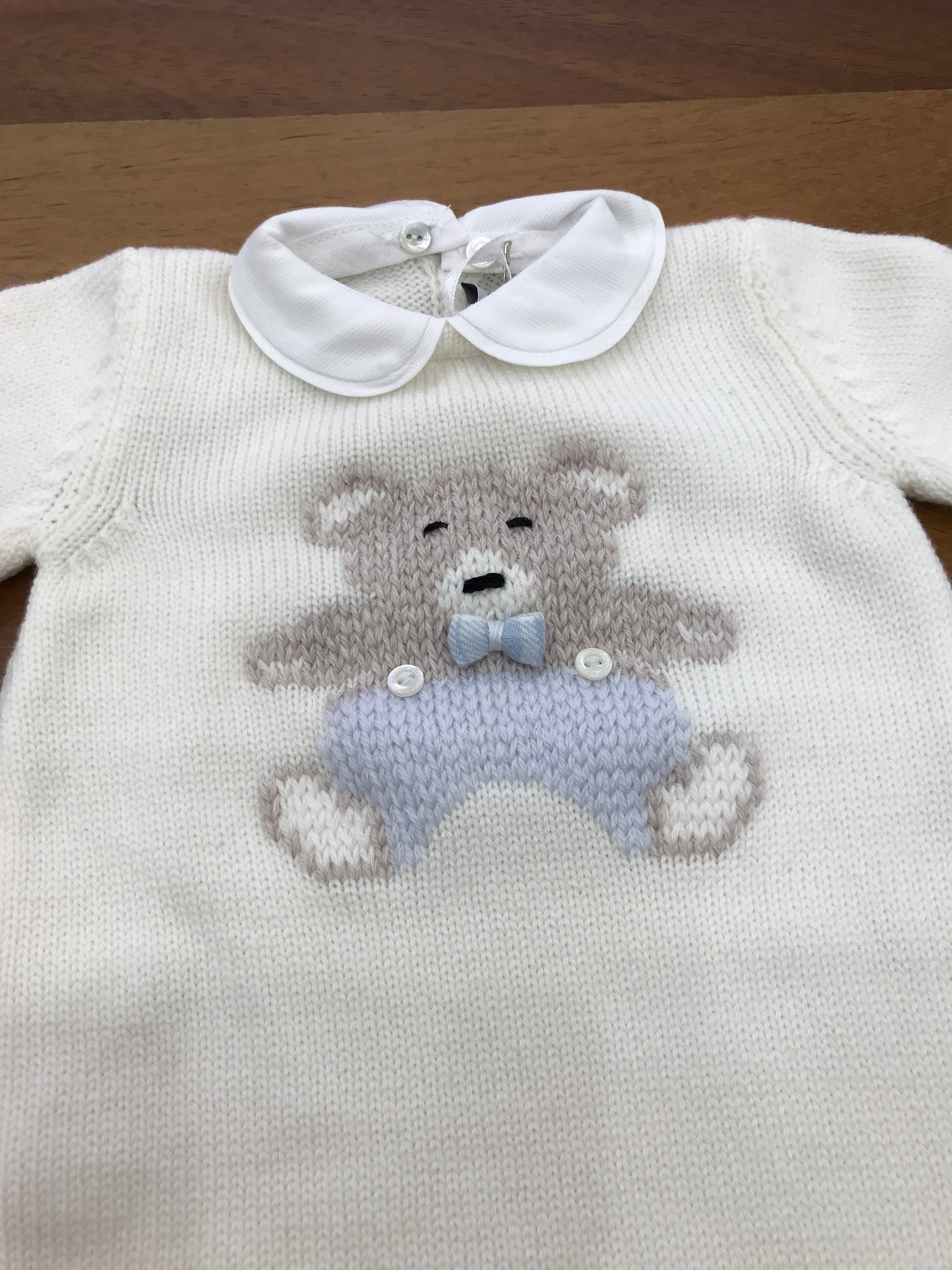 Questa tutina completa senza piedini è dotata di un colletto removibile e decorata con un orsetto ricamato a mano, che ne valorizza l’eleganza e la cura artigianale.