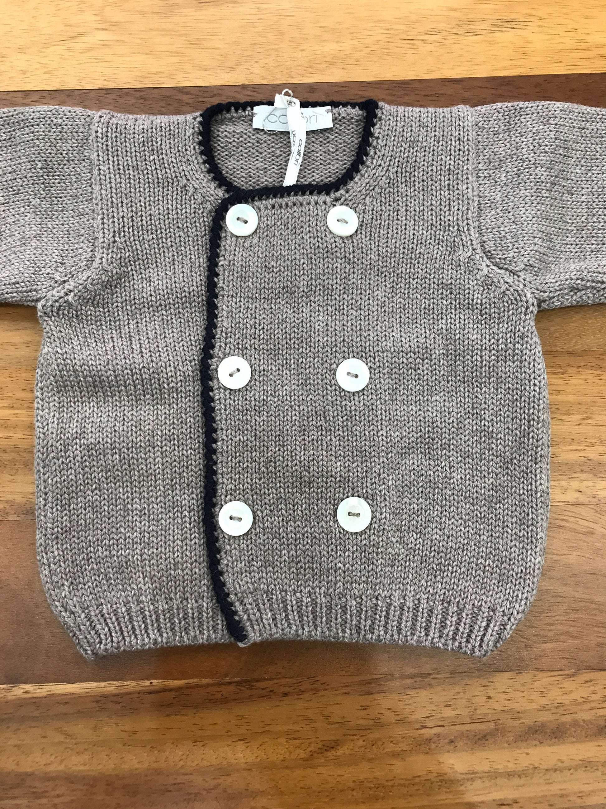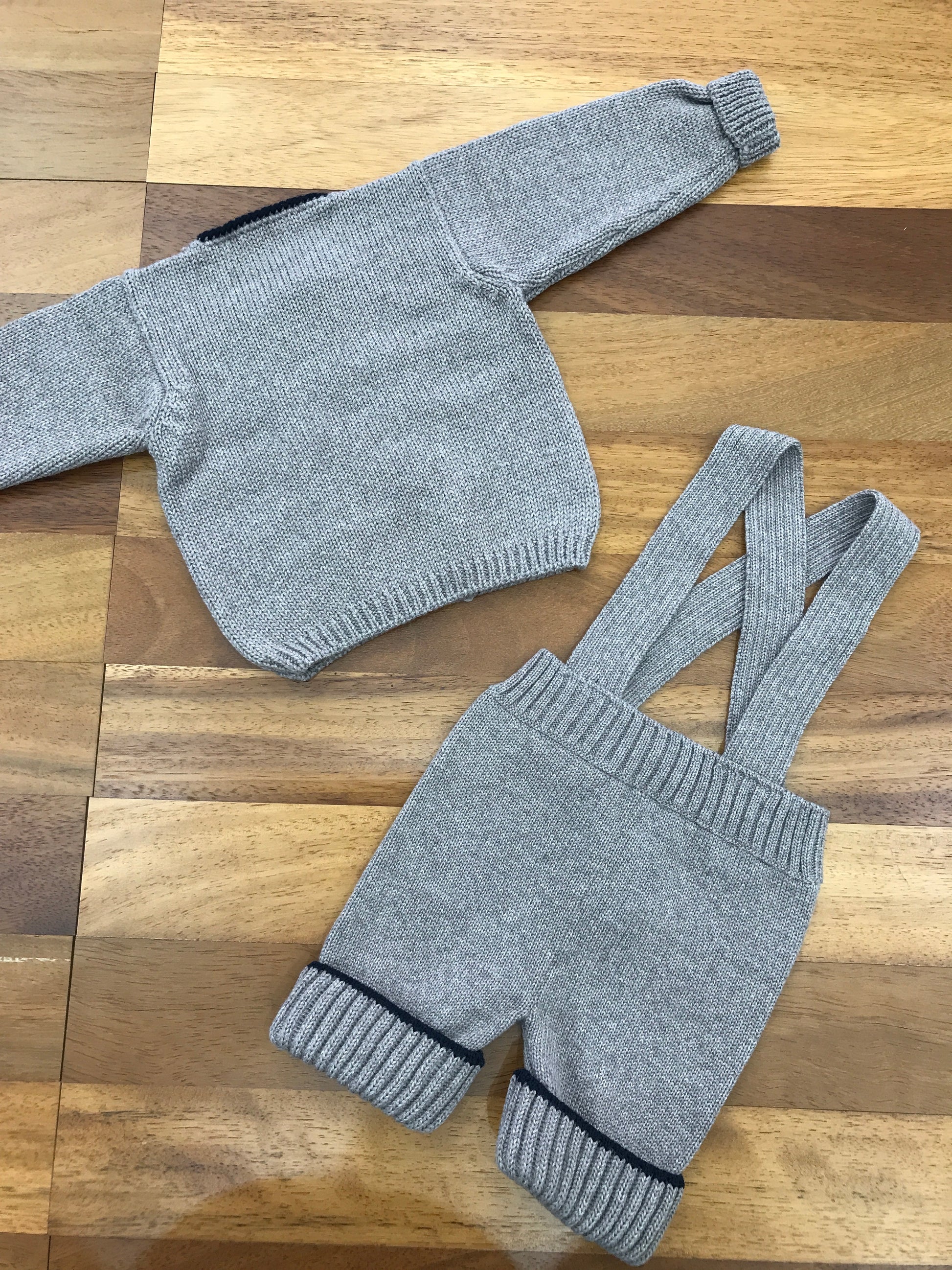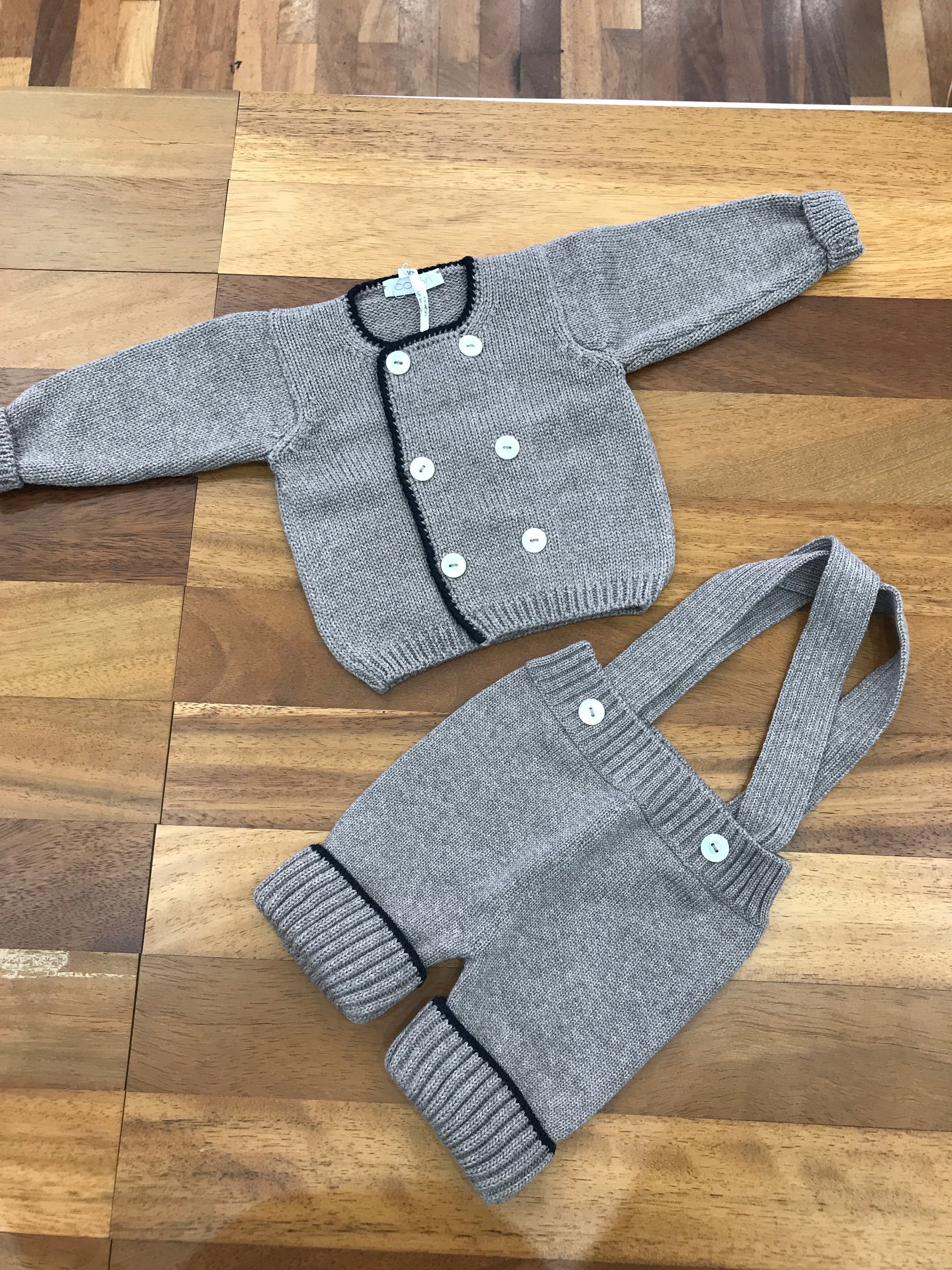 Completo Colibrì composto da cardigan doppiopetto e pantaloni in lana bicolore, rifiniti con bottoni in madreperla.