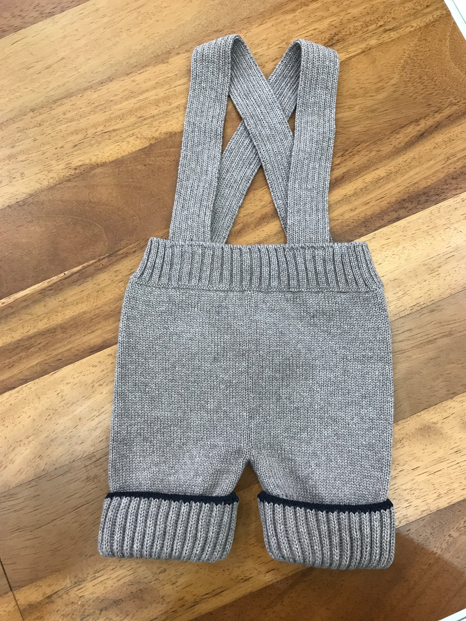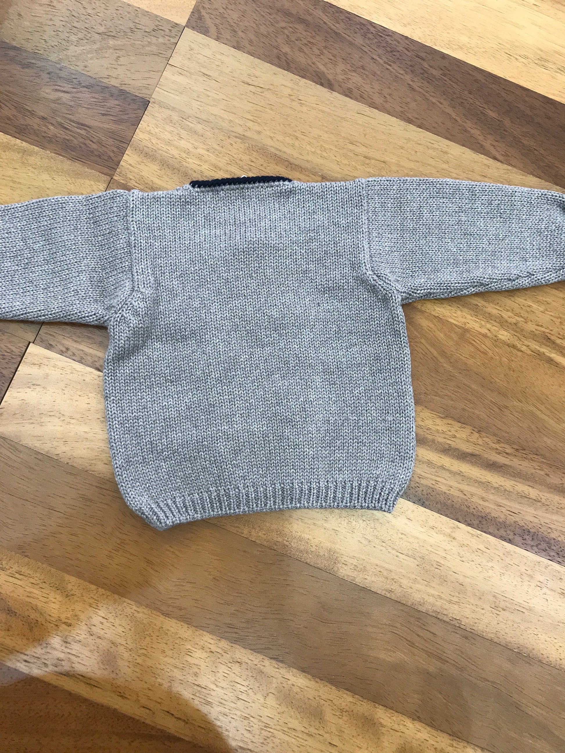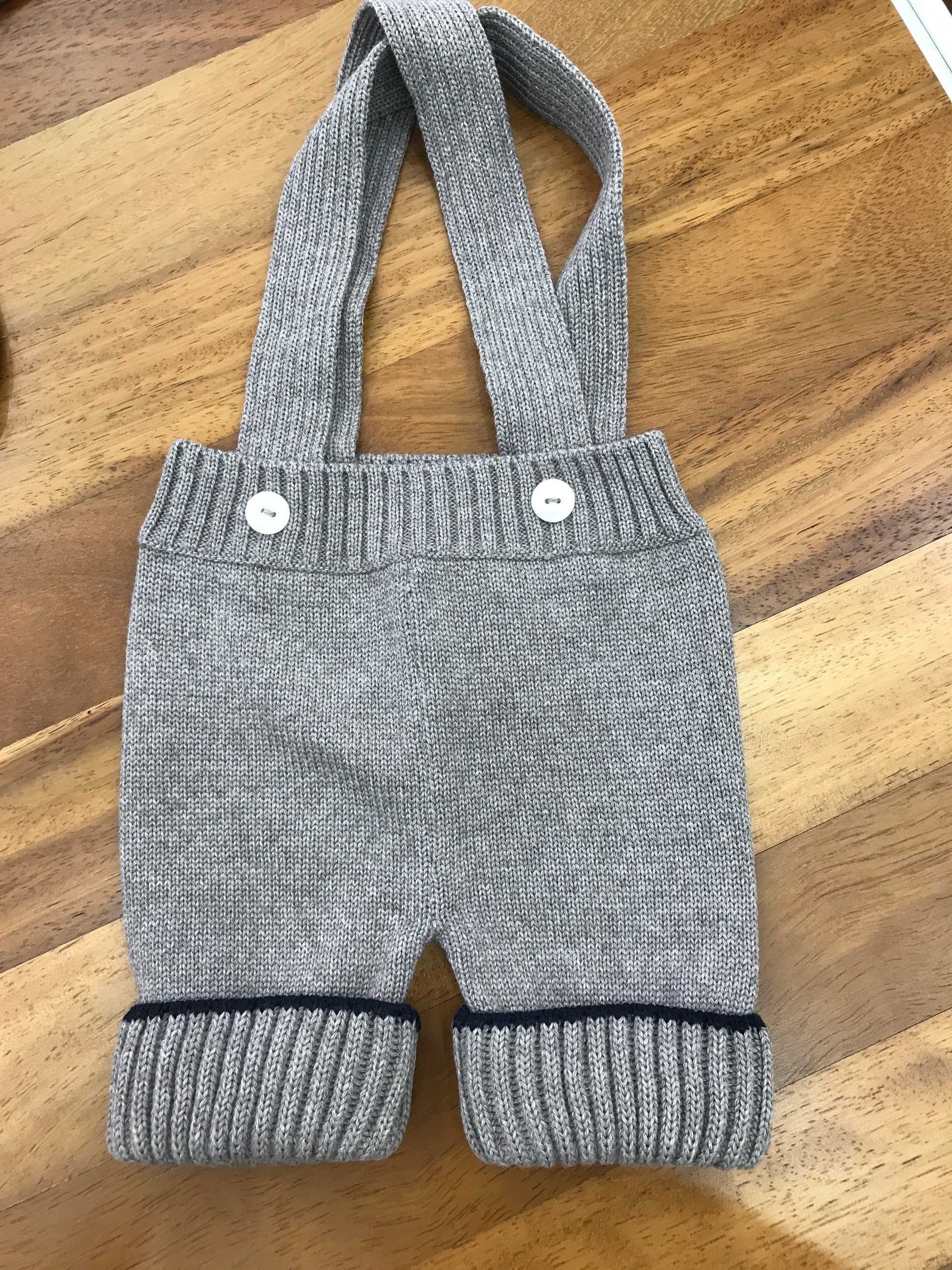 Completo Colibrì composto da cardigan doppiopetto e pantaloni in lana bicolore, rifiniti con bottoni in madreperla.