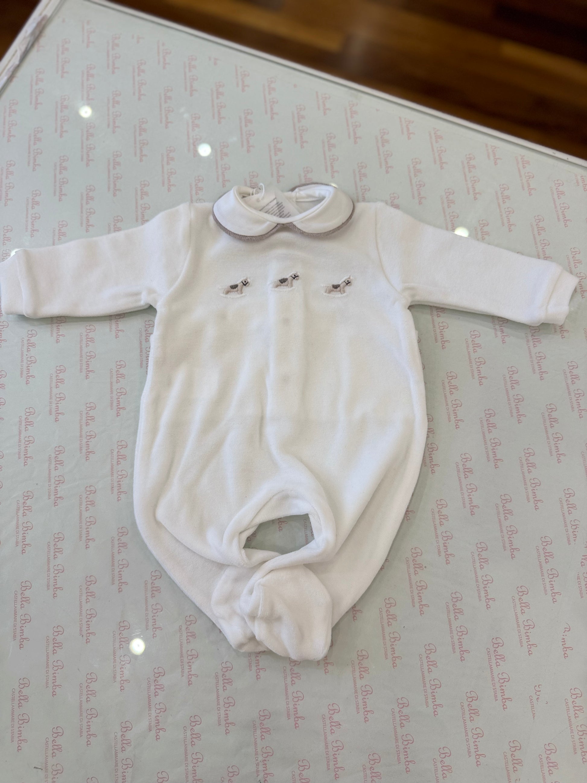 Introduci il tuo bambino al mondo dei cavalli con la tutina Colibrì in morbida ciniglia. Il ricamo a mano dei due cavalli centrali lo renderà sicuramente unico. Realizzata con cura per garantire il massimo comfort del tuo bambino, questa tutina è perfetta per ogni occasione.