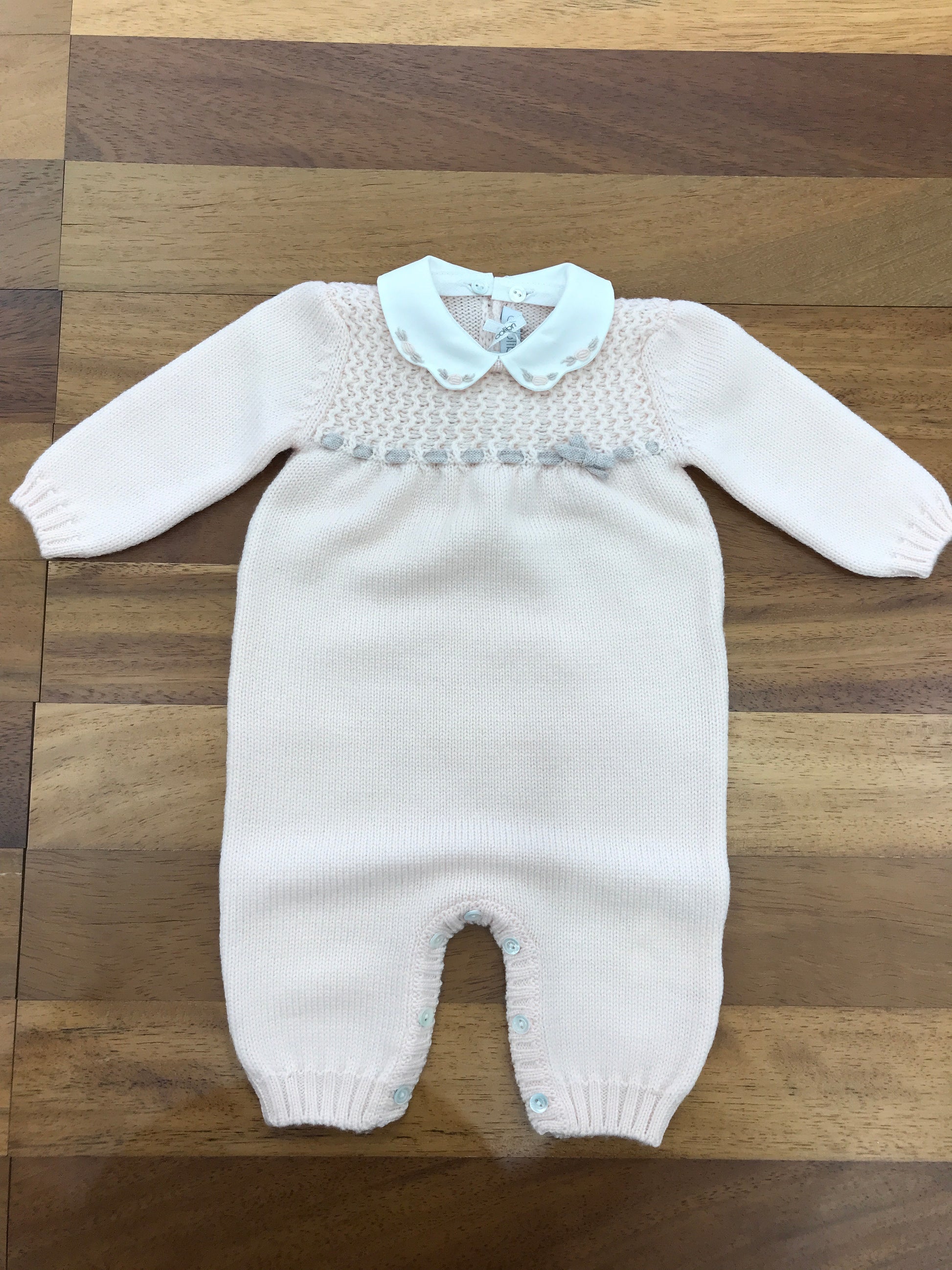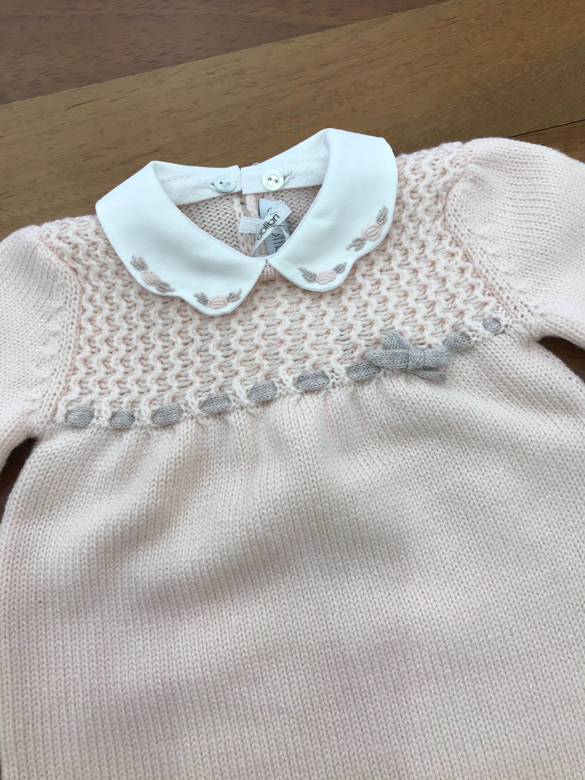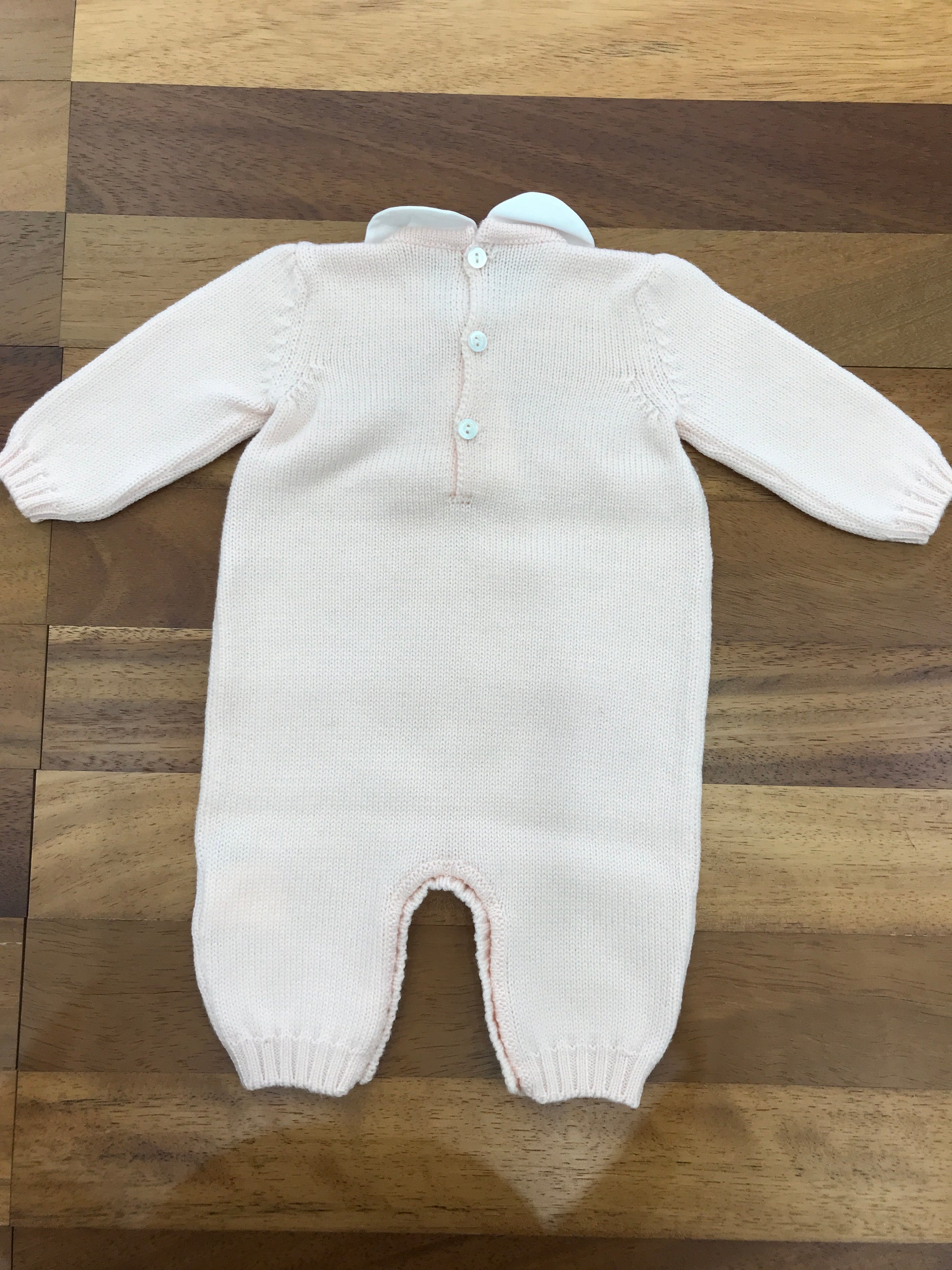 Intera tutina senza piedini, dotata di collo removibile, impreziosita da un ricamo frontale e un elegante fiocchetto decorativo.