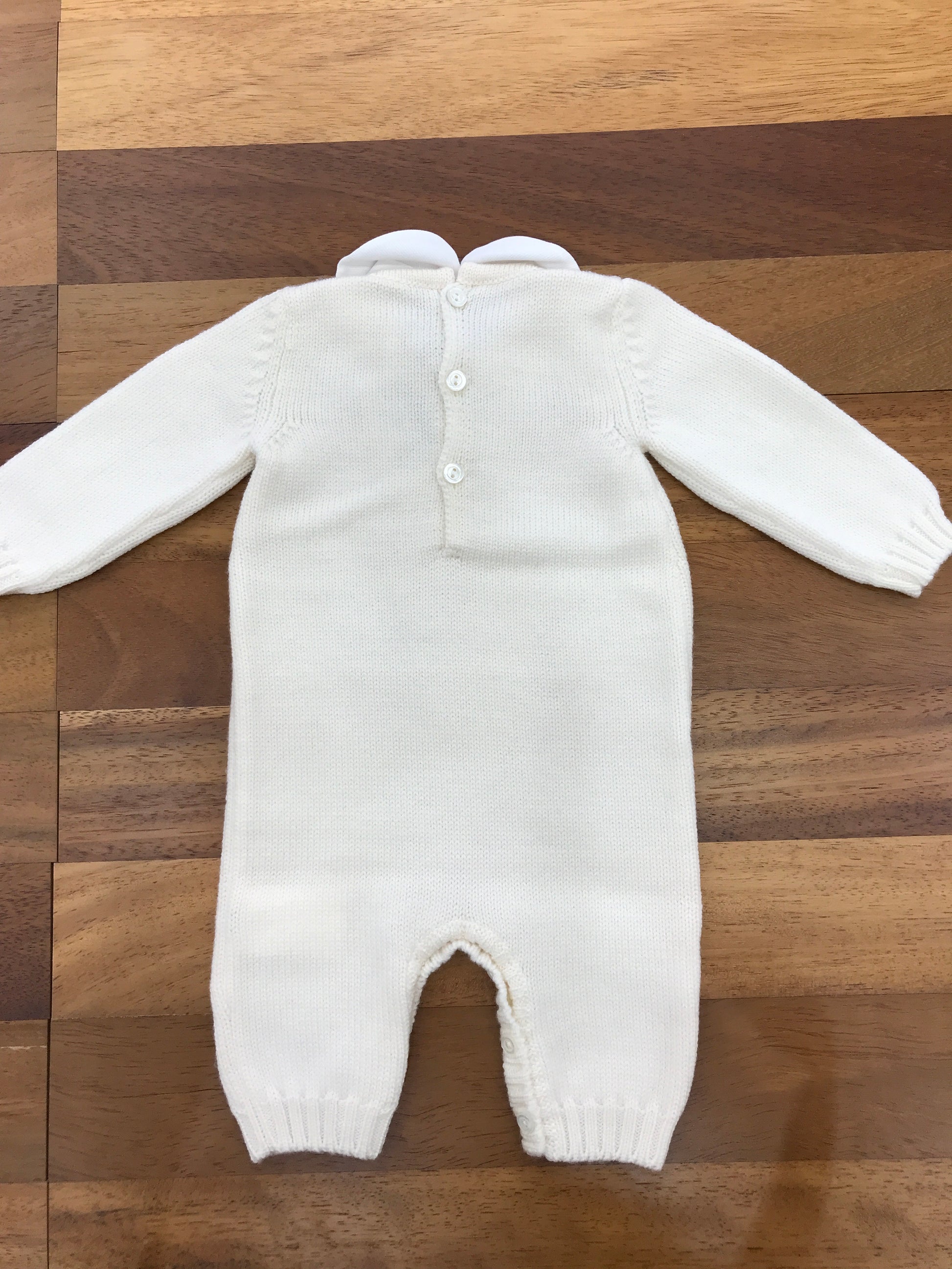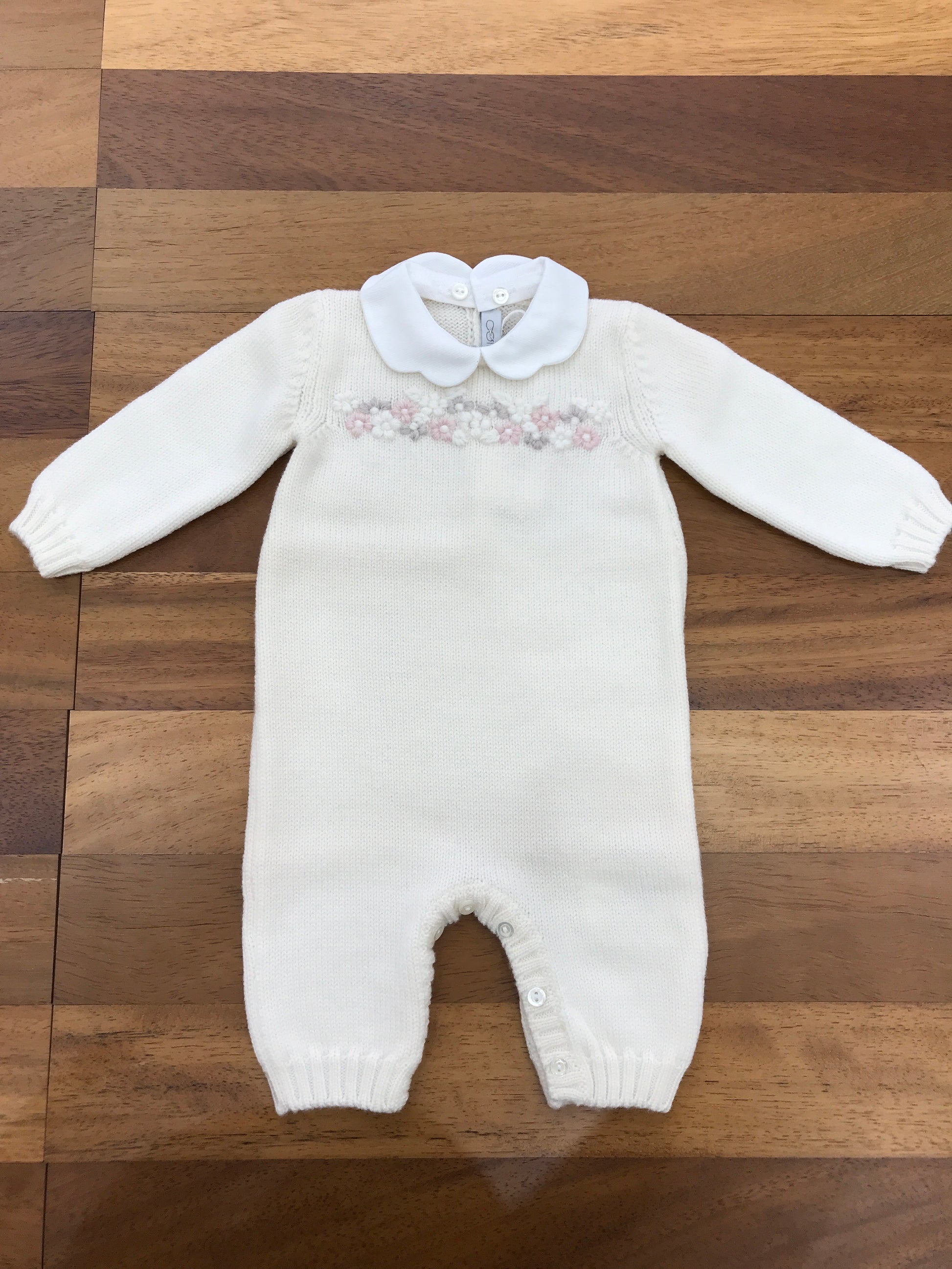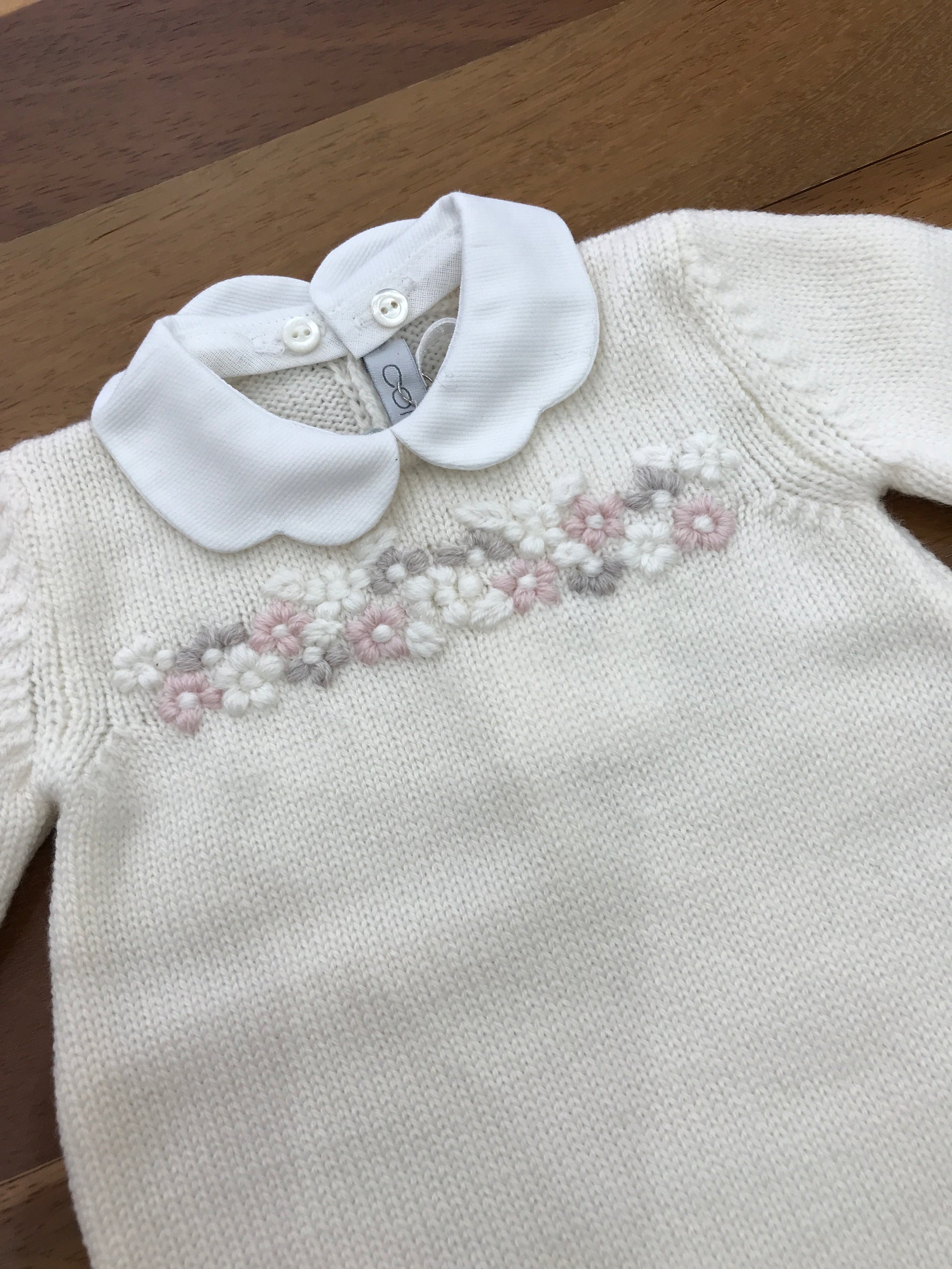 Questa tutina in lana presenta un collo rimovibile e non ha piedini, con delicati ricami floreali decorativi sul davanti.