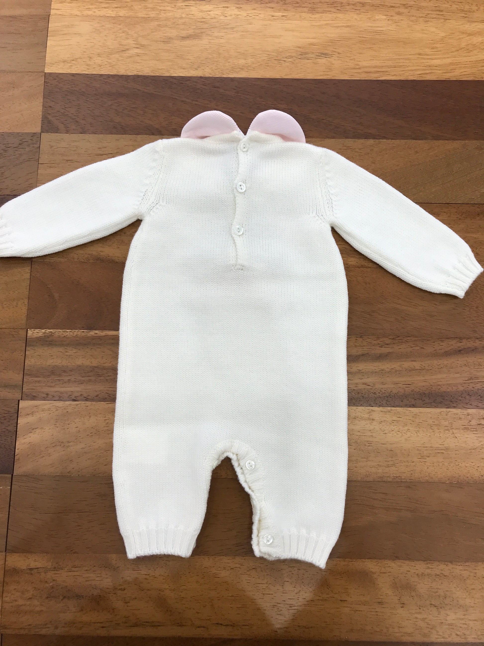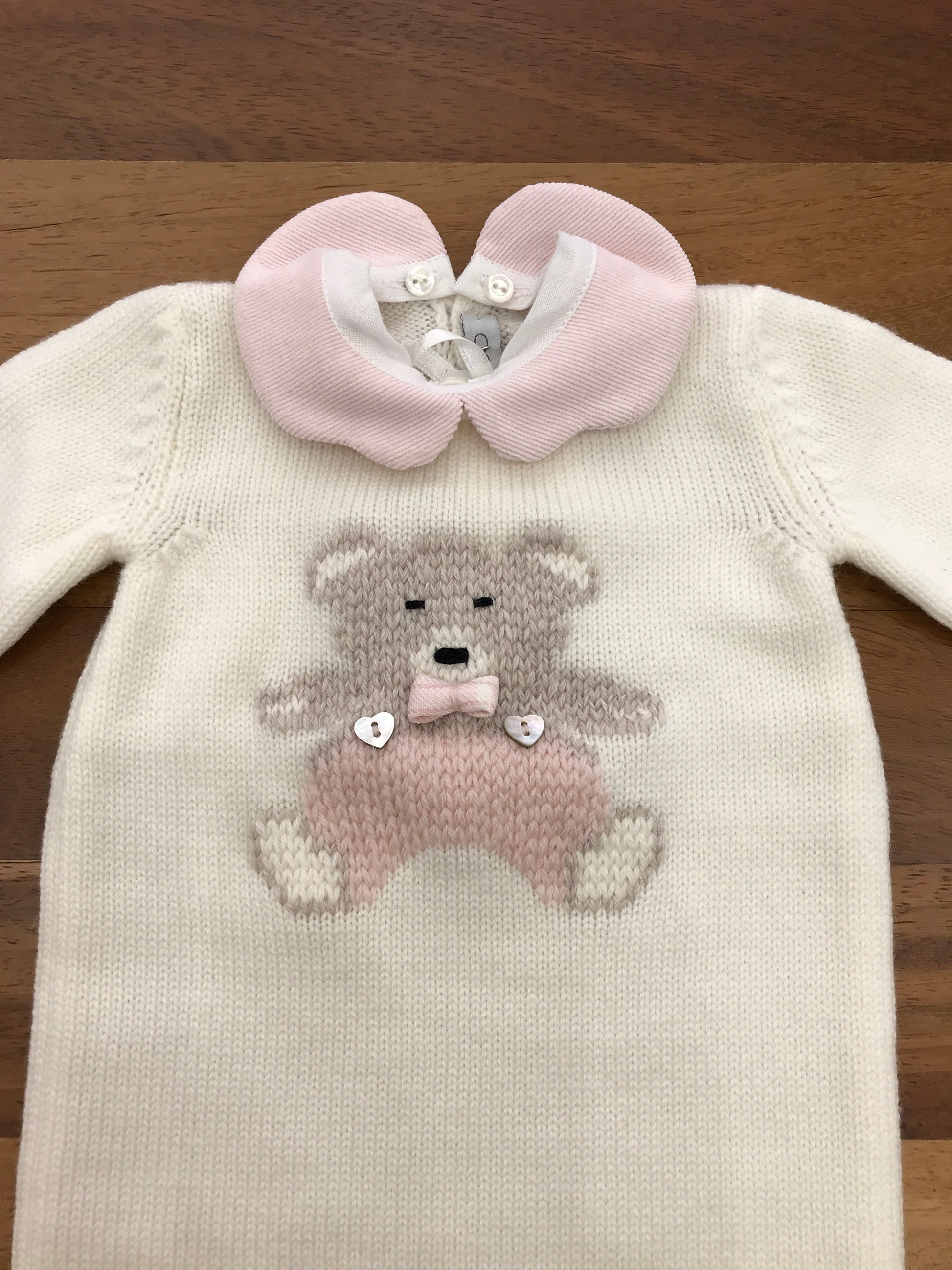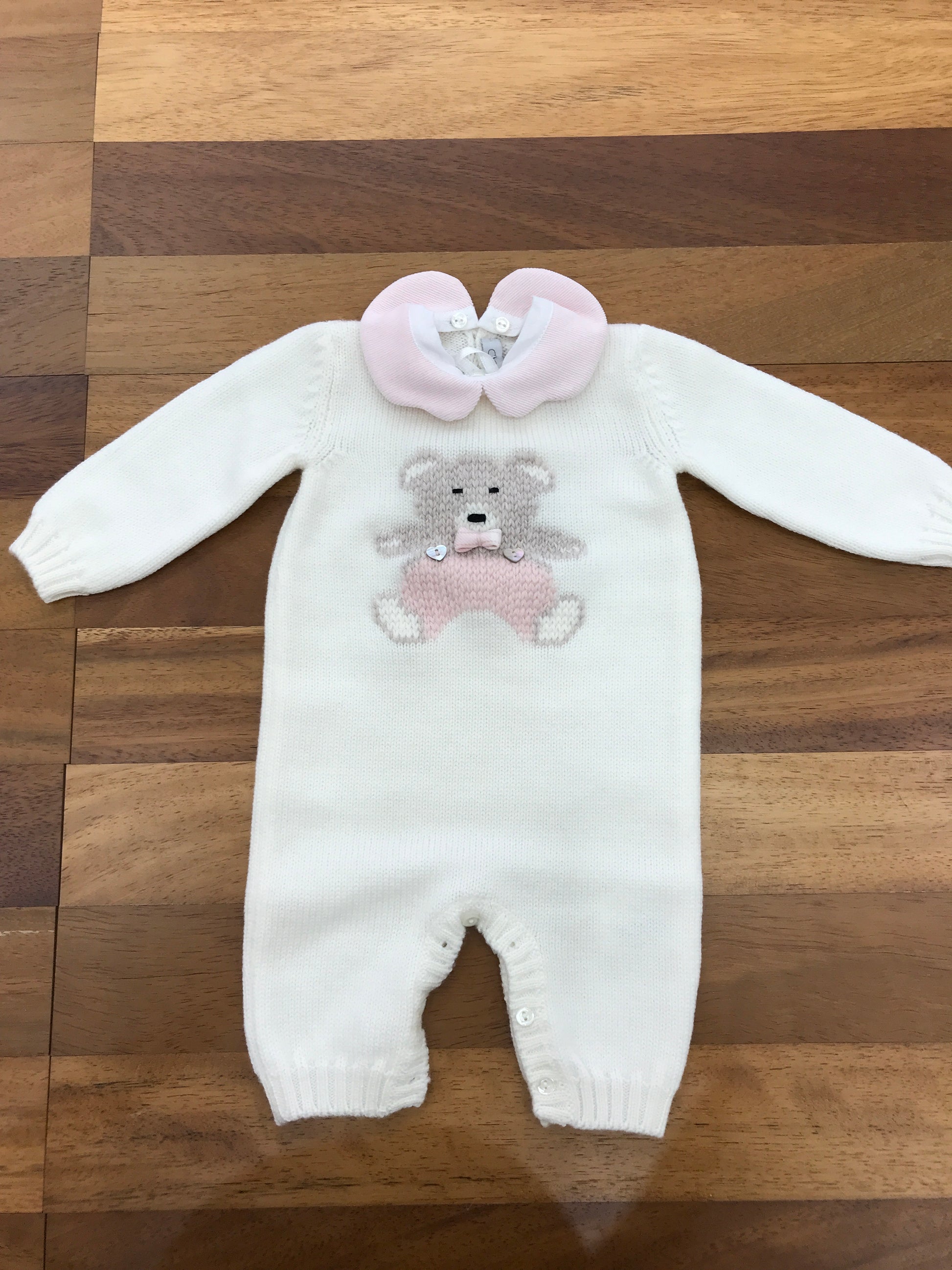 Questa tutina completa senza piedini è dotata di un collo rimovibile e presenta un ricamo di un orsetto sul davanti, arricchito da un delicato fiocchetto.