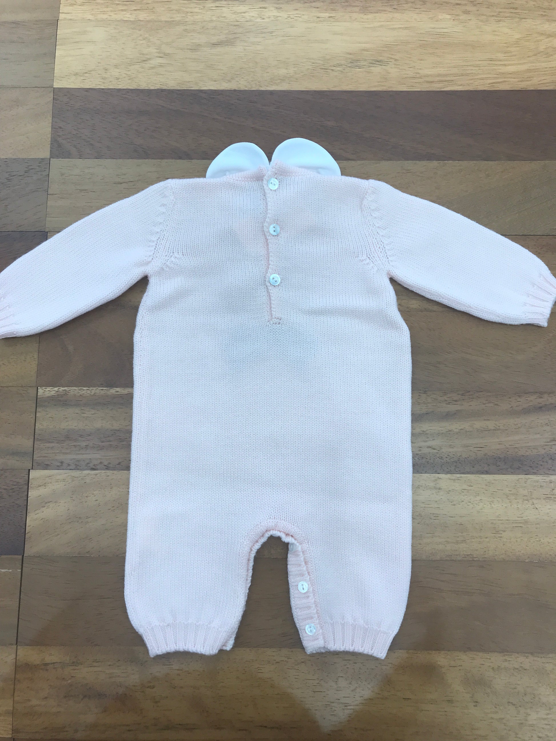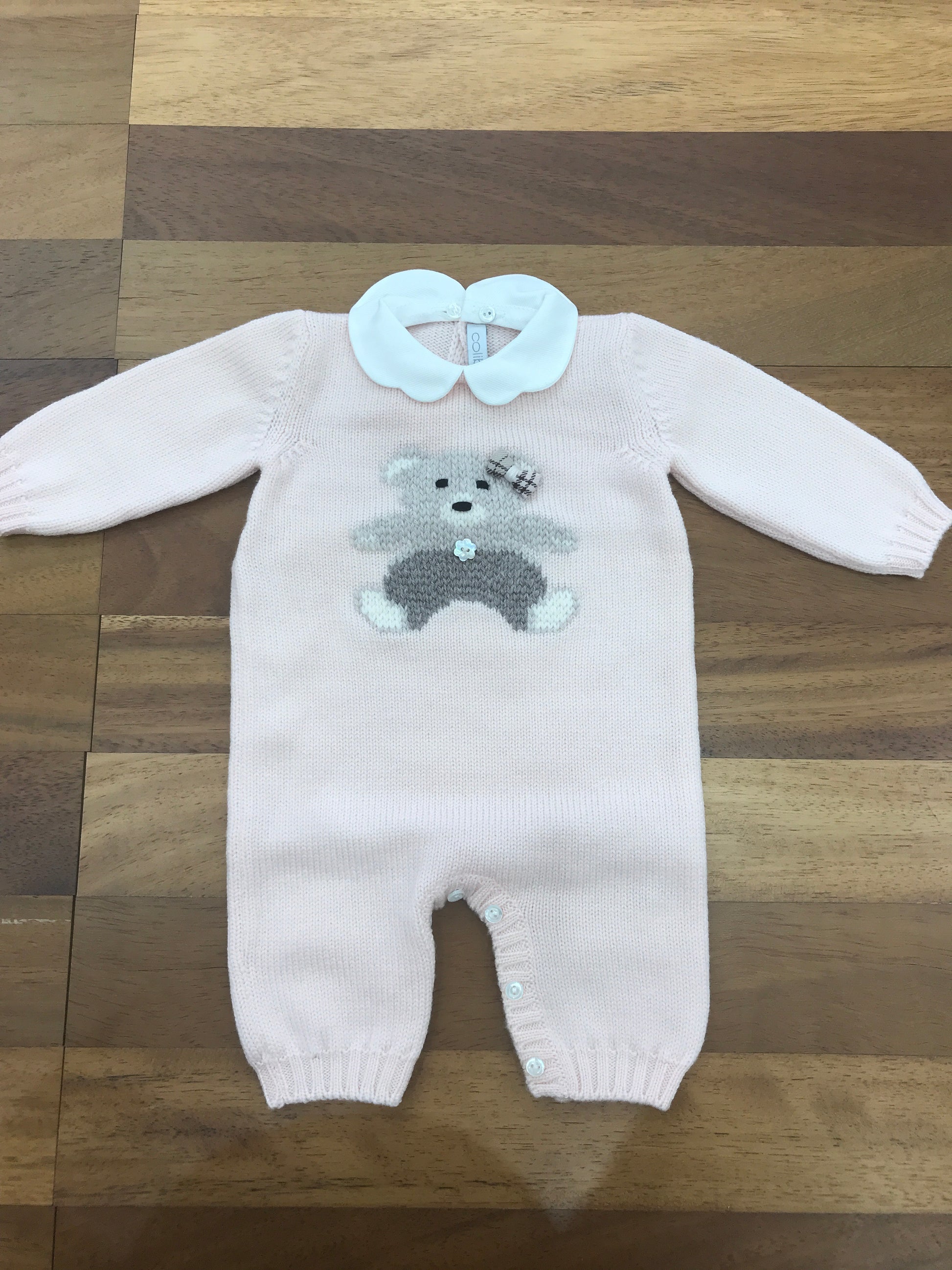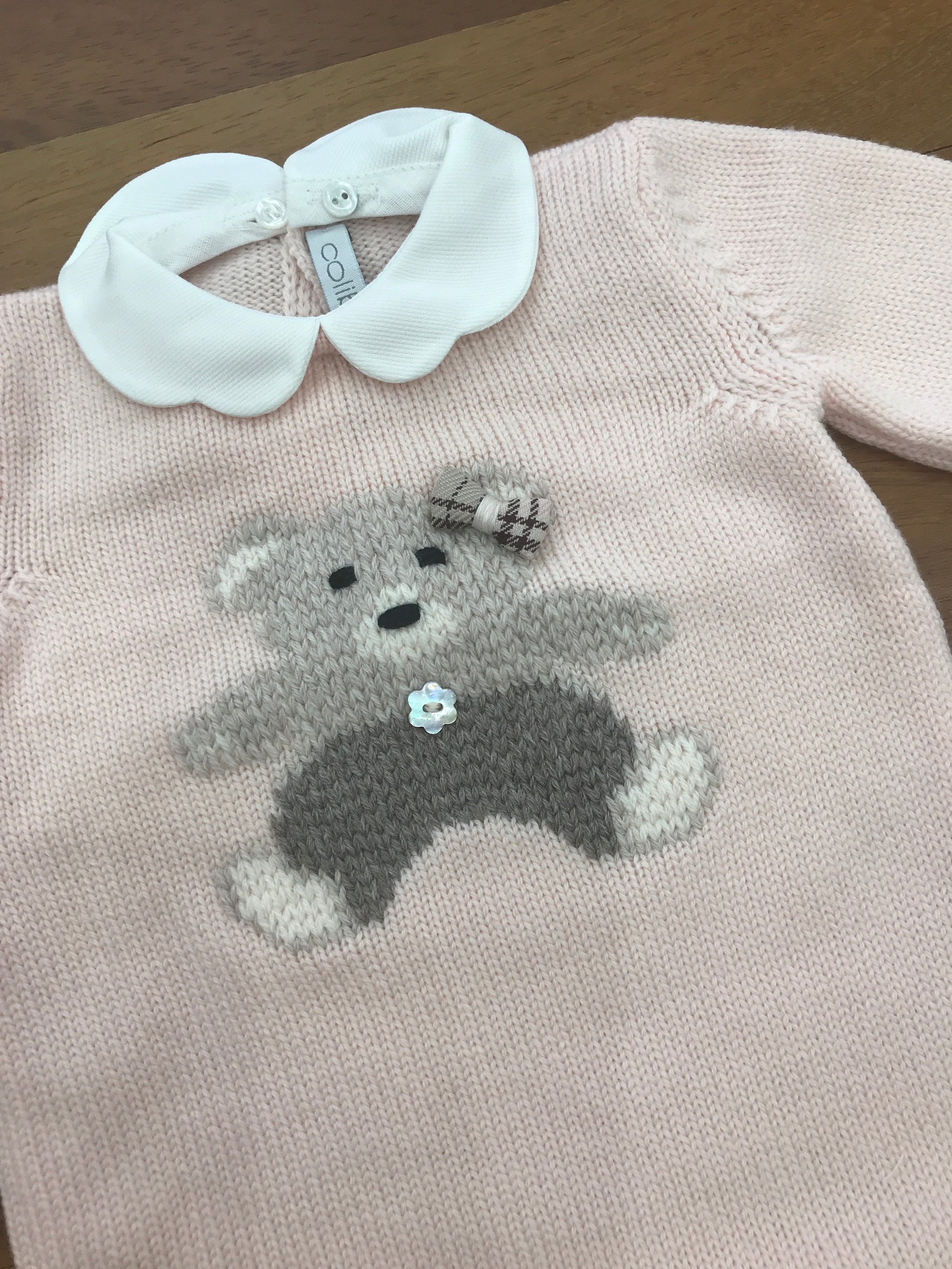 Questa tutina in lana, senza piedini, presenta un collo removibile e un delicato ricamo di orsetto sul davanti, unendo comfort e stile con attenzione ai dettagli.